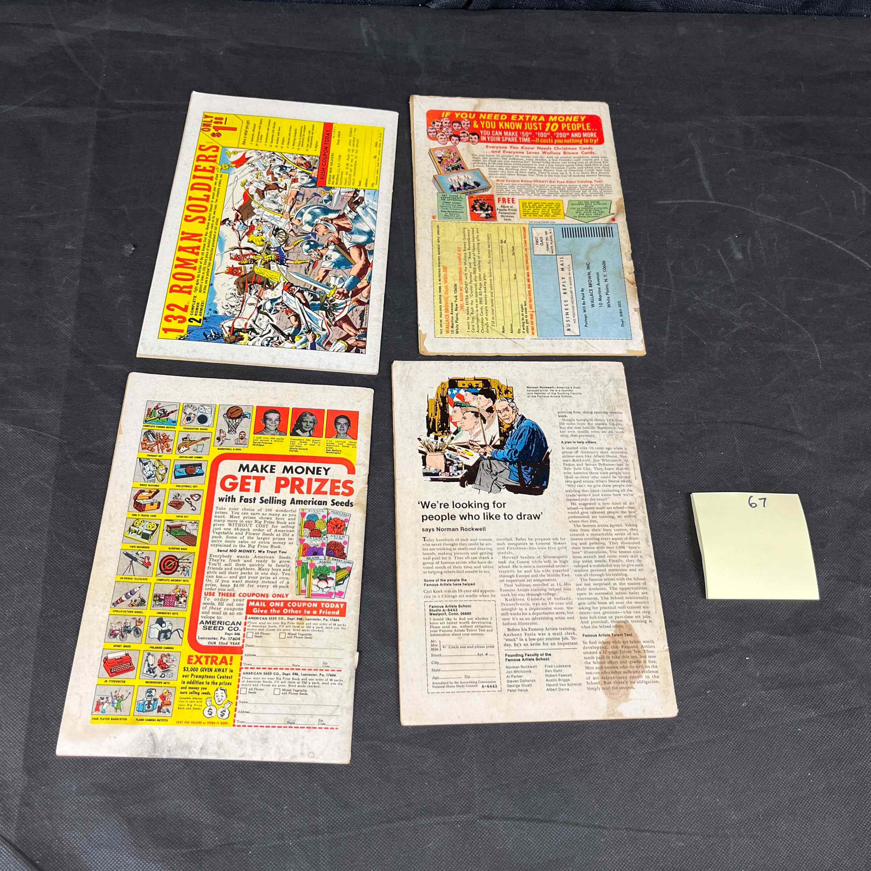 The comic books are in good, circulated condition, exhibiting typical signs of age and handling, including minor creasing, edge wear, and corner softening. A yellow sticky note marked \'67\' is visible on the bottom right comic and the surface next to it, likely an inventory or grading mark.