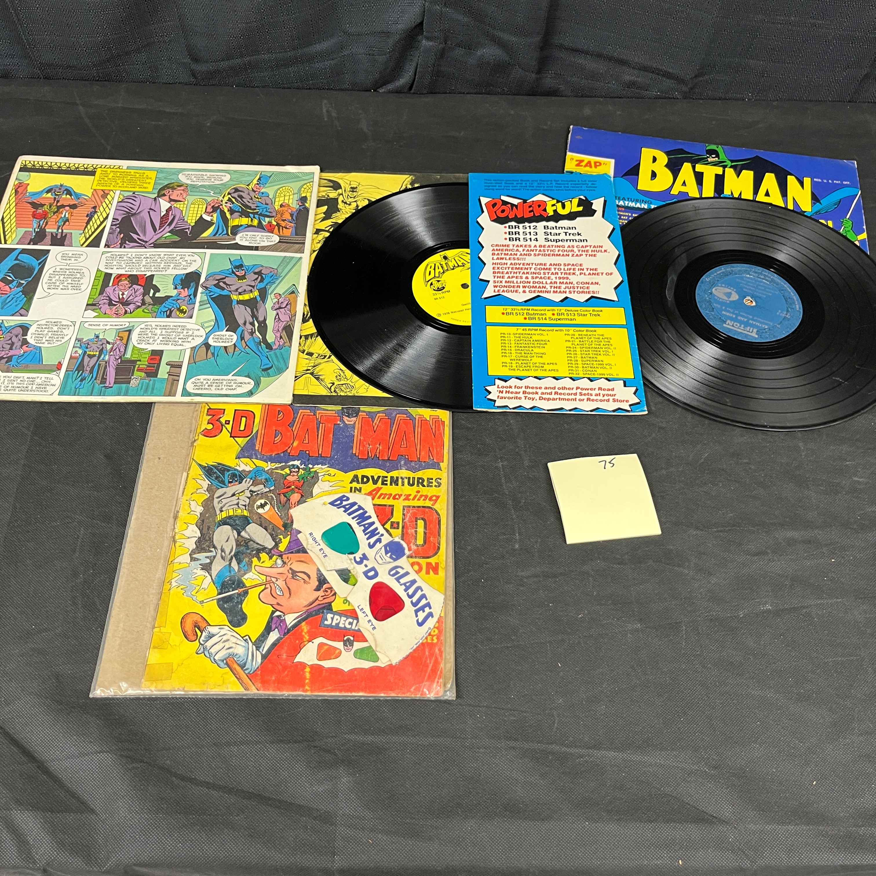 The \"THREE DIMENSION 3-D BAT MAN\" comic book appears in good condition, likely preserved by its original sealed plastic packaging. The attached \"BATMAN\'S 3-D GLASSES\" are present. Both record album covers exhibit moderate wear, including creasing, edge abrasions, and some discoloration. The vinyl records are present within their sleeves.