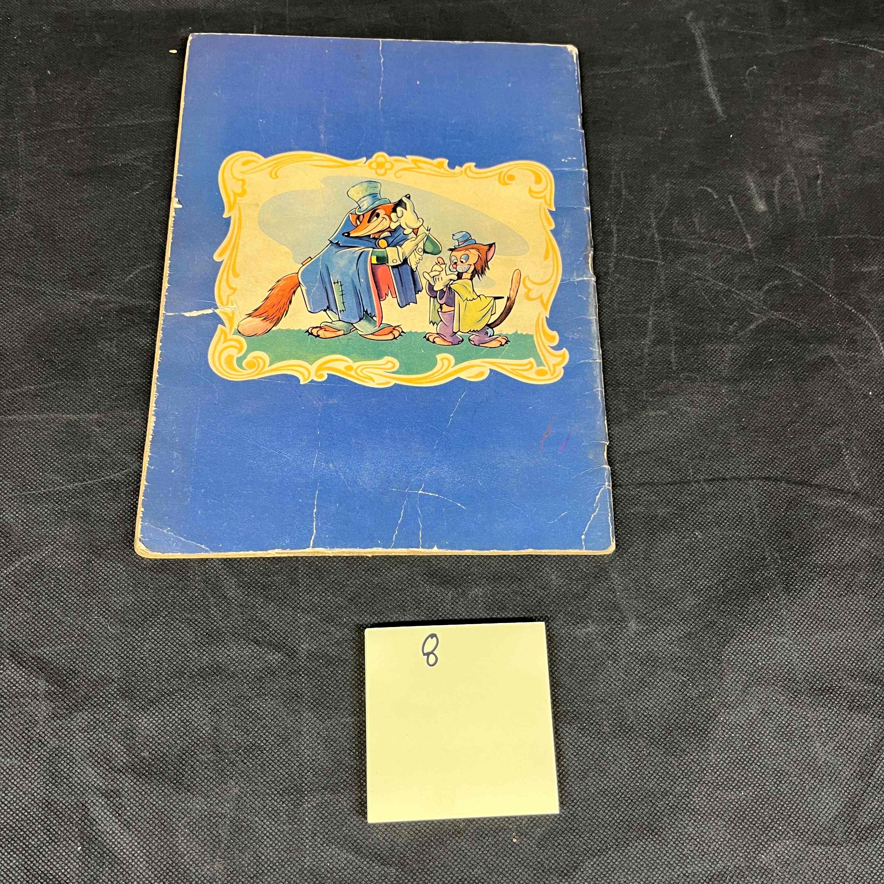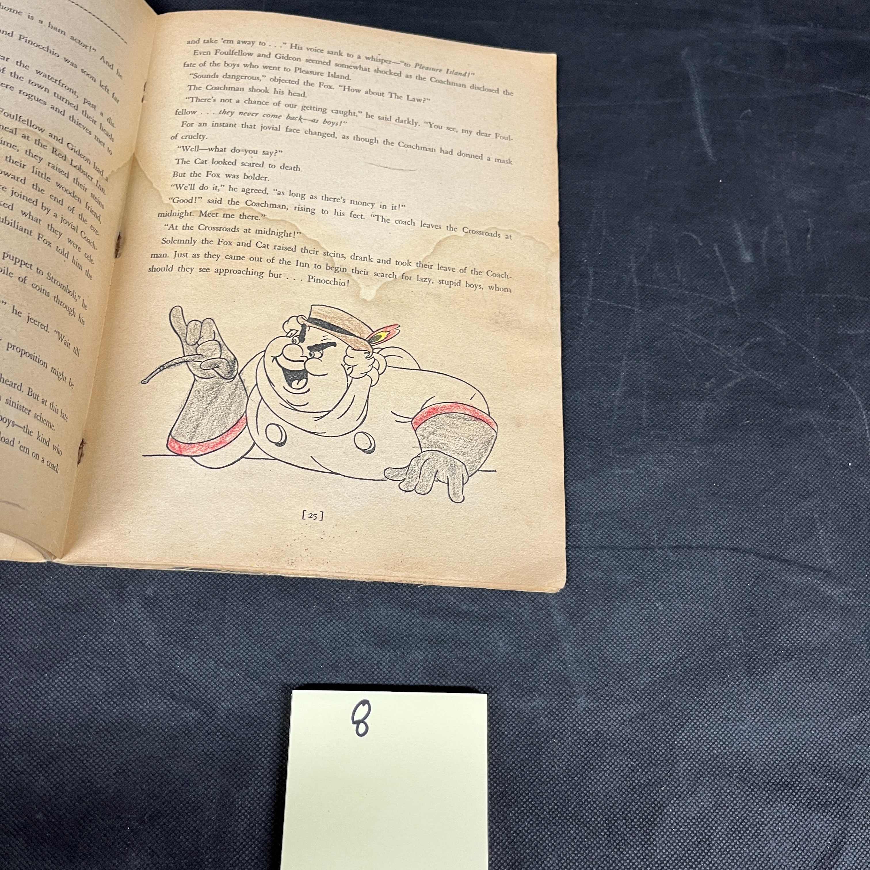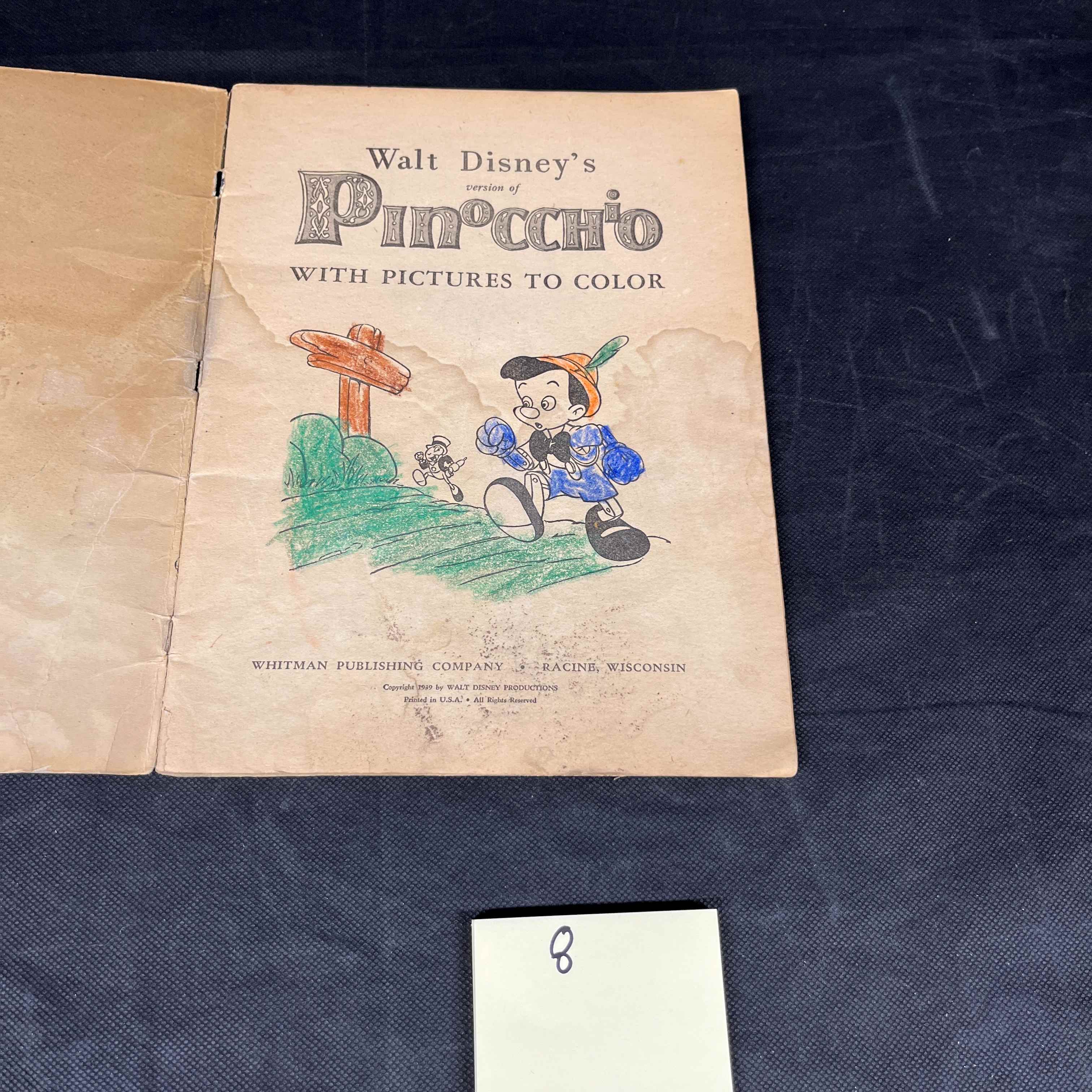 A vintage softcover coloring book titled “WALT DISNEY’S PINOCCHIO,” specifically “Walt Disney’s version of Pinocchio WITH PICTURES TO COLOR,” published by Whitman Publishing Company of Racine, Wisconsin, copyright MCMXL (1940). The front cover displays a stylized image of Pinocchio against a blue background, while the back cover depicts Honest John and Gideon. Internally, the book contains pages of text and black-and-white illustrations.