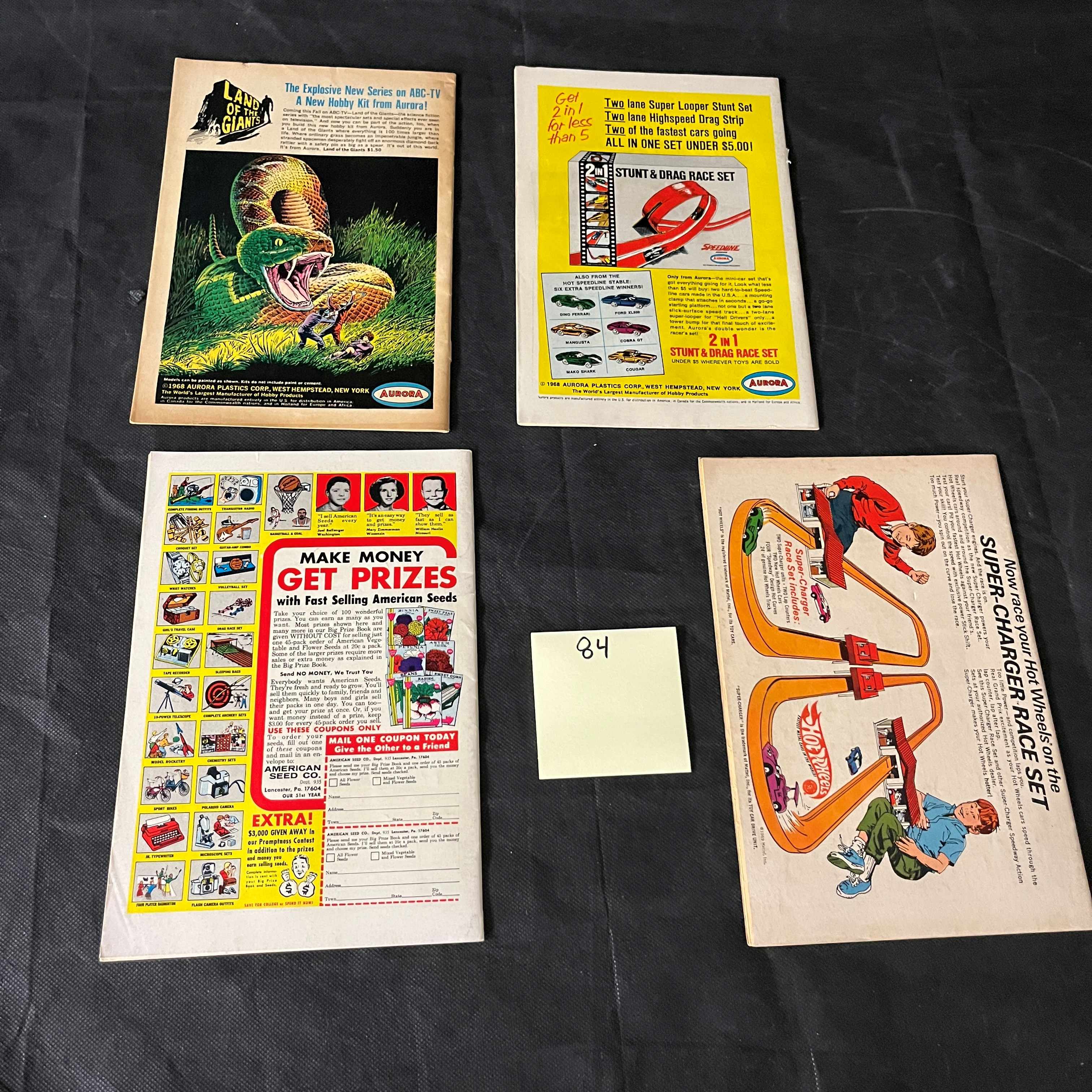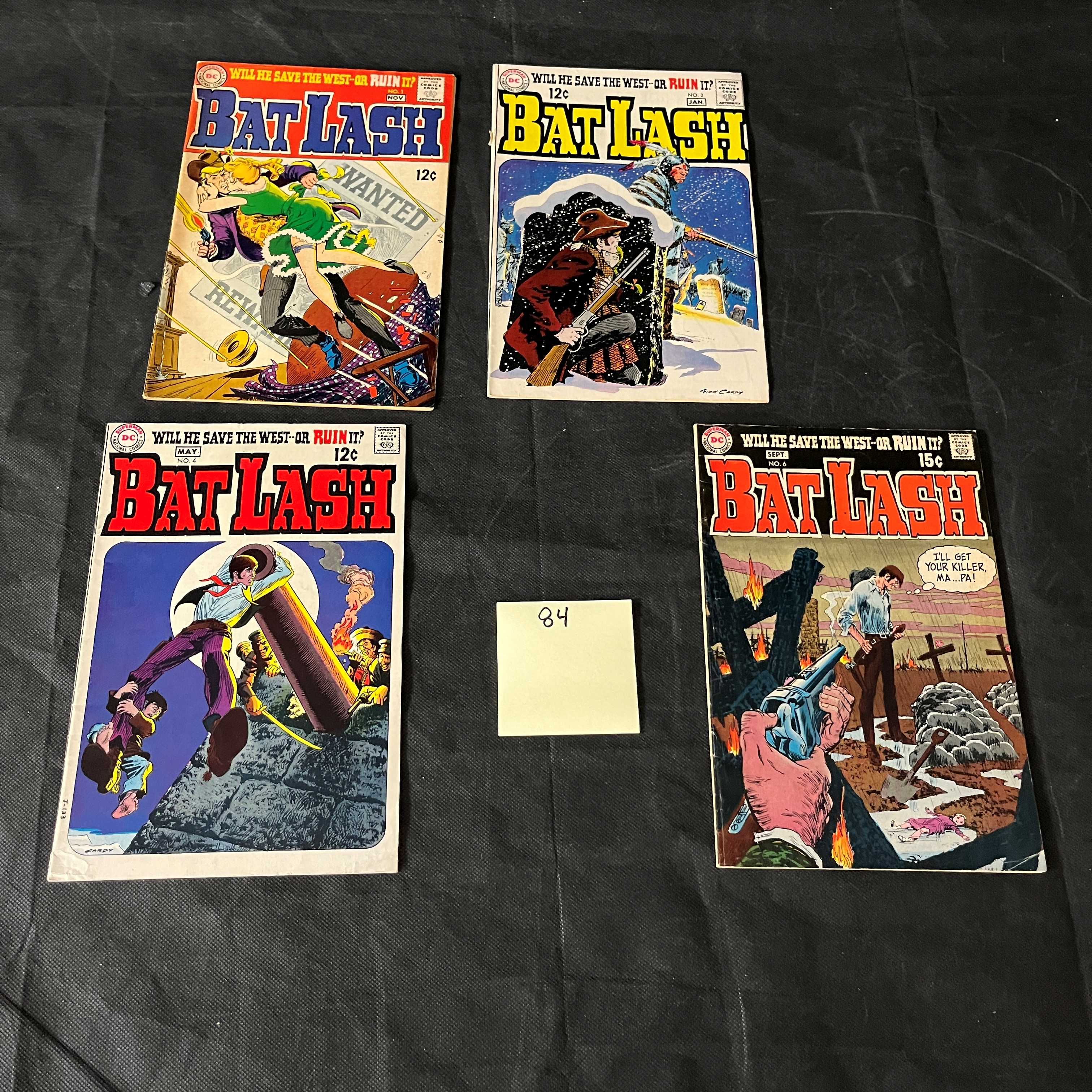 A group of four Silver Age DC Comics ‘Bat Lash’ issues, comprising numbers 1, 2, 3, and 4, dating from 1968-1969, with 12c and 15c cover prices and the Comics Code Authority seal. Each paper comic features vibrant, Western-themed cover art depicting the titular character, often accompanied by the recurring banner ‘WILL HE SAVE THE WEST – OR RUIN IT!?’ Visible text includes ‘WANTED’ and ‘REWARD’ on a poster featured on issue #1, and a speech bubble on issue #4 that reads, ‘I’LL… I’LL NEVER LEAVE ‘EM, MA… PA!’ Many of the covers are by Nick Cardy. The back covers display typical period advertisements for items such as Aurora monster model kits, Stunt & Drag Race Sets, American Seeds for prizes, and Hot Wheels Super-Charger Race Sets.