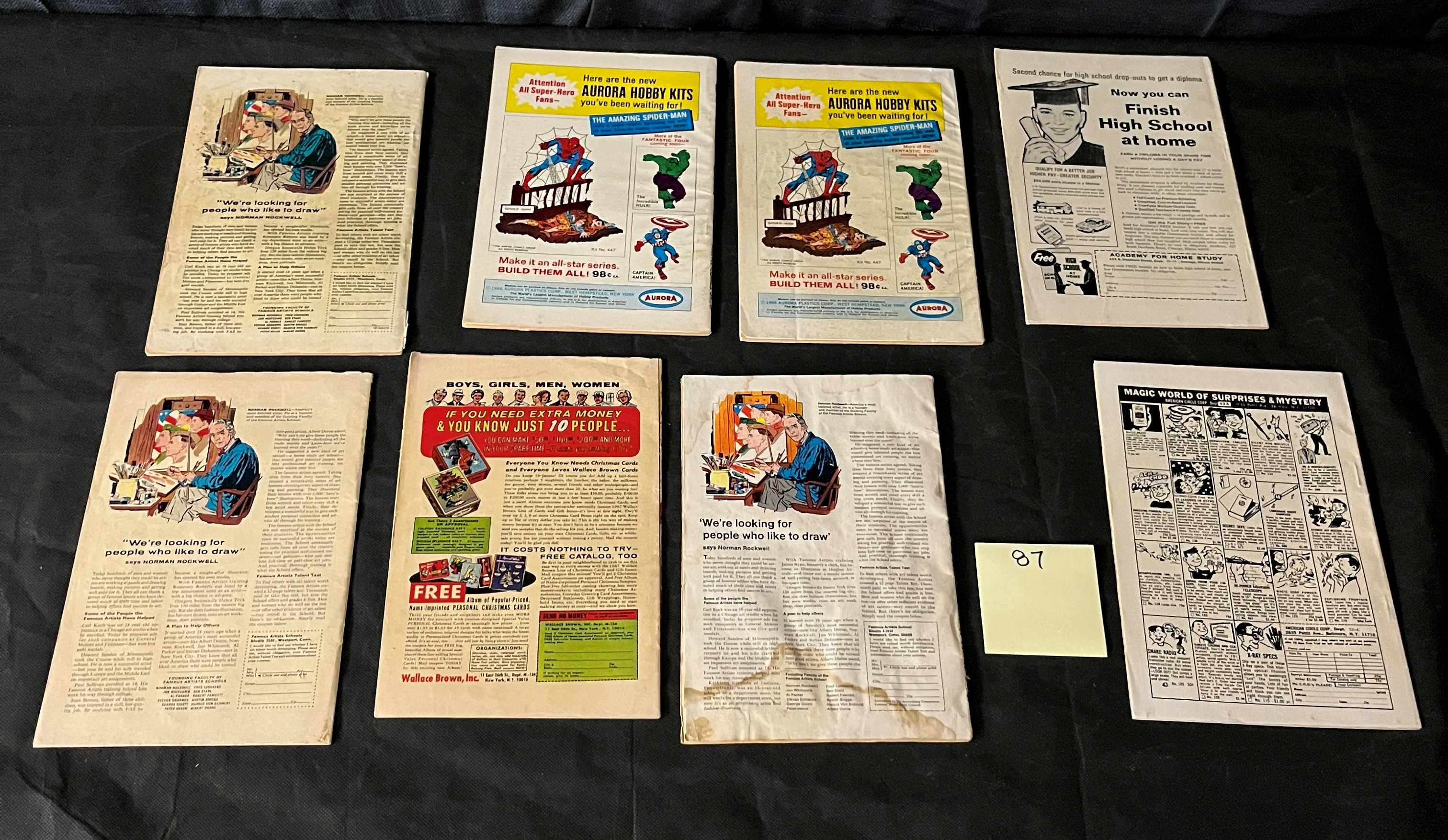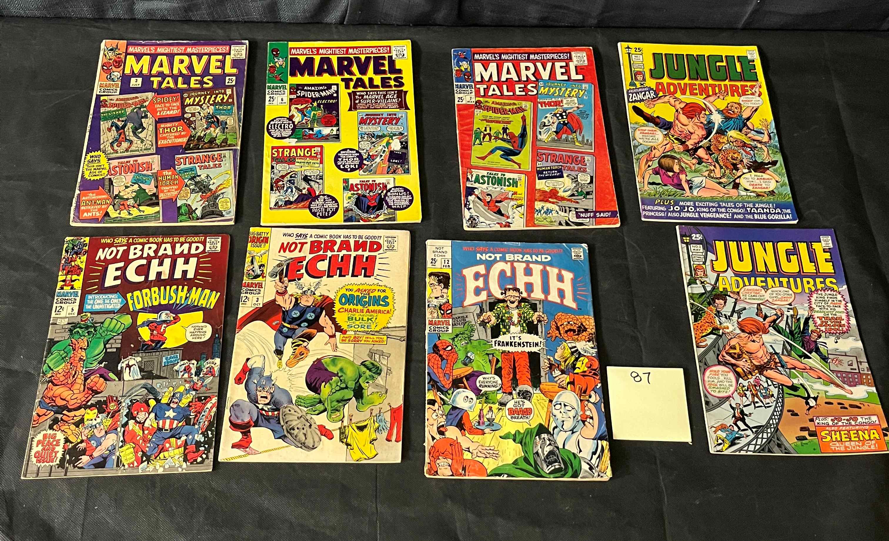 A collection of eight vintage American comic books, primarily from the Silver Age of comics, likely dating to the 1960s and early 1970s. The lot includes three issues of “Marvel Tales,” showcasing characters such as Spider-Man, Thor, and Dr. Strange. Also present are three issues of the parody series “Not Brand Echh,” featuring various Marvel characters like Thor, Hulk, Dracula, and Frankenstein, and two issues of “Jungle Adventures,” featuring characters like Zakar and Sheena. Visible pricing on the covers includes 12c and 25c, with issue numbers ranging from 15 to 45. The back covers, printed on paper, feature various period advertisements, including those for Aurora Hobby Kits, “Finish High School at Home” correspondence courses, Christmas cards, and “We’re looking for people who like to draw” art schools. A yellow sticky note with the number “87” is visible on the back cover of one comic.