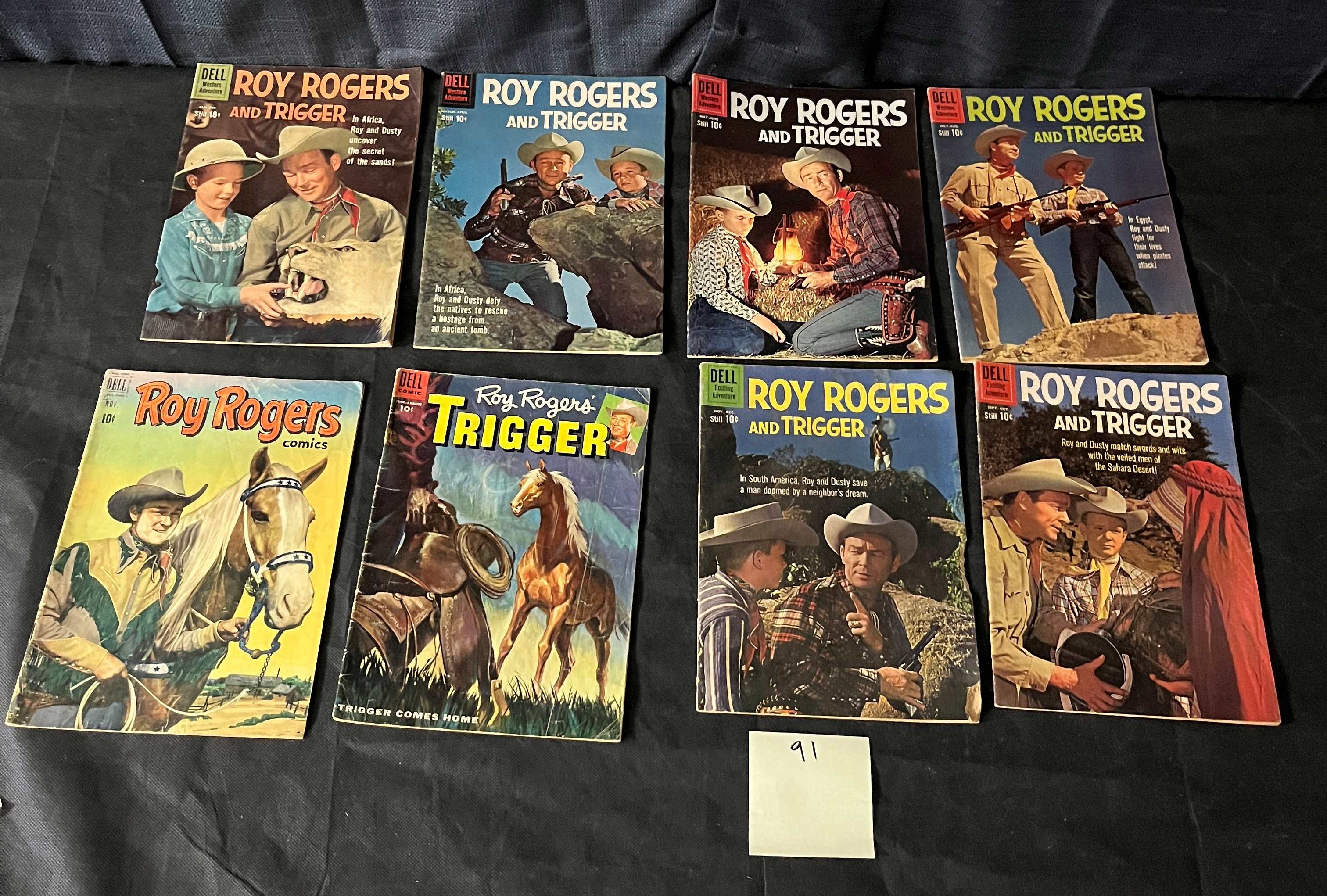 A collection of eight vintage American comic books published by Dell, predominantly featuring the characters Roy Rogers and his palomino horse, Trigger. The collection includes issues specifically titled “ROY ROGERS AND TRIGGER,” “Roy Rogers comics,” and “Roy Rogers TRIGGER.” Each comic is marked with a 10¢ price. Visible publication date indicators include “NOV DEC,” “MAY JUNE,” “NOV,” and “SEPT OCT,” consistent with the 1950s period identified in web research (e.g., 1951-1955). The covers display colorful illustrations in a Western adventure style, with various plot summaries such as “In Africa, Roy and Dusty uncover the secret of the sands!”, “TRIGGER COMES HOME,” and references to adventures in “Egypt,” “South America,” and the “Sahara Desert.” The comics are constructed from paper with cardstock covers.