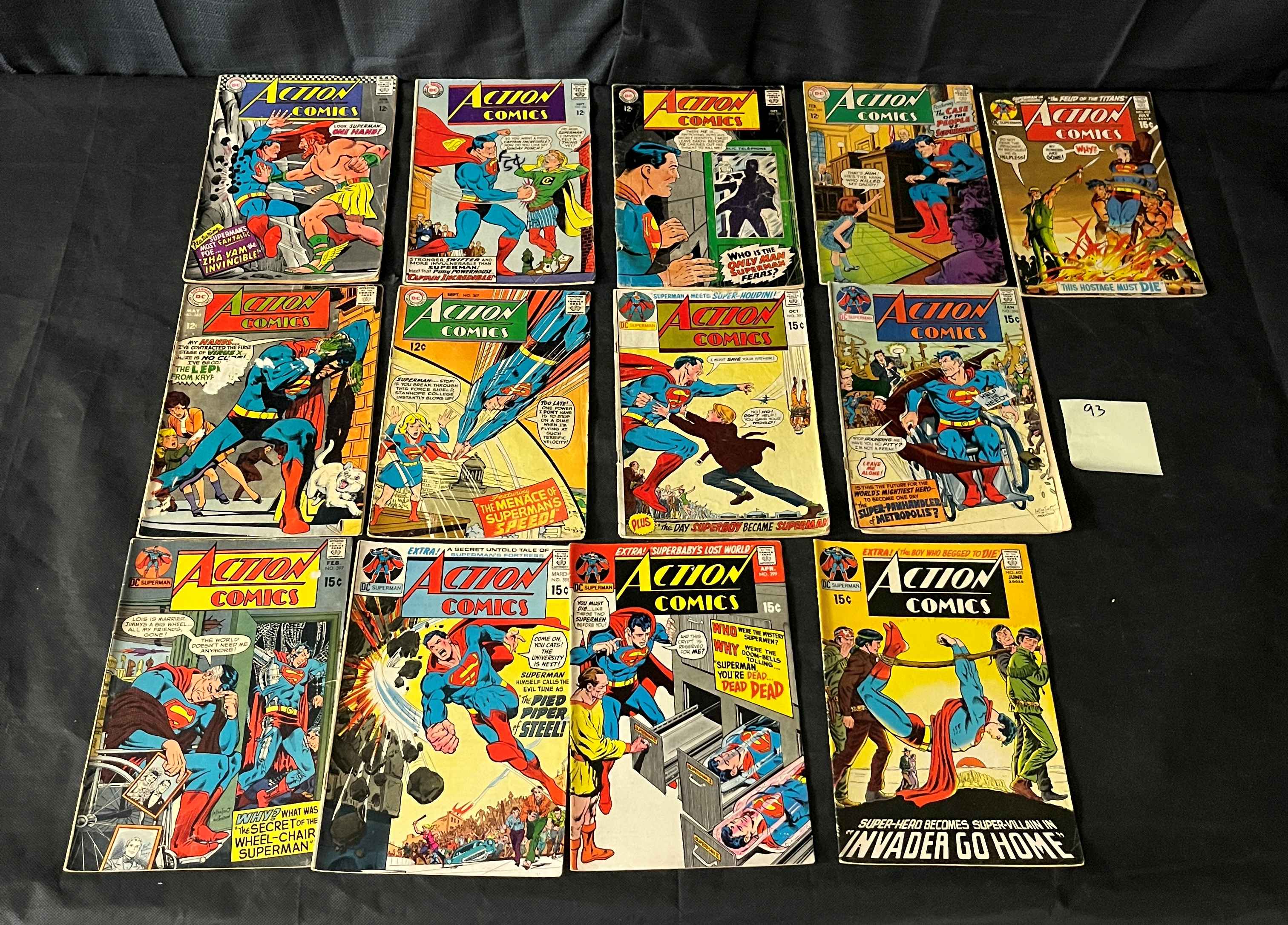 A group of twelve vintage American comic books from the ‘Action Comics’ series, published by DC Comics, predominantly featuring Superman and associated characters on their covers. Dating from the mid-1960s to early 1970s, these issues reflect the Silver to early Bronze Age of comic art, with original cover prices ranging from 12¢ to 15¢. Each item is made of printed paper, showcasing vibrant, multi-color illustrations and dramatic text-based headlines. Visible issue numbers include No. 363, No. 370, No. 391, No. 397, and No. 401. Notable cover headlines include “THE LEPER FROM KRYPTON!”, “WHO IS THE ONLY MAN SUPERMAN FEWS?”, “THE SECRET OF THE WHEEL-CHAIR SUPERMAN”, and “SUPER-HERO BECOMES SUPER-VILLAIN IN INVADER GO HOME”. A small white slip of paper with the handwritten number ’93’ is included with the lot.