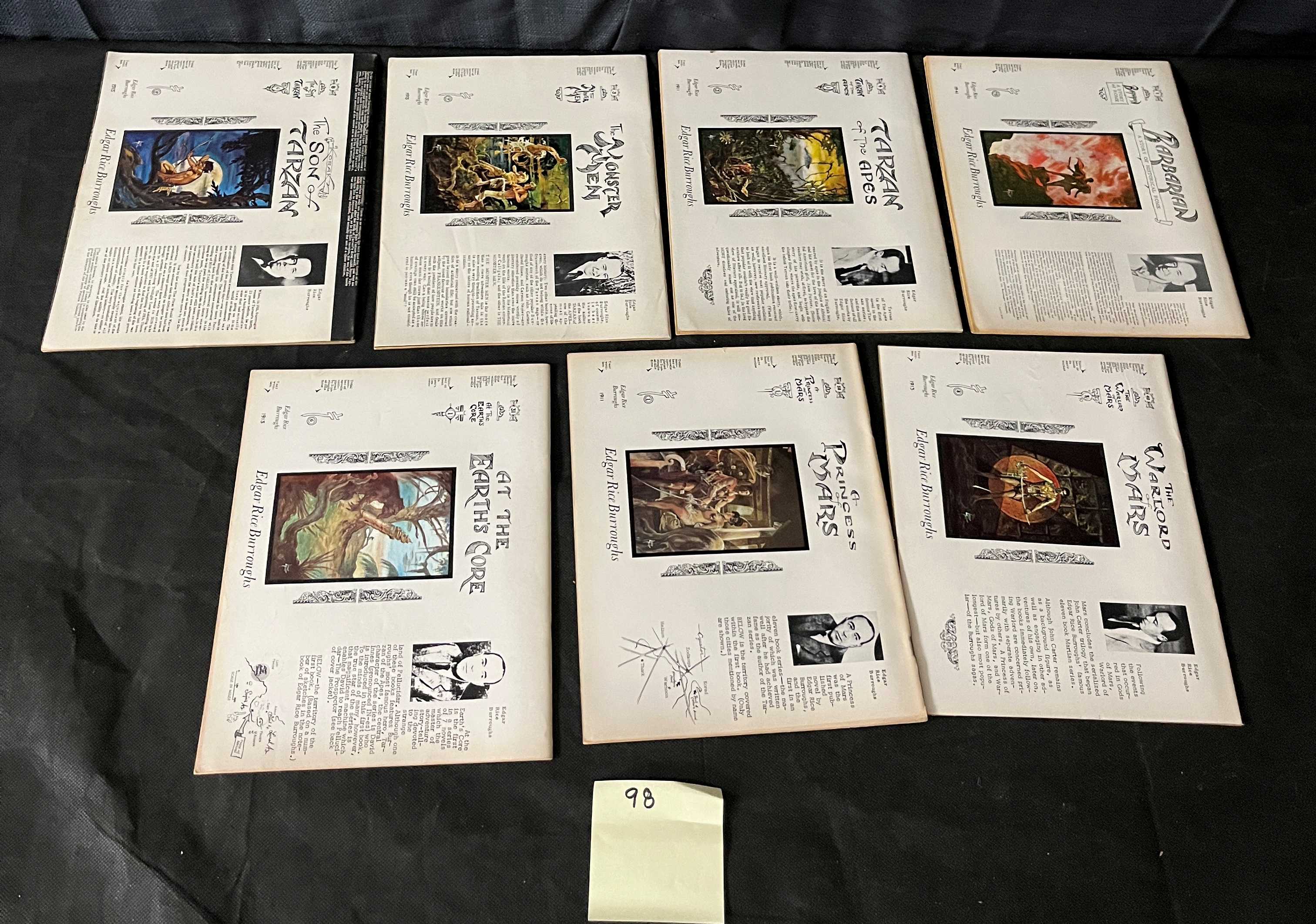 A collection of seven vintage staple-bound magazines from the ‘Monsters and Heroes’ series, published in 1969. The lot comprises issues sequentially numbered No. 1 through No. 7. The front covers feature vibrant, pulp-style artwork depicting classic characters and themes such as Flash Gordon, King Kong, The Mummy, Frankenstein, Tarzan (specifically ‘Son of Tarzan’), and Captain Midnight. Additional visible text references ‘First Issue,’ ‘Movie Serials,’ ‘Comix,’ and ‘Mythology.’ The back covers are consistently designed, dedicated to author Edgar Rice Burroughs, featuring articles, portraits, and illustrations related to his works, including ‘Son of Tarzan,’ ‘The Monster Men,’ ‘Tarzan and the Golden Lion,’ ‘Pellucidar,’ ‘At The Earth’s Core,’ and ‘Princess of Mars.’ Printed on paper.