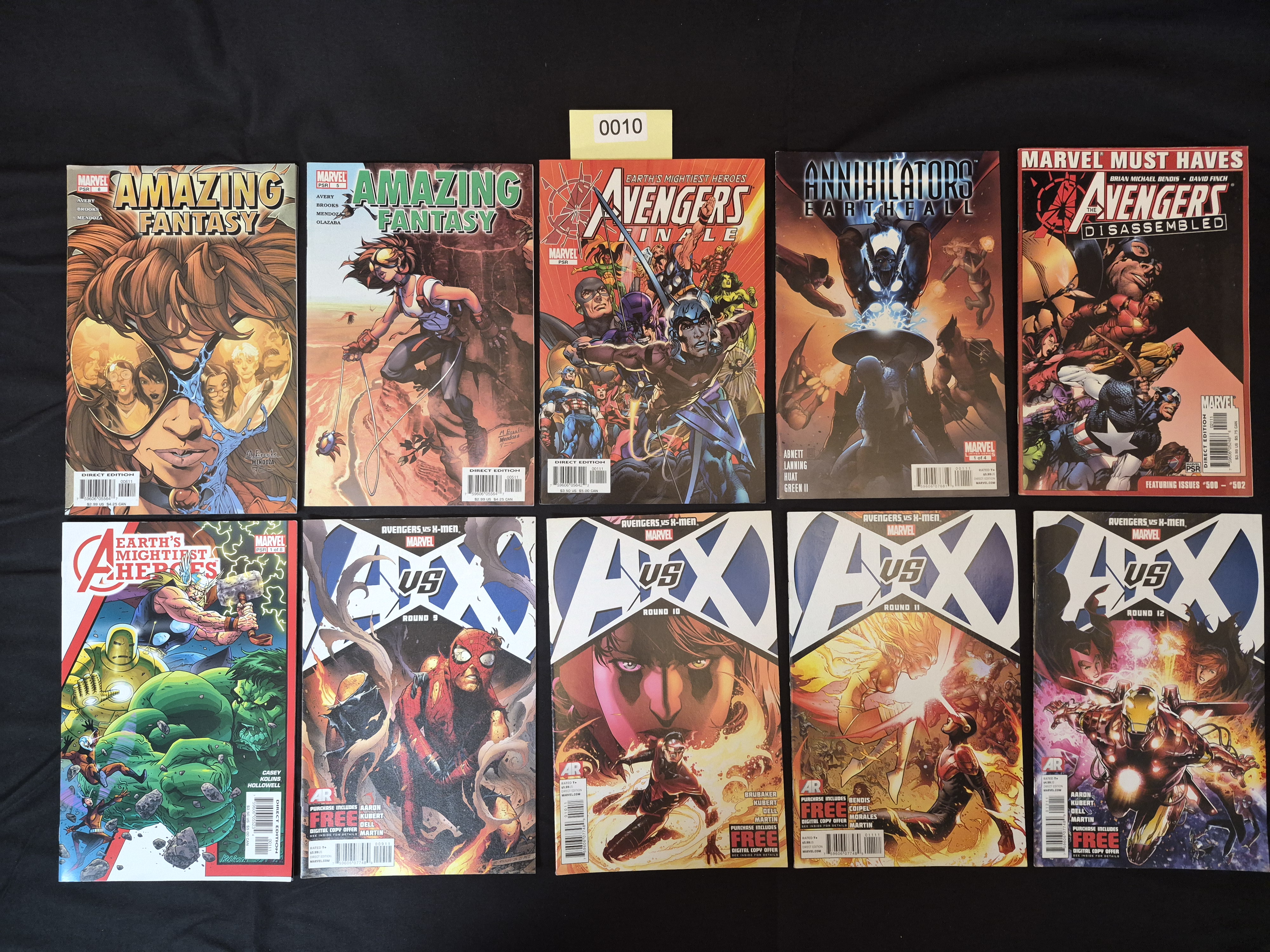 BID PER WHAT YOU SEE IN THE PHOTO, NOT THE AI GENERATED TITLES AND DESCRIPTIONS! A collection of 10 individual Marvel comic books published in the modern era, primarily focusing on Avengers and related titles. The books are glossy, standard-sized single issues, identified as Direct Editions, featuring standard barcodes and creator credits. The lot includes two rows of five books each. Specific titles include Amazing Fantasy issues #5 and #6; Avengers Finale; Annihilators: Earthfall (Limited Series 1 of 4); Marvel Must Haves: The Avengers Disassembled (featuring issues 500-502); Earth’s Mightiest Heroes (PSR 1 of 8); and a sequence of four issues from the Avengers vs X-Men: VS storyline (Round 9, Round 10, Round 11, and Round 12). Multiple issues advertise a “FREE DIGITAL COPY OFFER” on the cover. A yellow inventory sticker marked “0010” is visible above the center of the top row.