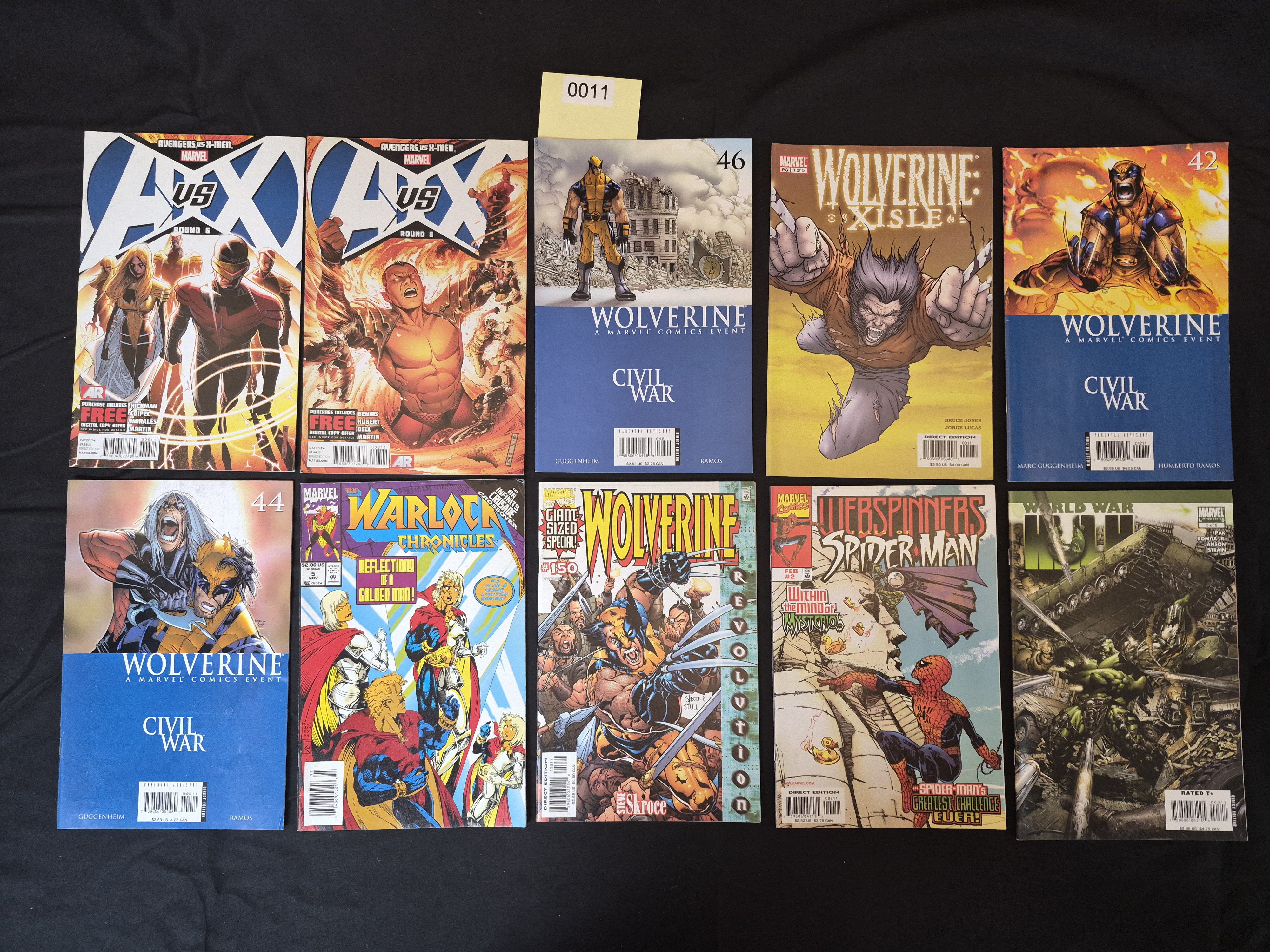 BID PER WHAT YOU SEE IN THE PHOTO, NOT THE AI GENERATED TITLES AND DESCRIPTIONS! A collection of ten Modern Age Marvel Comics periodicals, published as Direct Edition releases. The items are saddle-stitched paper periodicals with glossy covers, featuring titles focused primarily on major crossover storylines and the character Wolverine. The lot includes two issues of the *Avengers vs. X-Men* event (Rounds 6 and 8); four issues of *Wolverine*, including three Civil War tie-ins (numbers 42, 44, and 46), and a *Wolverine Giant-Sized Special* #150. Also present are *Warlock Chronicles* #5 (an Infinity Crusade crossover issue), *Webspinners: Tales of Spider-Man* #2, and *World War Hulk* (Issue 3 of 5). Cover price points displayed on the issues range from $2.00 to $3.99 US. An administrative sticker marked “0011” is affixed to the upper section of the cover of *Wolverine* #46.