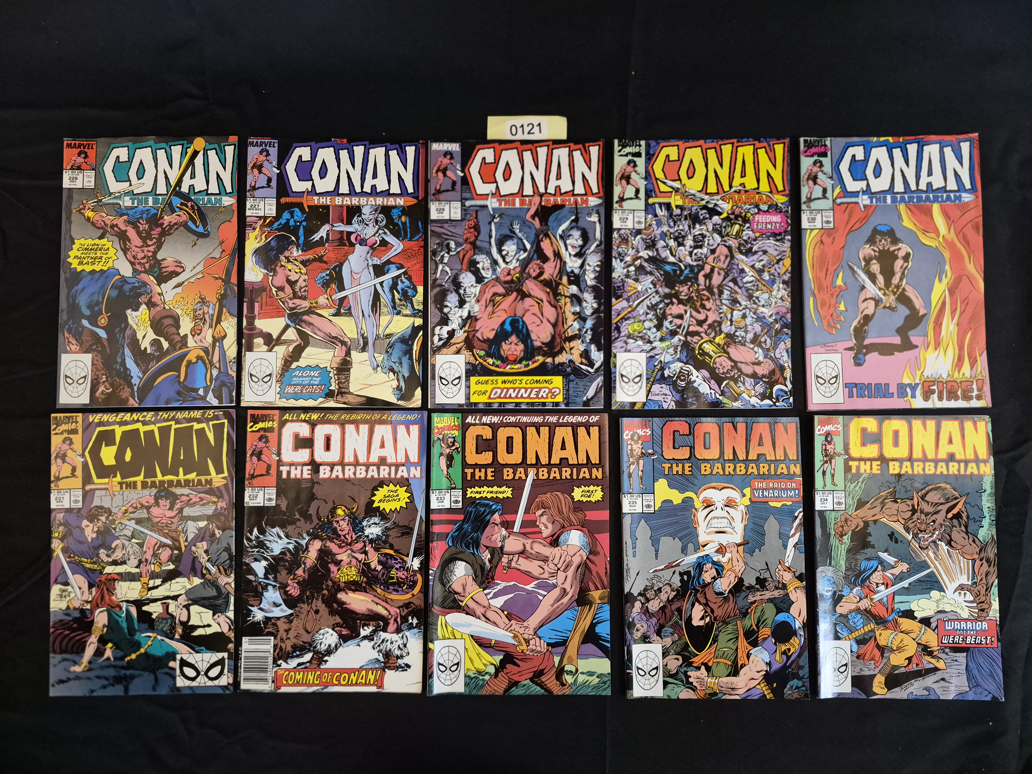 BID PER WHAT YOU SEE IN THE PHOTO, NOT THE AI GENERATED TITLES AND DESCRIPTIONS! A collection of 12 sequential Marvel Comics periodicals featuring the title Conan the Barbarian. The lot includes issues from a concentrated run, specifically issues #226 through #236, published approximately between 1989 and 1990. One issue, #230, is duplicated within the collection, resulting in 11 unique issues and 12 total physical items. All issues feature color illustrated covers depicting sword-and-sorcery action, bear the Marvel Comics logo, and utilize the Spider-Man head motif in the bottom left corner price box. The cover price listed is $1.00 US. The comics are constructed of typical periodical paper. A yellow inventory sticker reading 0121 is positioned above the top row of comics.