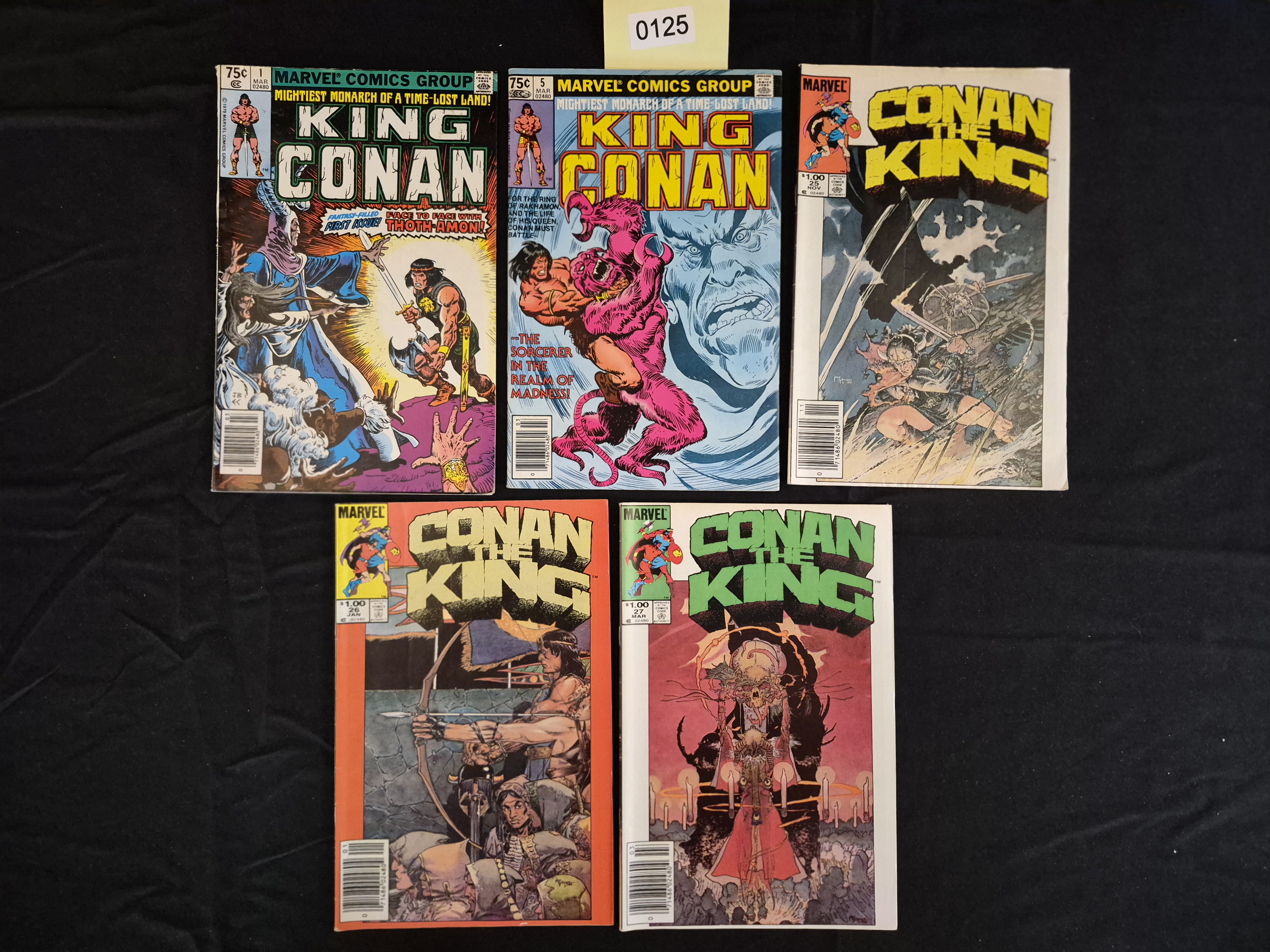 BID PER WHAT YOU SEE IN THE PHOTO, NOT THE AI GENERATED TITLES AND DESCRIPTIONS! A collection of five Marvel Comics Group periodicals featuring the character Conan. The lot includes two issues of the title King Conan (Issues #1 and #5, 75 cent cover price) and three consecutive issues of Conan the King (Issues #25, #26, and #27, $1.00 cover price). The issues date primarily to the mid-1980s, placing them in the Bronze or Copper Age era of comics. Conan the King #25 is confirmed by market data as November 1984. Construction consists of standard newsprint interiors and glossy paper covers with full-color illustrations. All items display the Marvel Comics Group logo, Comics Code Authority stamps, issue numbers, and UPC barcodes. Cover art depicts various fantasy action scenes, including combat with antagonists like Thoth-Amon and stylized macabre imagery.