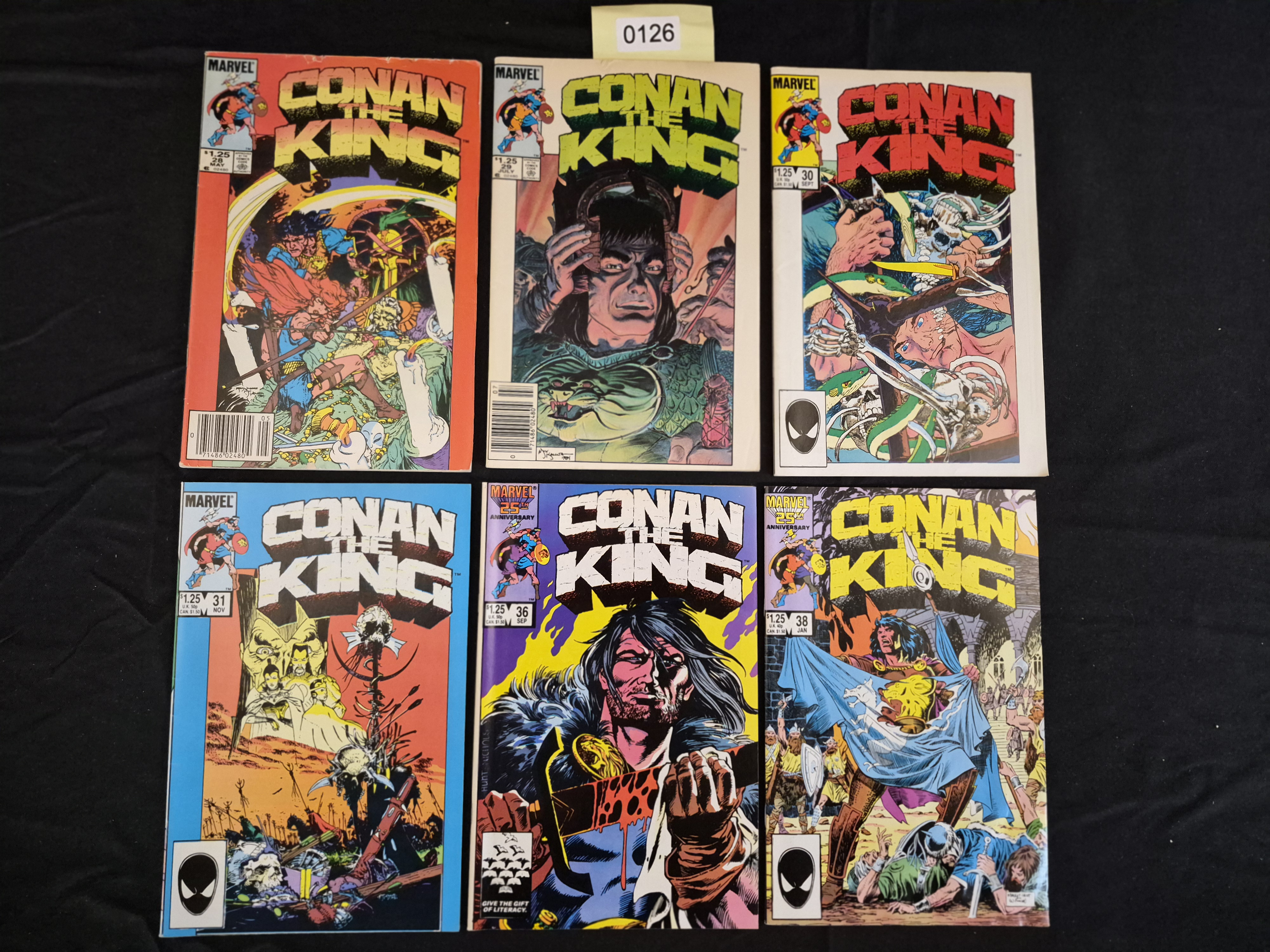 BID PER WHAT YOU SEE IN THE PHOTO, NOT THE AI GENERATED TITLES AND DESCRIPTIONS! A collection of six standard American comic books published by Marvel Comics from the series Conan the King (1980). The lot includes issues #28, #29, #30, #31, #36, and #38. These issues date from the mid-to-late 1980s, placing them within the Copper/Modern Age of comics. Issues #36 and #38 feature the “Marvel 25th Anniversary” banner. All visible issues display a US cover price of $1.25 and contain standard Marvel corner boxes, some incorporating the black Spider-Man symbol. A yellow inventory sticker marked “0126” is visible centrally above the top row.