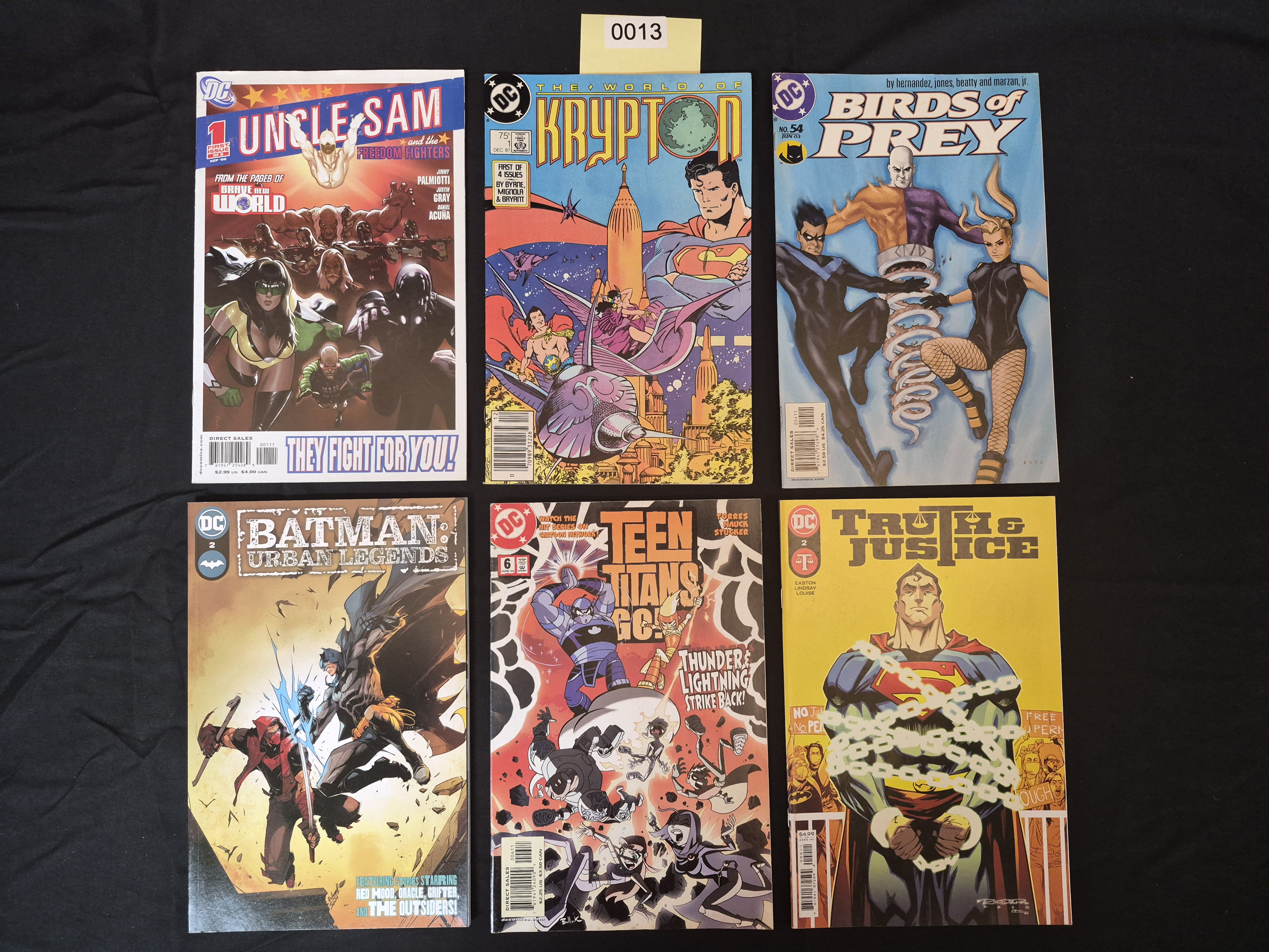 BID PER WHAT YOU SEE IN THE PHOTO, NOT THE AI GENERATED TITLES AND DESCRIPTIONS! A collection of six DC Comics comic books published between 1987 and 2006, representing the late Copper Age and the Modern Age of comics. The books are printed on standard comic book paper stock with full-color covers. Titles included are Uncle Sam and the Freedom Fighters #1 (September 2006), The World of Krypton #1 (December 1987), Birds of Prey #54 (June 2003), Batman: Urban Legends #2, Teen Titans Go! #6 (June 2004), and Truth & Justice #2. The covers feature key DC characters such as Superman, Batman, Nightwing, and members of the Teen Titans. An administrative yellow sticker marked “0013” is present above the top center comic.