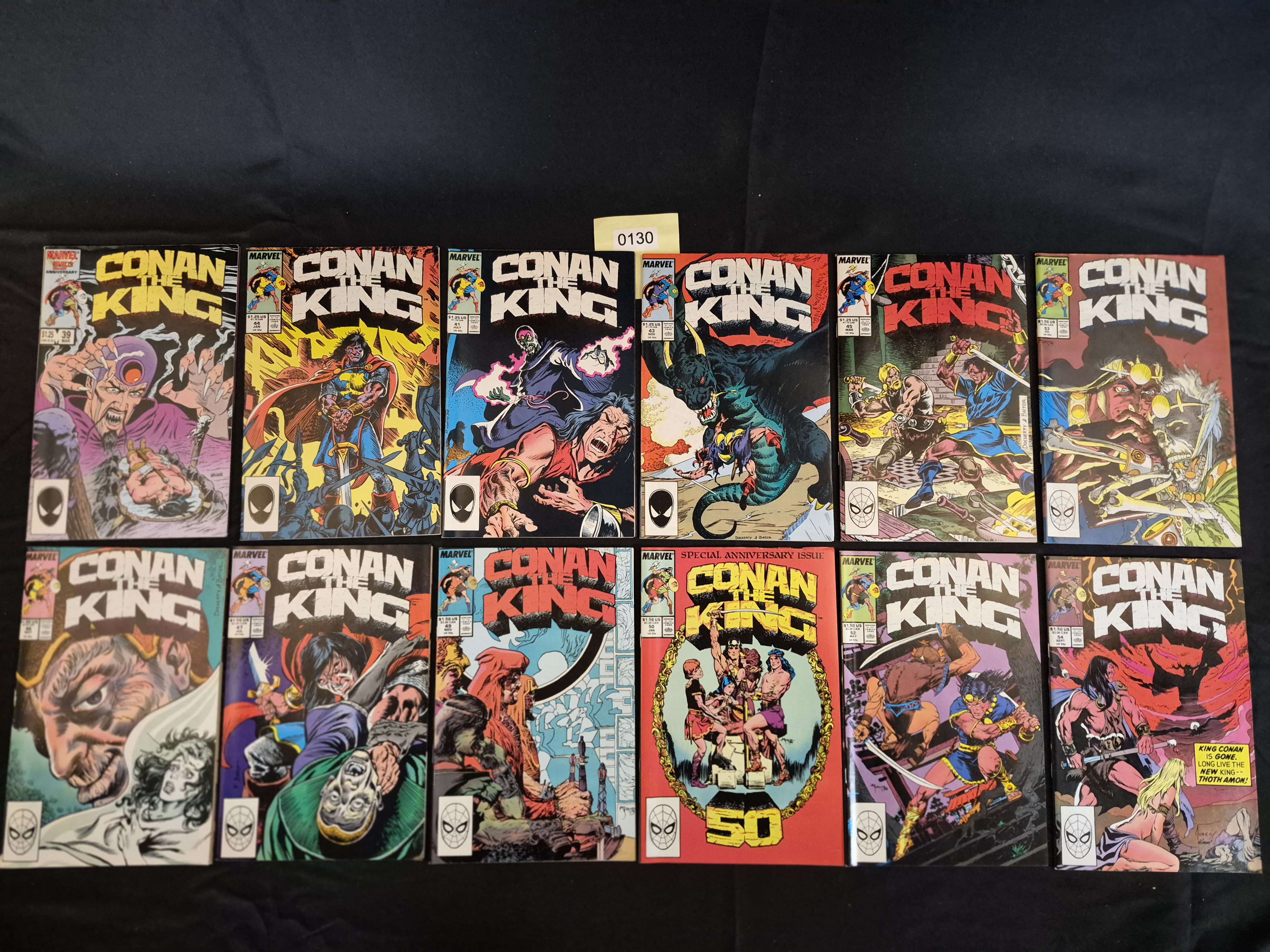 BID PER WHAT YOU SEE IN THE PHOTO, NOT THE AI GENERATED TITLES AND DESCRIPTIONS! A collection of 14 individual American comic books from the Marvel Comics series Conan the King. The comics are constructed of standard printed paper with full-color, glossy covers depicting various fantasy and sword-and-sorcery scenes featuring the titular character. Based on visible details, the issues range from the late 30s through the mid-50s of the series run, which Web Intelligence confirms was published between 1984 and 1989 (Copper Age). Visible issues include a Special Anniversary Issue number 50, originally priced at $2.50 US. Other issues bear original price tags of $1.25 US or $1.50 US. All comics feature the Marvel masthead and the distinctive Spider-Man logo UPC box. A caption box on the cover of the final visible issue reads, “KING CONAN IS GONE. LONG LIVE THE NEW KING — THOTH AMON!”