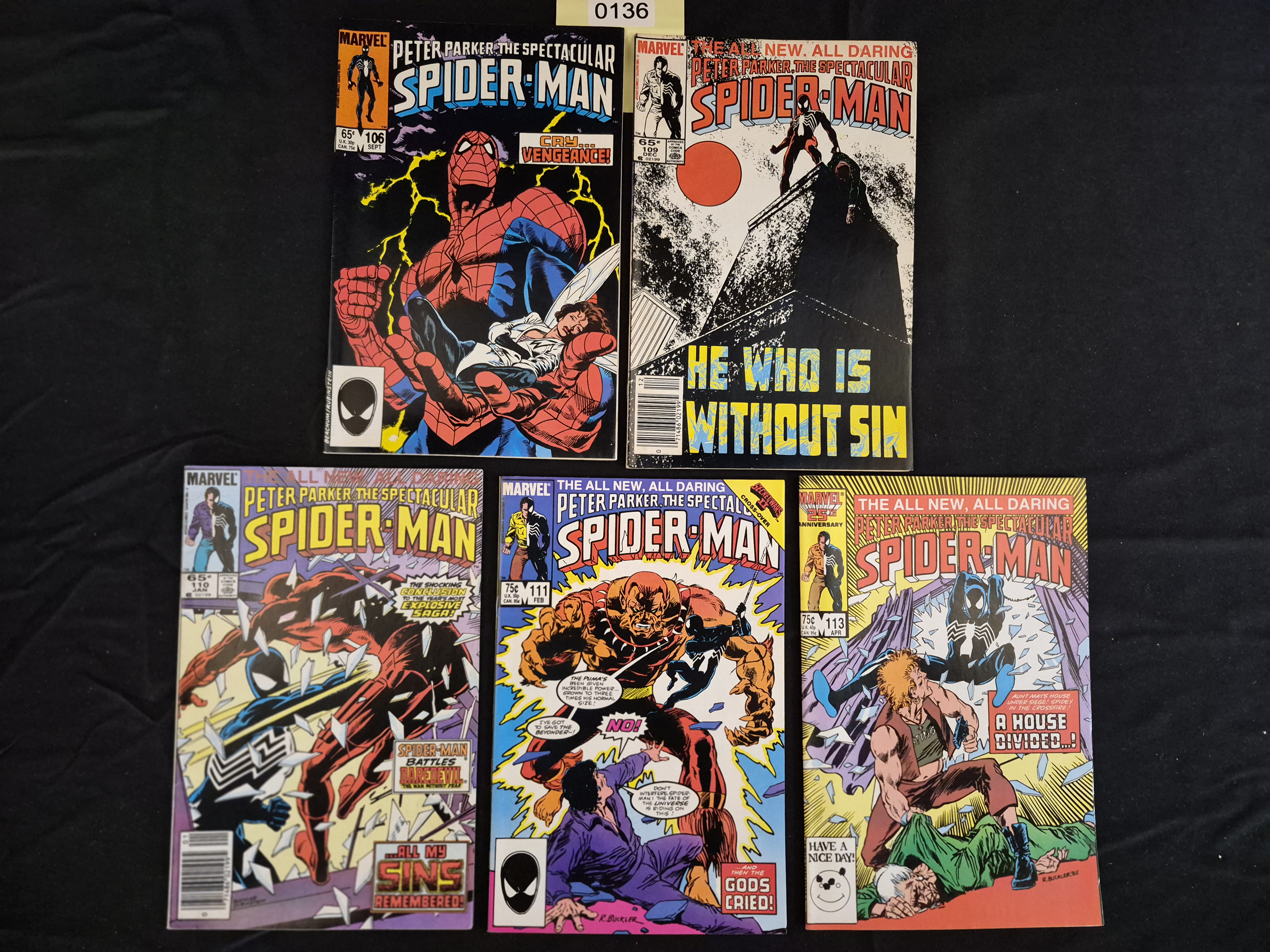 BID PER WHAT YOU SEE IN THE PHOTO, NOT THE AI GENERATED TITLES AND DESCRIPTIONS! A collection of five Marvel Comics Copper Age comic books from the series Peter Parker The Spectacular Spider-Man. The issues included are #106 (September), #109 (December), #110 (January), #111 (February), and #113 (April), dating from the mid-1980s. The majority of the covers feature Spider-Man in his black costume. Noteworthy elements include the story titles “CRY… VENGEANCE!” on #106 and “HE WHO IS WITHOUT SIN” on #109. Issue #110 features a crossover plot point “SPIDER-MAN BATTLES DAREDEVIL.” Issue #111 is marked as a “Secret Wars II Cross-Over,” and issue #113 carries the “Marvel 25th Anniversary” emblem. The items are printed paper comics in full color.