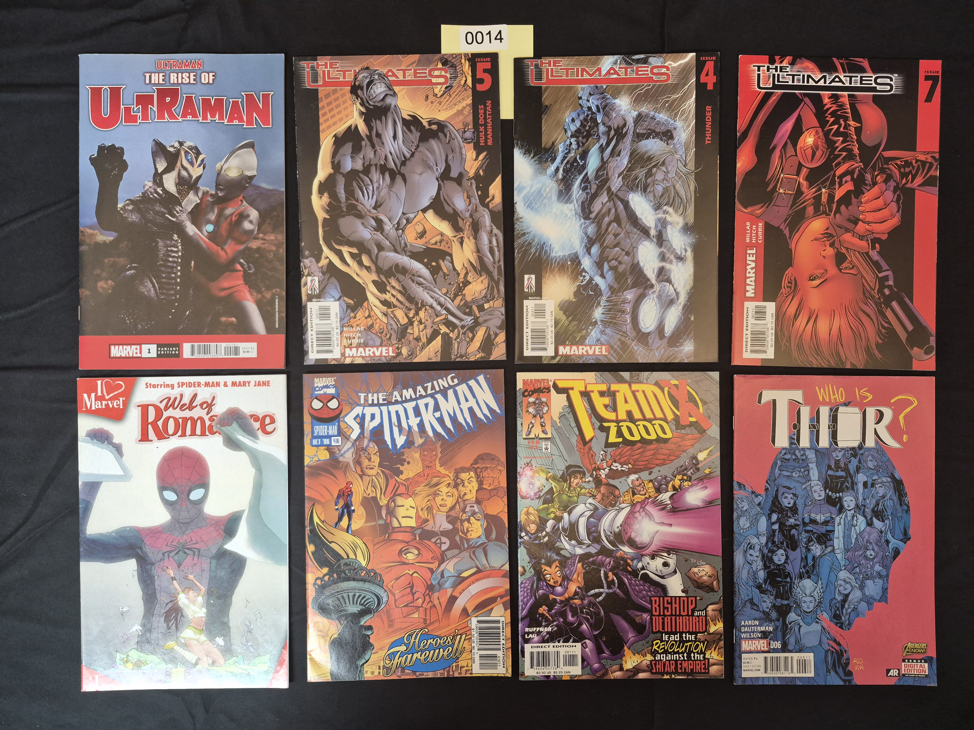 BID PER WHAT YOU SEE IN THE PHOTO, NOT THE AI GENERATED TITLES AND DESCRIPTIONS! A collection of eight standard American paperback comic books, predominantly published by Marvel Comics. The lot includes titles such as Ultraman: The Rise of Ultraman (Variant Edition), three issues of The Ultimates (Issues 4, 5, and 7), I Love Marvel: Web of Romance #1, The Amazing Spider-Man #416 (October 1996), Team X 2000 #1 (February 2000), and Who Is Thor? #6. All items are full-color superhero comics featuring typical glossy paper covers. Most issues are identified as “Direct Edition” with various US price points visible, ranging from $2.25 to $3.99. An inventory sticker marked “0014” is affixed to the background near the top center of the arrangement.