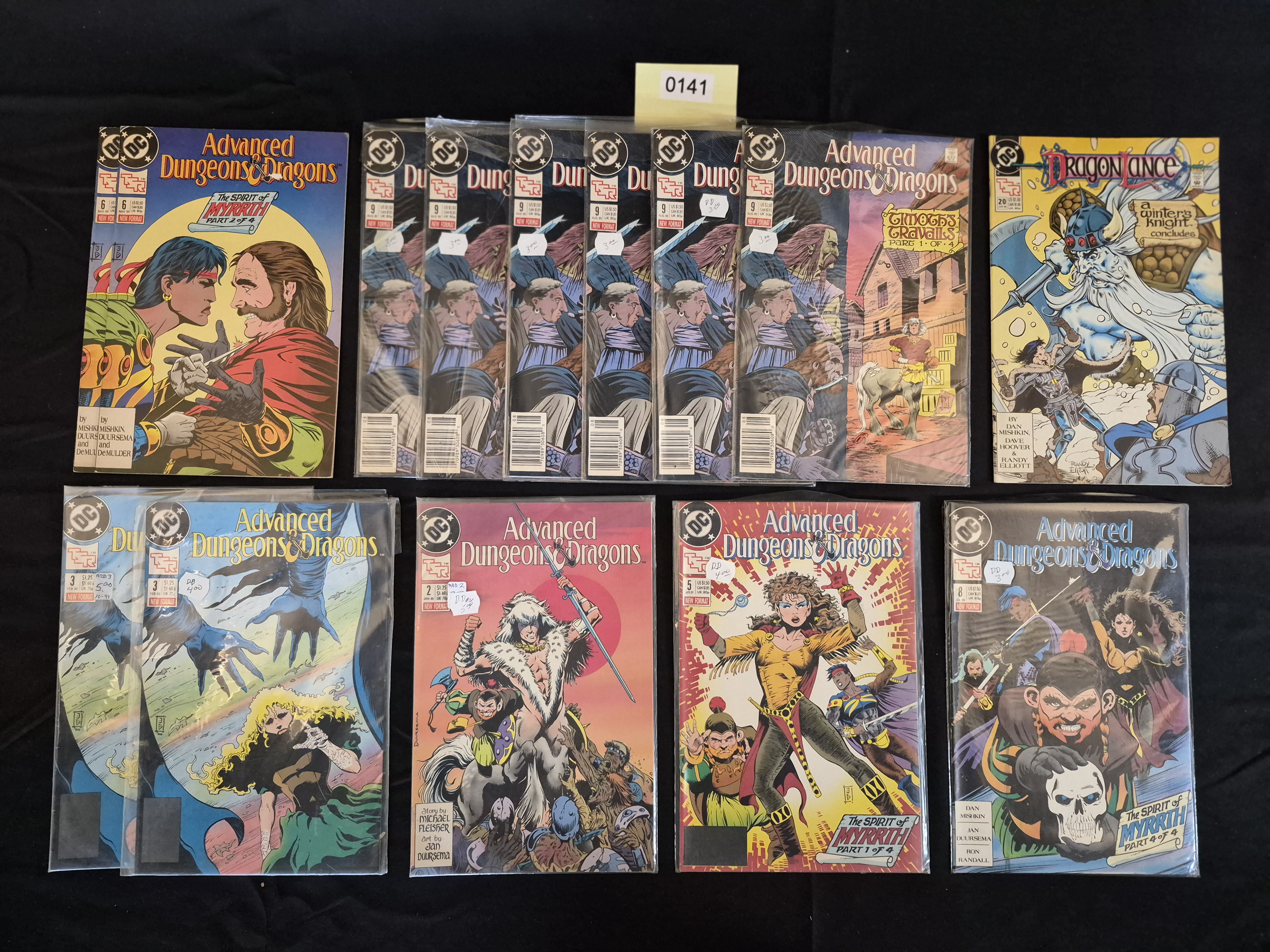 BID PER WHAT YOU SEE IN THE PHOTO, NOT THE AI GENERATED TITLES AND DESCRIPTIONS! A collection of 16 vintage fantasy comic books published by DC Comics in collaboration with TSR, primarily consisting of the Advanced Dungeons & Dragons (AD&D) series. The lot includes issues ranging from AD&D Issue 2 through Issue 12, featuring parts of the story arcs The Spirit of Myrrth and Gmod’s Gravalls. The collection contains multiple duplicates, including six total copies of Issue 9 (split between two different cover/story variants) and two copies of Issue 3. Also included is one issue of Dragonlance (Issue 20, A Winter’s Knight Concludes). All items are in standard softcover comic book format, individually bagged and boarded in clear plastic sleeves. A yellow inventory tag marked 0141 is centered above the top row.