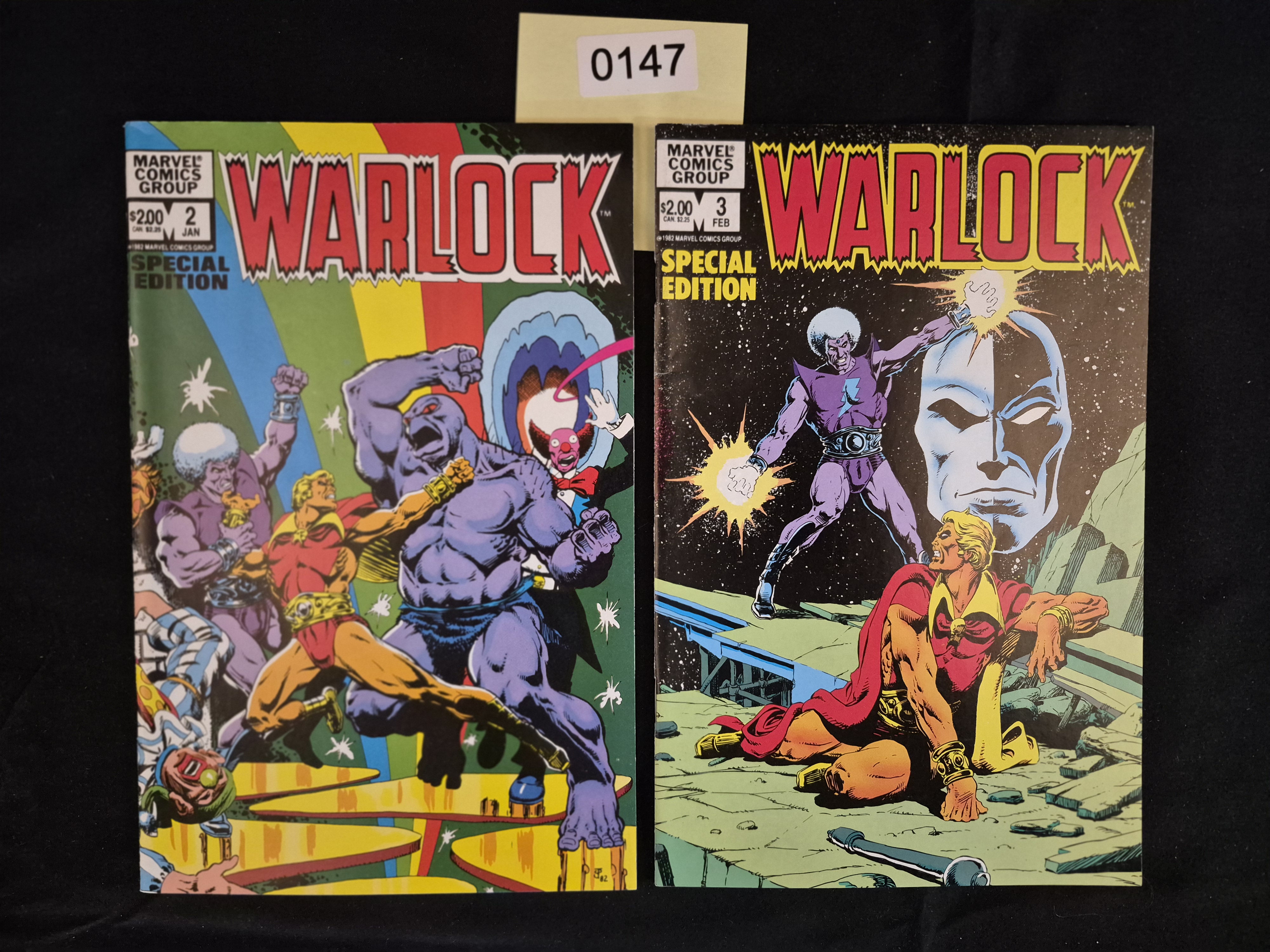 BID PER WHAT YOU SEE IN THE PHOTO, NOT THE AI GENERATED TITLES AND DESCRIPTIONS! A pair of standard-sized comic books from the Marvel Comics Group Warlock Special Edition series. This lot includes Issue Number 2 (January) and Issue Number 3 (February). Both issues are dated 1982 and display a cover price of $2.00 US. The comics are printed on paper and cardstock. Issue 2 features a colorful cover illustration depicting Warlock engaged in combat with several figures, including a large purple creature and a figure resembling a clown, set against a geometric backdrop. Issue 3 features a darker, space-themed cover showing Warlock seated in the foreground below a purple antagonist and a large, blue, cosmic face.