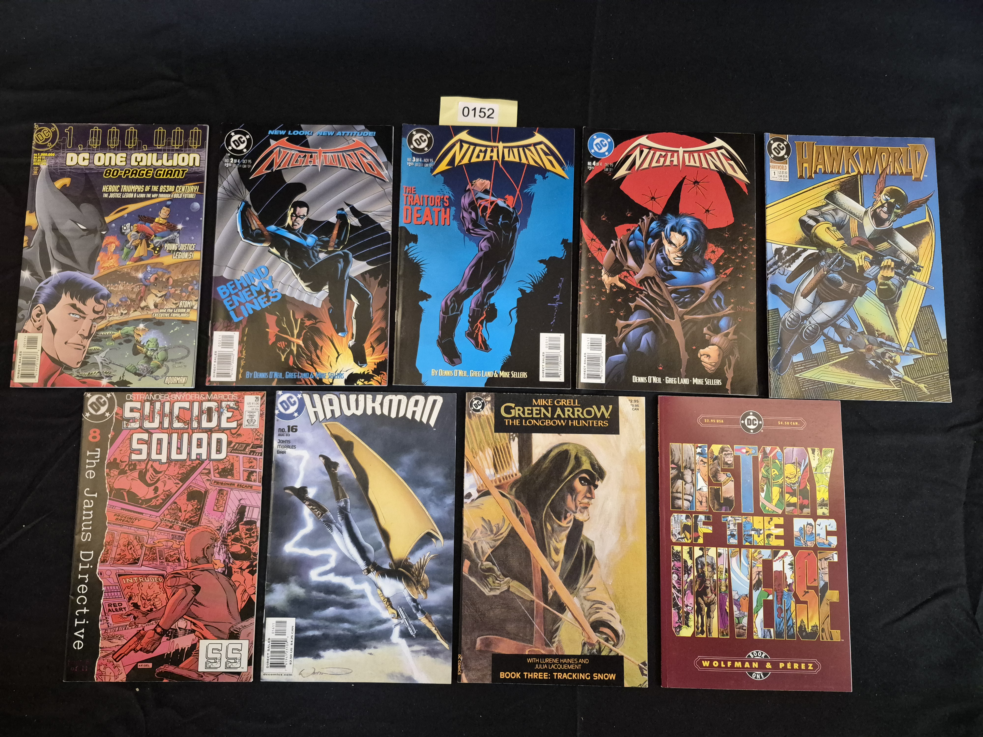 BID PER WHAT YOU SEE IN THE PHOTO, NOT THE AI GENERATED TITLES AND DESCRIPTIONS! A collection of nine publications from DC Comics, primarily dating from the Modern Age (c. 1980s–2000s), consisting of both standard comic book issues and square-bound collected editions. The collection features several key DC titles and characters, with a strong emphasis on the 1995 Nightwing mini-series. The material is printed on standard paper stock with glossy covers.
