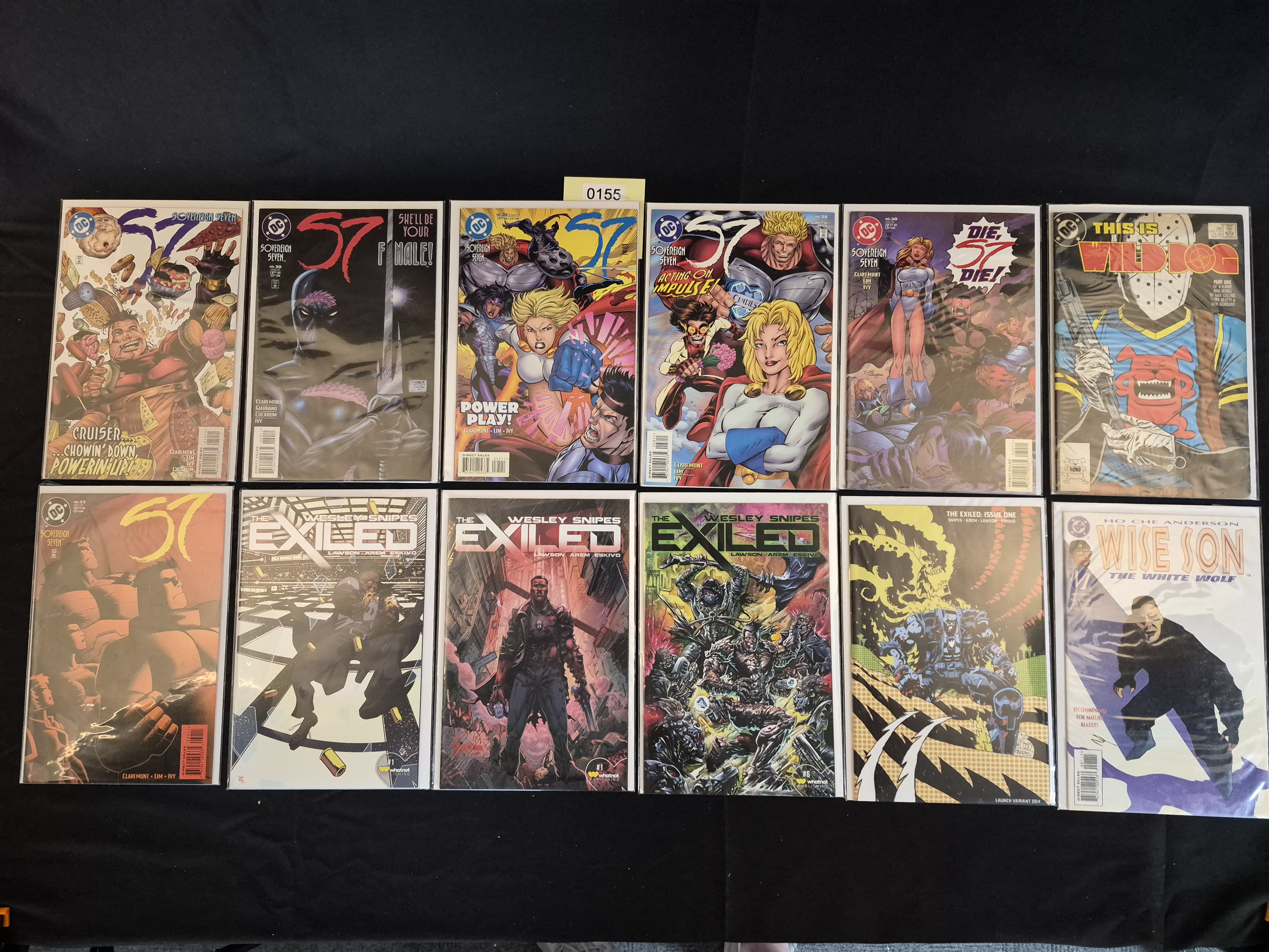 BID PER WHAT YOU SEE IN THE PHOTO, NOT THE AI GENERATED TITLES AND DESCRIPTIONS! A collection of 13 modern comic books and graphic novels primarily published by DC Comics and Whatnot Publishing. The lot includes a run of seven issues of DC Comics’ Sovereign Seven (issues #20, #22, #24, #25, #28, #30, and #32), one issue of DC’s This Is Wild Dog, and one issue of DC’s Wise Son: The White Wolf. The collection also features four issues related to The Wesley Snipes Exiled series from Whatnot Publishing, including at least one copy of Issue #6. All comics exhibit modern-era printing with glossy cover materials. The lot is secured with an inventory tag labeled “0155”.