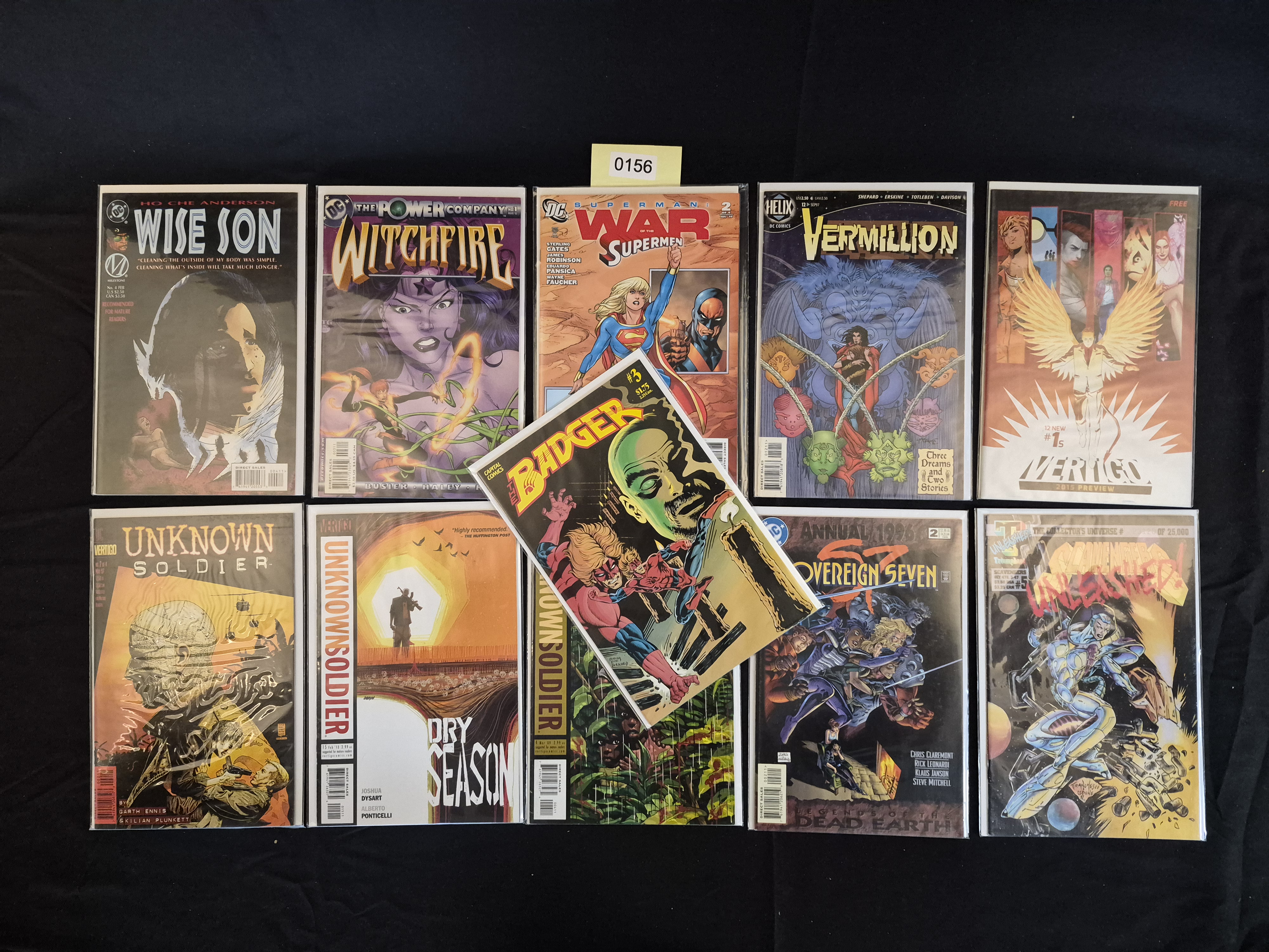 BID PER WHAT YOU SEE IN THE PHOTO, NOT THE AI GENERATED TITLES AND DESCRIPTIONS! A collection of 11 modern American comic books published by various companies including DC Comics, Vertigo, Milestone, Helix, and Capital Comics. The grouping spans publication dates primarily from the mid-1990s through the 2010s. Specific titles present include Wise Son (Milestone), Witchfire (DC/The Power Company), Superman: War of the Supermen (DC), Vermillion (Helix, Sep 97), Sovereign Seven Annual 1996 (DC), and multiple issues of Unknown Soldier (Vertigo). The issue Badger (Capital Comics) is positioned diagonally, overlapping the center of the arrangement. One issue, Scavengers Unleashed, is identified as a limited edition run, marked “#120 OF 25,000.” All comics are individually protected in clear plastic sleeves. A yellow adhesive inventory sticker marked “0156” is placed on the plastic sleeve protecting the Superman comic.