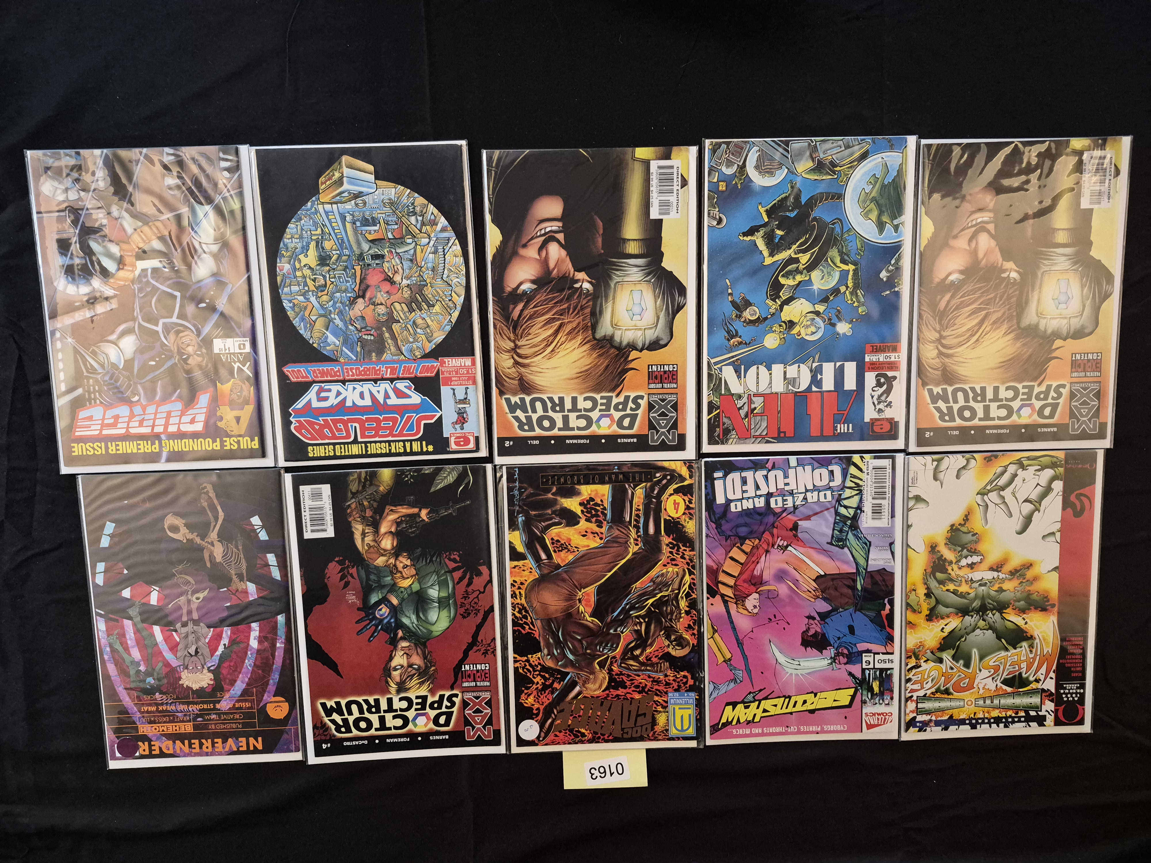 BID PER WHAT YOU SEE IN THE PHOTO, NOT THE AI GENERATED TITLES AND DESCRIPTIONS! A collection of 10 modern collectible comic books published by various independent and major-independent publishers, dating primarily from the early 1990s through the contemporary era. Each comic book is individually protected in a clear plastic sleeve with a backing board, consistent with standard modern comic storage practices. The lot includes titles such as Max Comics’ Doctor Spectrum (multiple issues, including #2 and #4), Epic Comics/Marvel’s The Alien Legion and Steelgrip Starkey #1 (a six-issue limited series), Millennium’s Doc Savage #4, Omega’s Mael’s Rage, Alterna Comics’ Scrimshaw, Behemoth’s Neverender, and Ania’s A Purge #0 (Premier Issue). Visible issue numbers range from #0 to #4. The collection features contemporary illustration styles and diverse genres, often categorized in the market as "Indie Comics Lot." A yellow adhesive note marked "0163" is visible above the top center item.
