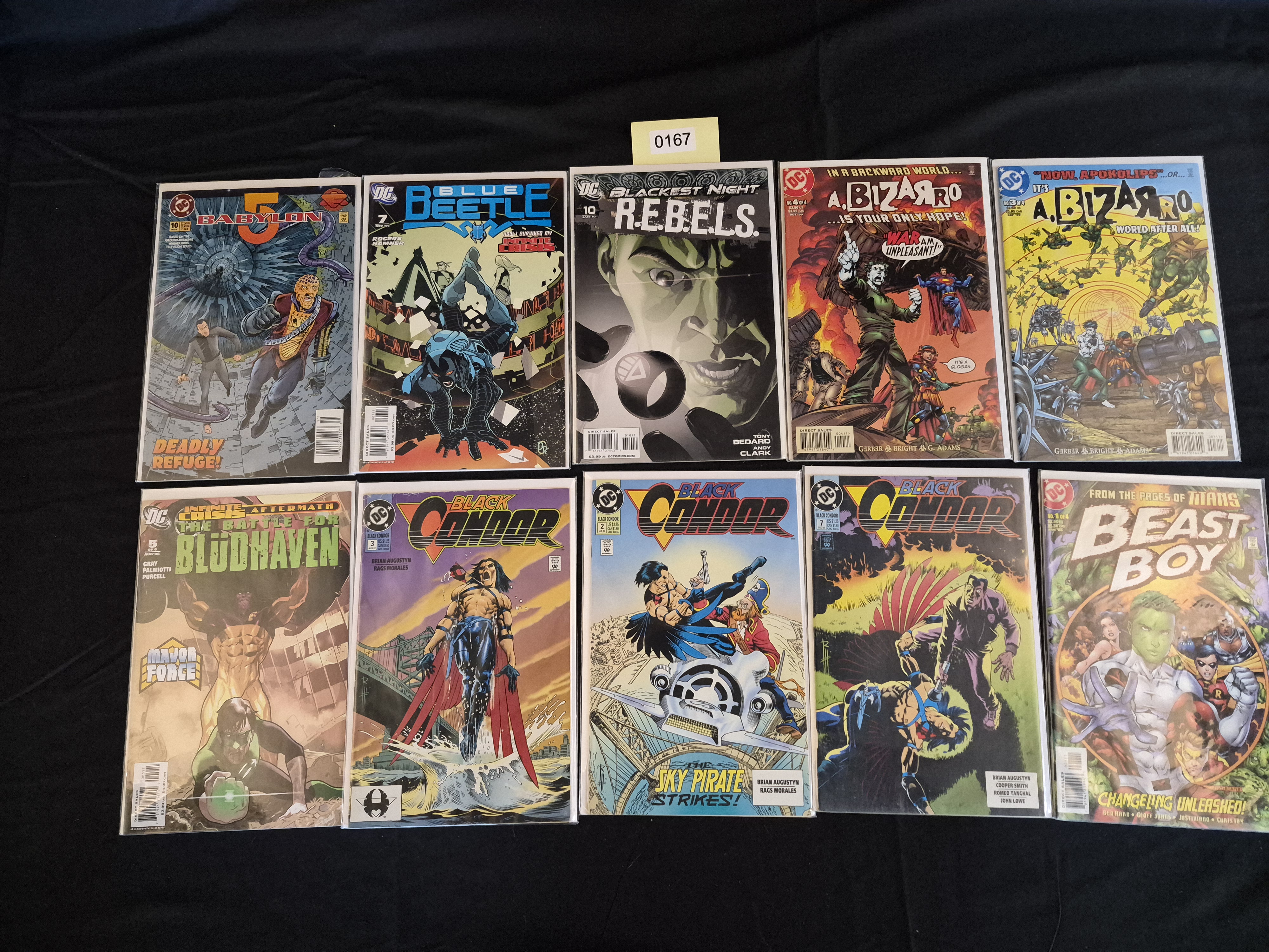 BID PER WHAT YOU SEE IN THE PHOTO, NOT THE AI GENERATED TITLES AND DESCRIPTIONS! A collection of 10 modern-style comic books, primarily published by DC Comics and related licensed properties. The collection is presented in two rows of five items each. The titles included are one issue of Babylon 5, one issue of Blue Beetle (No. 7), one issue of R.E.B.E.L.S. (No. 10, featuring the Blackest Night storyline), two issues from the A Bizarro World mini-series (No. 3 and No. 4 of 4), one issue of Infinite Crisis Aftermath The Battle for Blüdhaven (No. 5), three issues of Black Condor (Nos. 1, 3, and 7), and one issue of Beast Boy (No. 1 of 4). All comics are individually protected in clear plastic sleeves with backing boards. A yellow sticky note labeled “0167” is affixed to the plastic sleeve covering the R.E.B.E.L.S. comic. The comics exhibit high color saturation and sharp printing typical of well-preserved Modern Age publications.