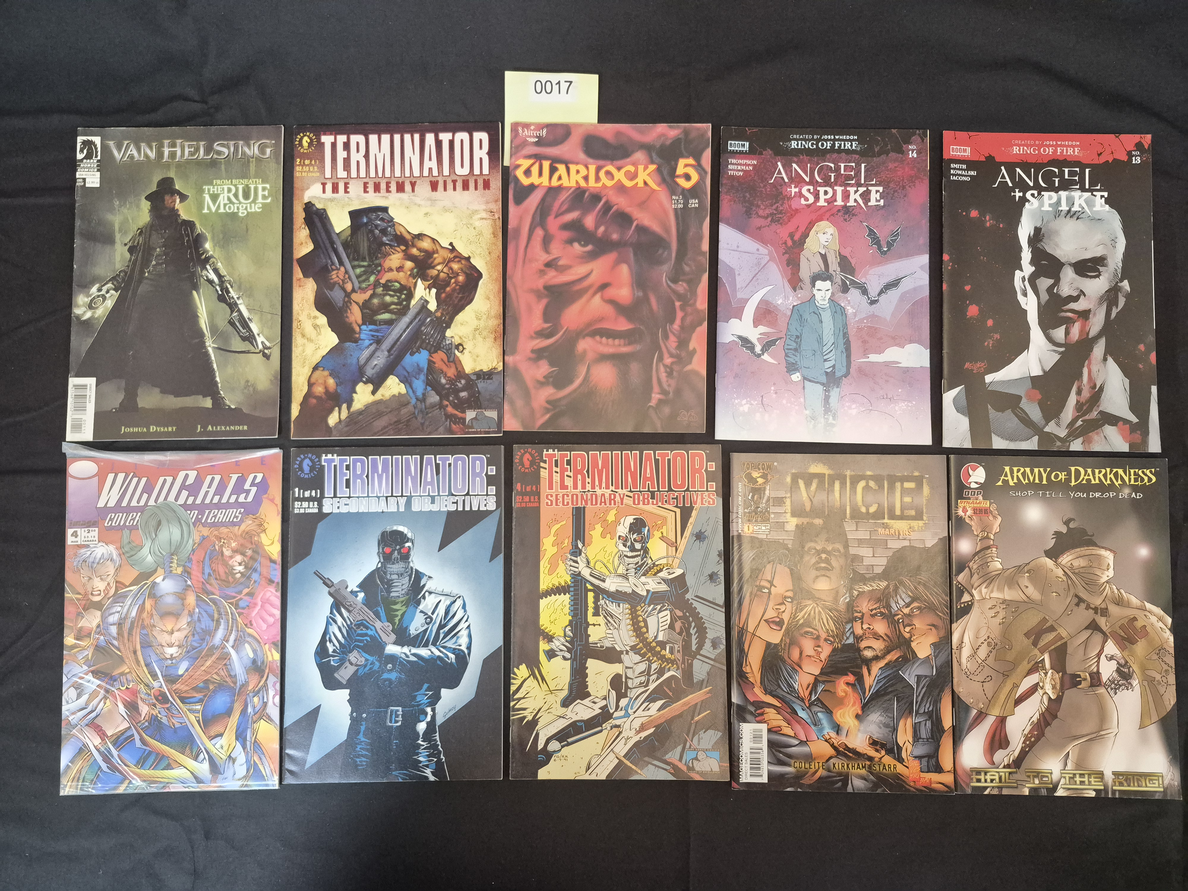 BID PER WHAT YOU SEE IN THE PHOTO, NOT THE AI GENERATED TITLES AND DESCRIPTIONS! The collection consists of 10 American comic books, primarily published during the Modern Age, featuring licensed and original action, horror, and science fiction properties. The books are softcover periodicals with colorful printed covers. Publishers represented include Dark Horse Comics, BOOM! Studios, Image Comics, Aircel, Dynamite, and Top Cow. Specific titles included are Van Helsing: The Rue Morgue (Dark Horse, One-Shot); Terminator: The Enemy Within #2 (of 4) (Dark Horse, 1991); Warlock 5 #3 (Aircel); Angel + Spike #13 and #14 (BOOM! Studios); WildC.A.T.s #4 (Image Comics); Terminator: Secondary Objectives #1 (of 4) and #4 (of 4) (Dark Horse); V.I.C.E. #1 (Top Cow/Image Comics); and Army of Darkness #1 (Dynamite). Visible cover prices range from $1.70 to $2.99 U.S. An inventory sticker marked “0017” is adhered to the black background above the grouping.