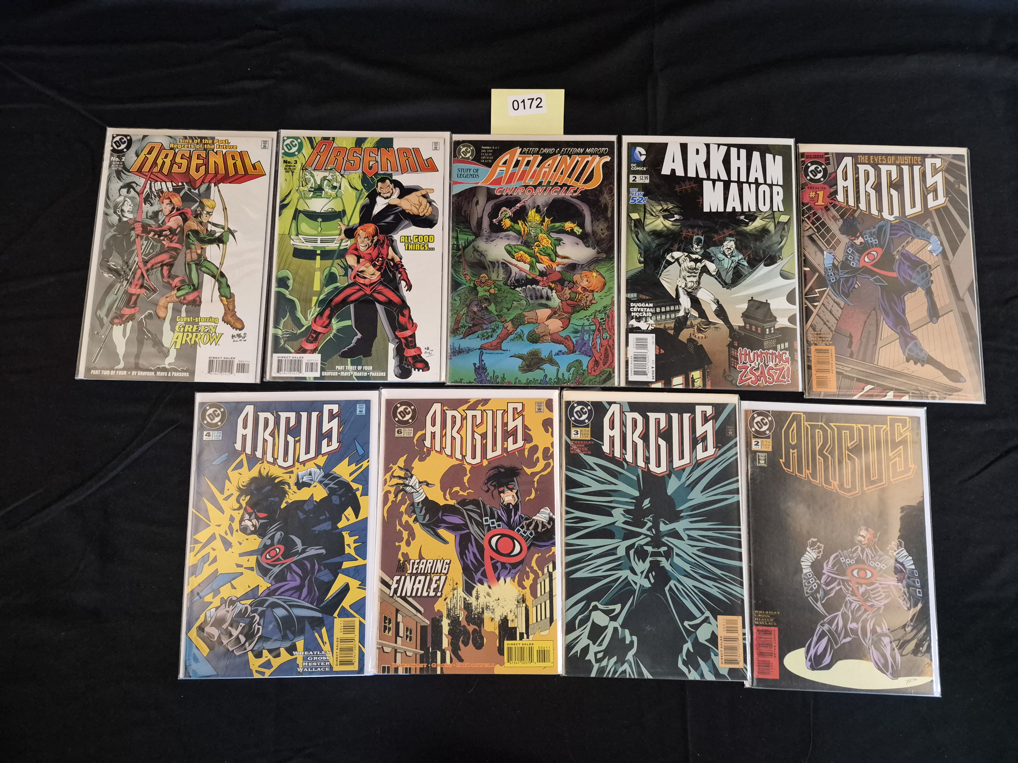BID PER WHAT YOU SEE IN THE PHOTO, NOT THE AI GENERATED TITLES AND DESCRIPTIONS! A collection of 10 American comic books published by DC Comics, dating primarily from the 1990s and 2010s (Modern Age and New 52 eras). The collection features a variety of titles, with the majority being issues from the 1995 Argus mini-series. The full collection includes: two issues of Arsenal (Nos. 2 and 3, 1998), one issue of The Atlantis Chronicles (No. 3 of 7, 1990), one issue of Arkham Manor (No. 2, marked “The New 52!”, 2014), and five issues of Argus (Nos. 1, 3, 4, 5, 6, and 7, 1995). All 10 items are individually protected in clear plastic bags. A yellow adhesive label marked “0172” is visible above the center of the display.