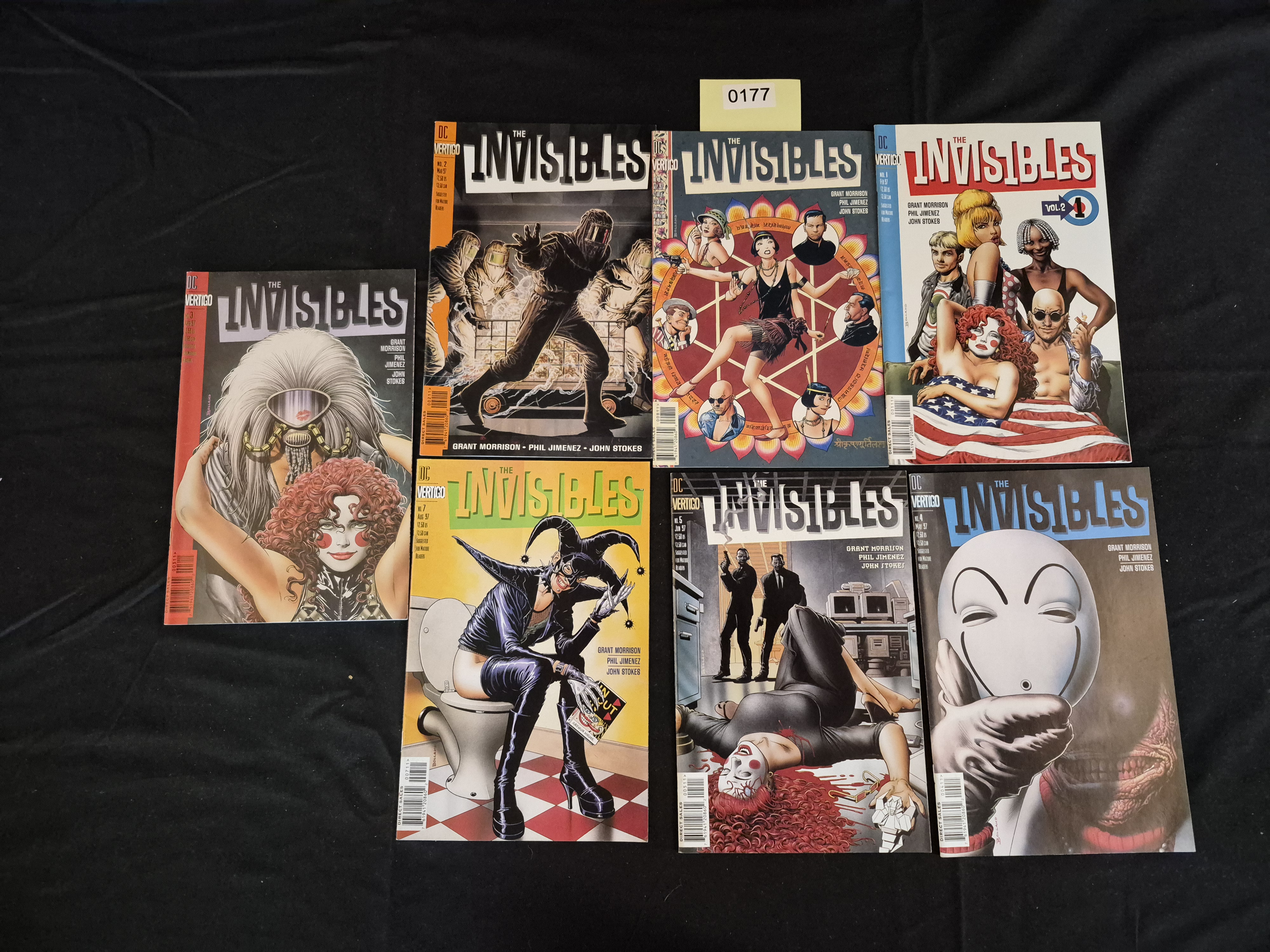 BID PER WHAT YOU SEE IN THE PHOTO, NOT THE AI GENERATED TITLES AND DESCRIPTIONS! A collection of seven standard American comic periodicals from the DC Vertigo series The Invisibles, Volume 2. The lot includes issues No. 1 (Feb 1997), No. 2 (Mar 1997), No. 3 (Apr 1997), No. 4 (May 1997), No. 5 (Jun 1997), No. 6 (Jul 1997), and No. 7 (Aug 1997). The series was created by Grant Morrison with art contributions from Phil Jimenez and John Stokes, among others. Each issue features the DC Vertigo imprint and the advisory “Suggested for Mature Readers.” The items are standard periodical format with paper covers displaying diverse, brightly colored, mature-themed artwork. A yellow sticky note labeled “0177” is present in the image above the collection.