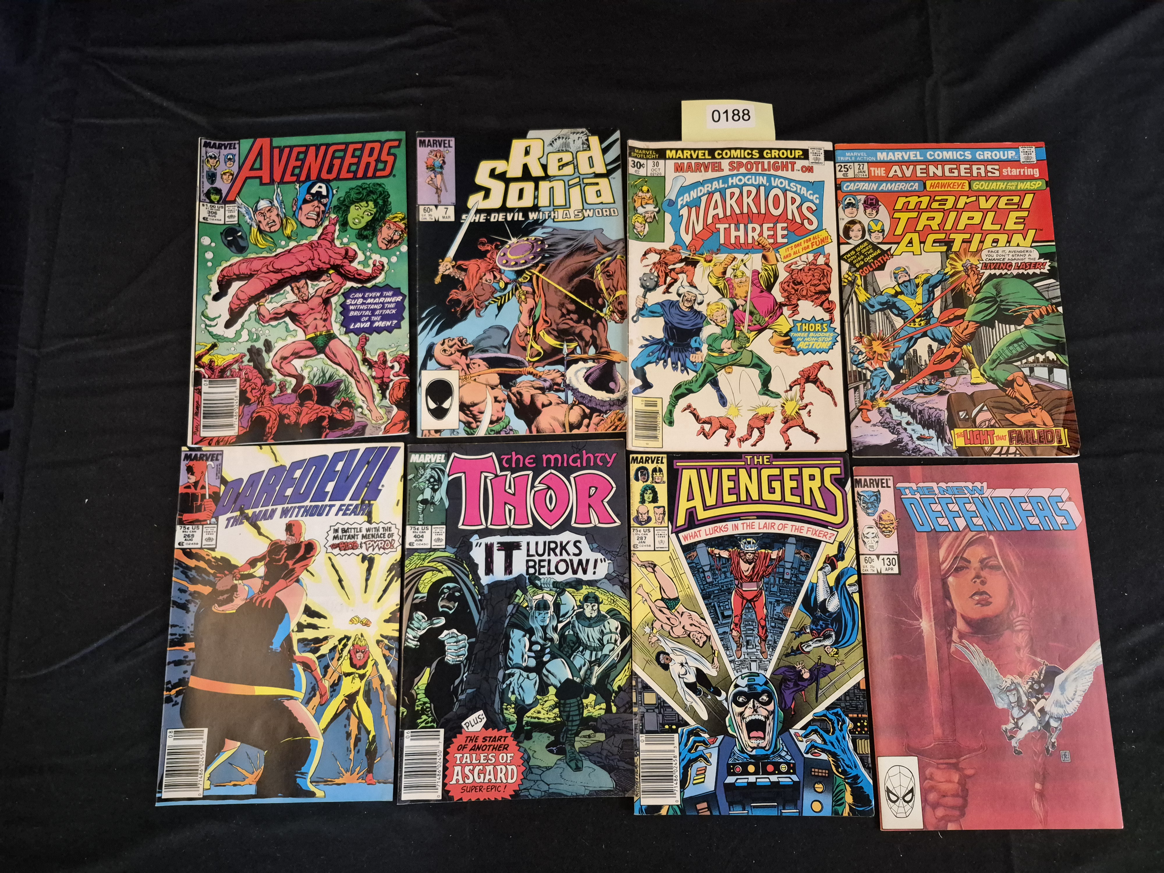 BID PER WHAT YOU SEE IN THE PHOTO, NOT THE AI GENERATED TITLES AND DESCRIPTIONS! A collection of eight standard-format American comic books published by Marvel Comics, printed on paper with full-color covers. The issues reflect titles primarily spanning the Bronze and Copper Age periods. Specific titles include Avengers (e.g., issue #306, $1.00), Red Sonja (e.g., issue #7, 60¢), Marvel Spotlight on Warriors Three (e.g., issue #30, 30¢), Marvel Triple Action (e.g., issue #27, 25¢), Daredevil: The Man Without Fear (e.g., issue #269, 75¢), The Mighty Thor (e.g., issue #404, 75¢), The Avengers (e.g., issue #287, 75¢), and The New Defenders (e.g., issue #130, 60¢). An inventory sticker marked 0188 is affixed to the upper margin of the Marvel Spotlight issue.