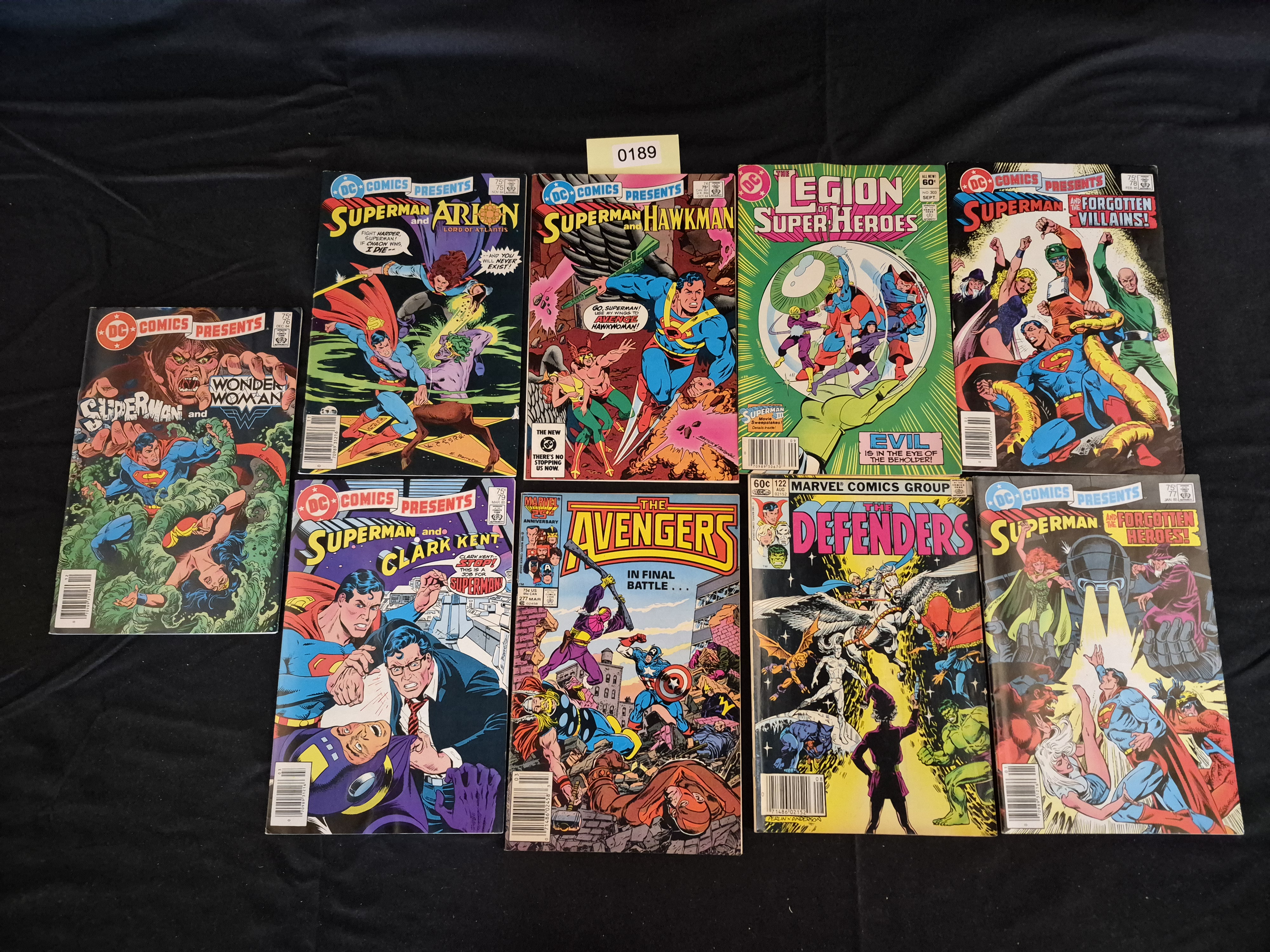 BID PER WHAT YOU SEE IN THE PHOTO, NOT THE AI GENERATED TITLES AND DESCRIPTIONS! A collection of nine Copper Age comic books published primarily in the mid-1980s by DC Comics and Marvel Comics Group. The lot consists of six consecutive issues of DC Comics Presents (#74, #75, #76, #77, #78, #79), one issue of The Legion of Super-Heroes (#300), one issue of The Avengers (#277), and one issue of The Defenders (#122). The cover prices range from 60¢ to 75¢. The comics are printed on standard newsprint paper and feature full-color covers depicting various superhero team-ups and conflicts. A yellow inventory tag marked “0189” is adhered to the top center of the grouping.