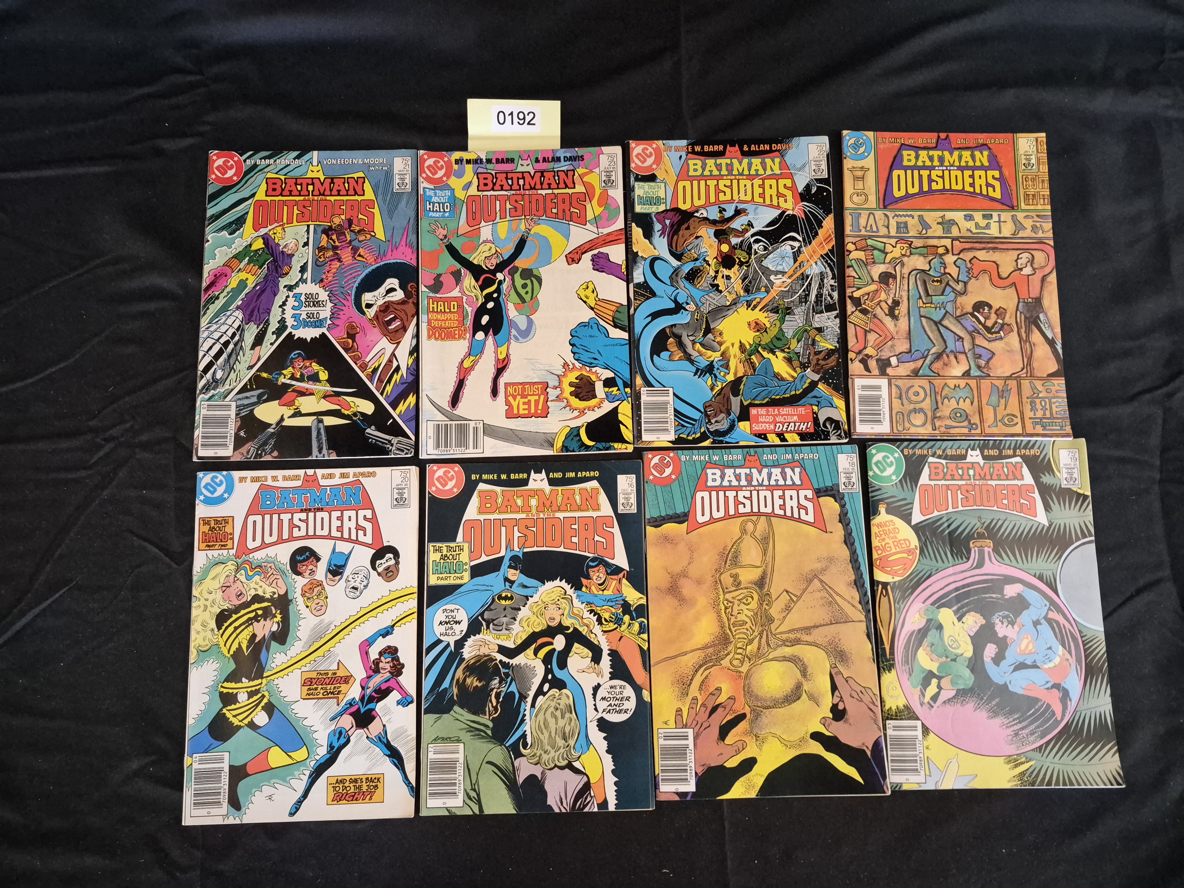 BID PER WHAT YOU SEE IN THE PHOTO, NOT THE AI GENERATED TITLES AND DESCRIPTIONS! A collection of eight American staple-bound comic books from the DC Comics title Batman and the Outsiders, dating from the Copper Age (1984-1985). The lot includes issues #12, #15, #16, #17, #18, #21, #22, and #23. The creative teams featured include Mike W. Barr, Jim Aparo, and Alan Davis. All issues display the DC logo, the Comics Code Authority seal, and a cover price of 75¢. The lot is marked with an auction inventory sticker labeled “0192” affixed centrally.