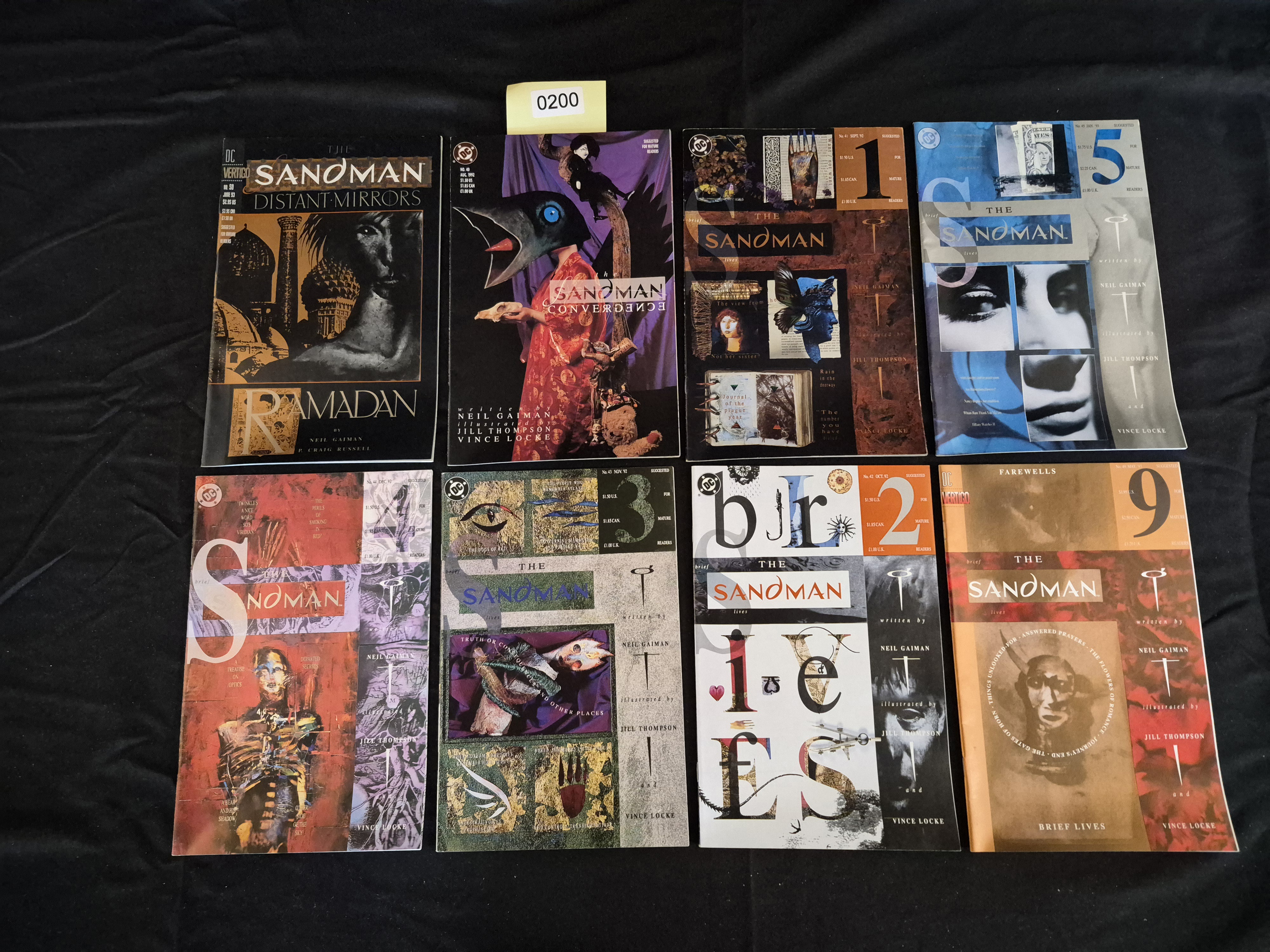 BID PER WHAT YOU SEE IN THE PHOTO, NOT THE AI GENERATED TITLES AND DESCRIPTIONS! A collection of eight individual comic book issues from the DC Comics Vertigo imprint series The Sandman, written by Neil Gaiman. The lot includes six issues from the nine-part “Brief Lives” story arc (issues #41, #42, #43, #44, #45, and #49), along with issue #40 (“Convergences”) and issue #50 (“Distant Mirrors”). The issues are credited to Neil Gaiman, with illustrations by artists including Jill Thompson and Vince Locke. The covers feature mixed media and photographic collage designs typical of the 1990s Vertigo style. Visible publication dates range from August 1992 to June 1993. An inventory tag marked “0200” is affixed to the top edge of one volume.