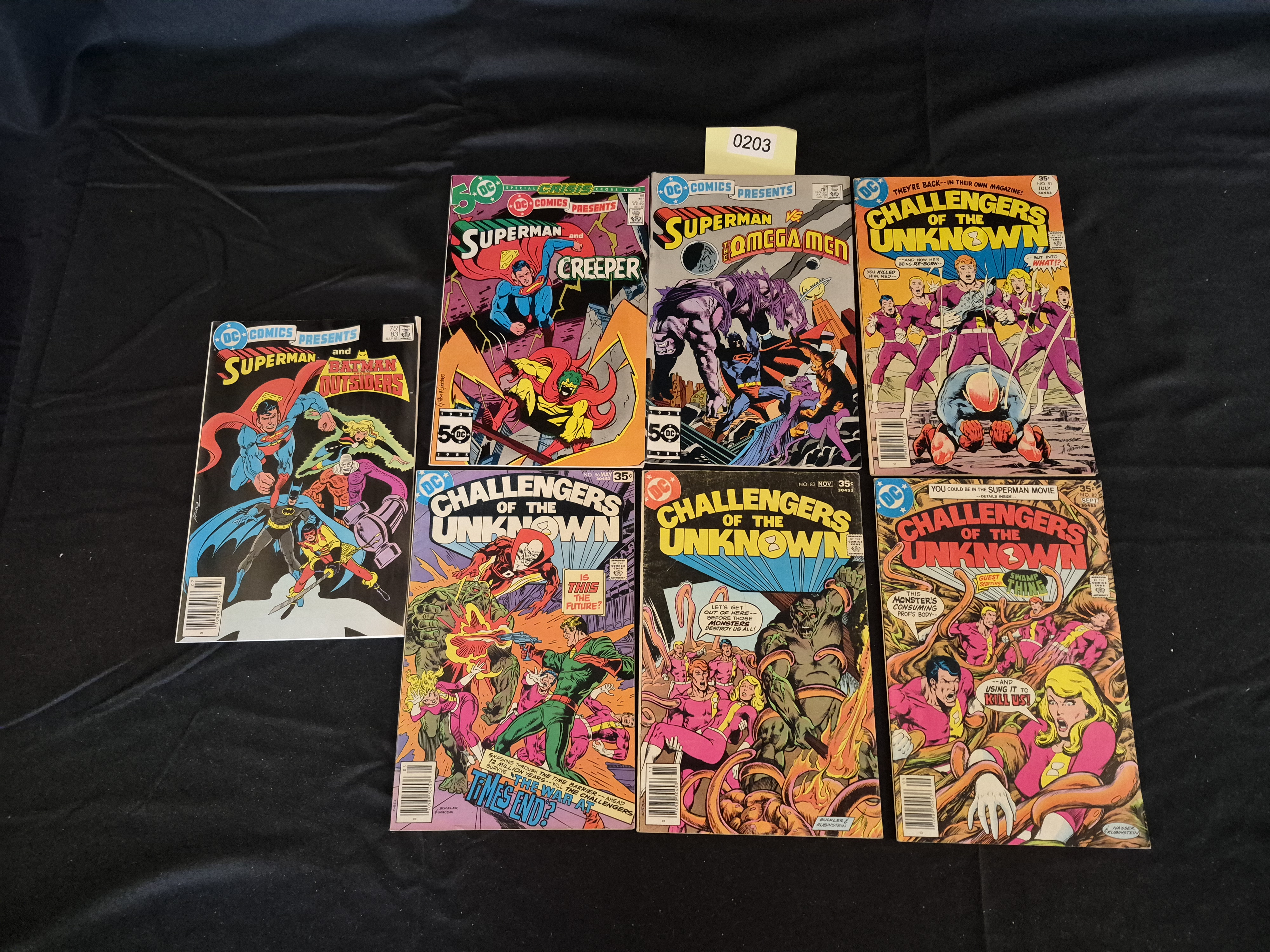 BID PER WHAT YOU SEE IN THE PHOTO, NOT THE AI GENERATED TITLES AND DESCRIPTIONS! A collection of seven vintage DC Comics issues published during the Bronze and Modern Age eras, primarily dating to the early-to-mid 1980s. The lot includes three issues of DC Comics Presents and four issues of Challengers of the Unknown. The DC Comics Presents issues feature team-ups between Superman and Batman and the Outsiders, Superman and The Creeper, and Superman versus The Omega Men. The Creeper and Omega Men issues feature the DC 50th Anniversary logo (1935-1985) and are priced at 50 cents and 75 cents respectively. The four visible Challengers of the Unknown issues are identified as No. 81, No. 82 (Guest Starring Swamp Thing), No. 83, and No. 86, all bearing a 35-cent cover price. The comic books are constructed of typical color-printed paper material. An inventory sticker marked 0203 is affixed to the top edge of one issue.
