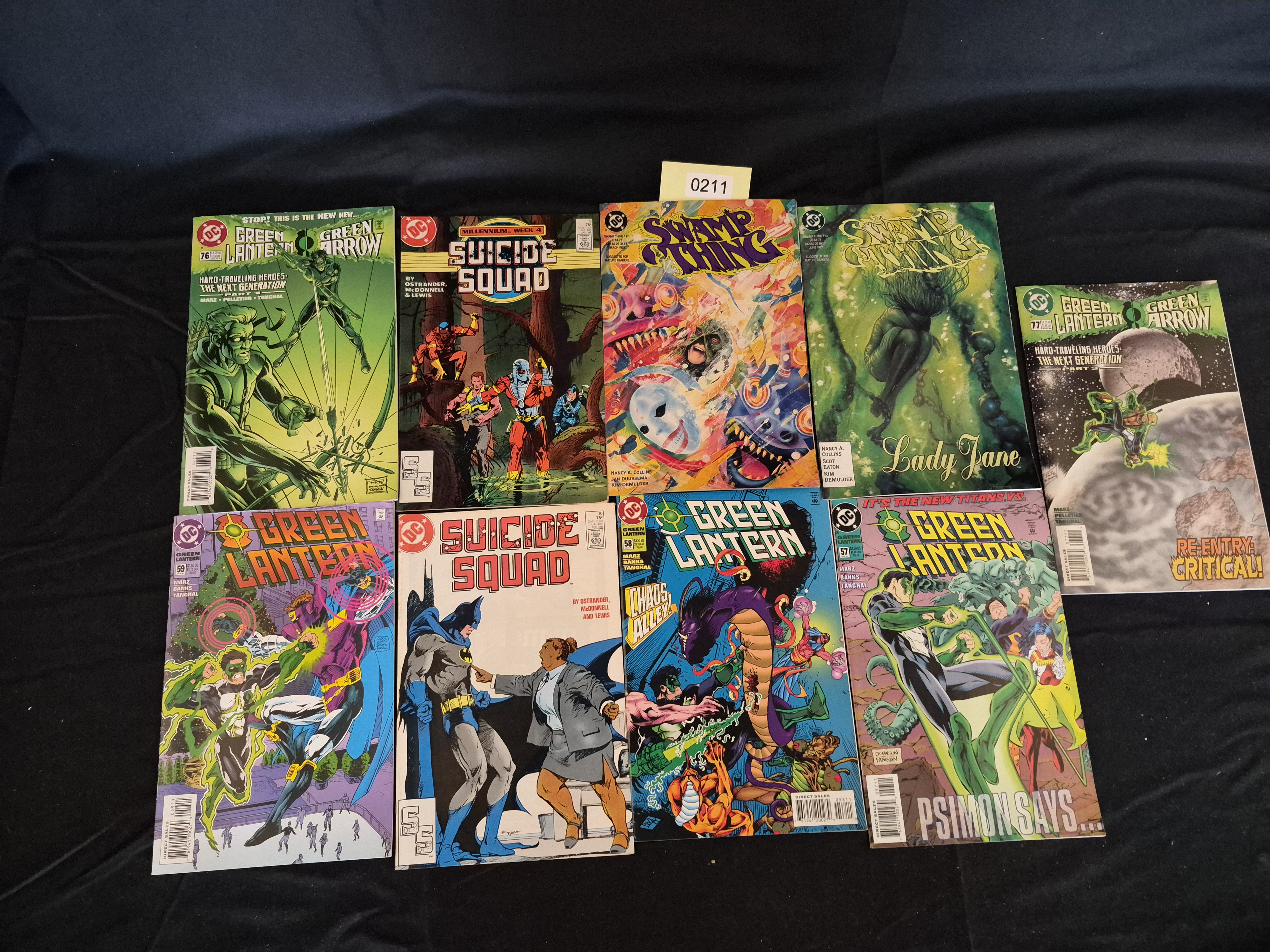 BID PER WHAT YOU SEE IN THE PHOTO, NOT THE AI GENERATED TITLES AND DESCRIPTIONS! A collection of nine (9) late Modern Age DC Comics, published by DC Comics, featuring various superhero and horror titles. The lot is predominantly composed of Green Lantern and Green Arrow titles, alongside issues of Suicide Squad and Swamp Thing. Key issues visible include Suicide Squad #10 (Vol 1, featuring Amanda Waller and Batman on the cover, published circa 1988), Green Lantern/Green Arrow #76 and #77, Green Lantern #57, #58, and #59, and two issues of Swamp Thing (including one issue marked #120). One issue of Suicide Squad is marked “Millennium: Week 4.” All items are standard paperback comic books featuring full-color covers, the DC Comics logo, and standard UPC barcodes. One yellow sticky note bearing the numerical marking 0211 is present on the top row.