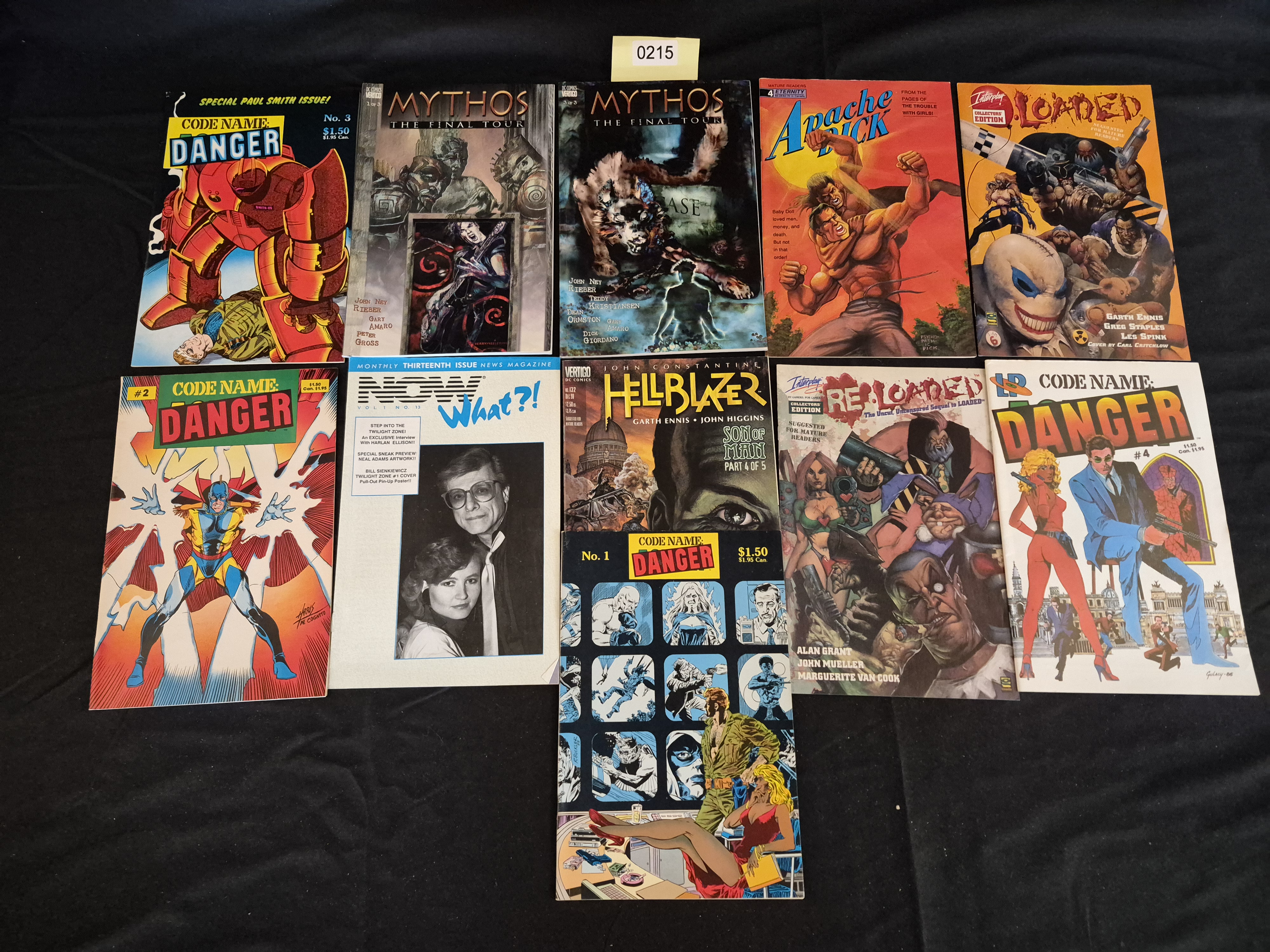 BID PER WHAT YOU SEE IN THE PHOTO, NOT THE AI GENERATED TITLES AND DESCRIPTIONS! A collection of eleven publications consisting primarily of independent and mature-reader comic books printed on paper and card stock, dating from the late 20th century. The collection includes titles from various publishers such as DC Comics/Vertigo and Eternity. Specific titles present are four issues of Code Name: Danger (including No. 1, No. 2, No. 3, and No. 4), two issues of Mythos: The Final Tour (1 of 3 and 3 of 3), one issue of Hellblazer No. 1 featuring the “Son of Man” storyline, Apache Dick No. 4, Loaded Collectors’ Edition, Re-Loaded Collectors’ Edition, and one copy of the Now What?! Monthly Thirteenth Issue News Magazine (Vol 1 No. 13). Cover texts indicate original pricing ranging from $1.50 to $2.50. An inventory sticker marked 0215 is visible above the items.