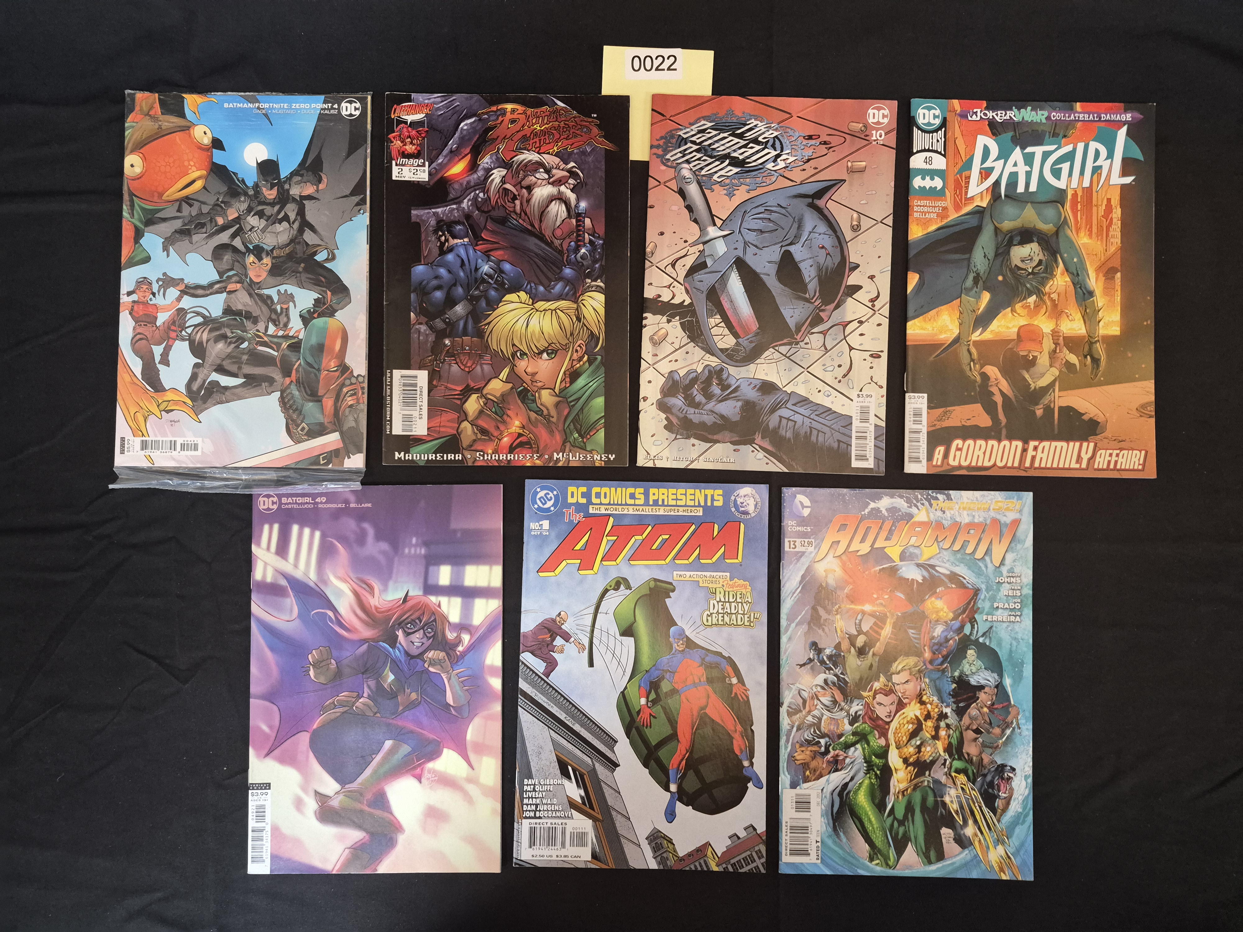 BID PER WHAT YOU SEE IN THE PHOTO, NOT THE AI GENERATED TITLES AND DESCRIPTIONS! A collection of seven modern and contemporary American comic books, primarily published by DC Comics, featuring popular characters from the DC Universe. The collection includes the key identified issue, Batman/Fortnite: Zero Point #4 (DC Comics, 2021), noted as the Dan Mora Variant Cover, which is sealed in its original polybag. This issue carries a cover price of $5.99. Other titles in the collection include Battle Chasers #2 (Image Comics/Cliffhanger!, cover price $2.50), The Batman’s Grave #10 (DC Comics, cover price $3.99), two issues of Batgirl (#48 and #49, cover prices $3.99 each, with #49 being a variant cover), DC Comics Presents The Atom #1 (DC Comics, cover price $2.50), and Aquaman (The New 52!) #13 (DC Comics, cover price $2.99). The comics are standard print format.