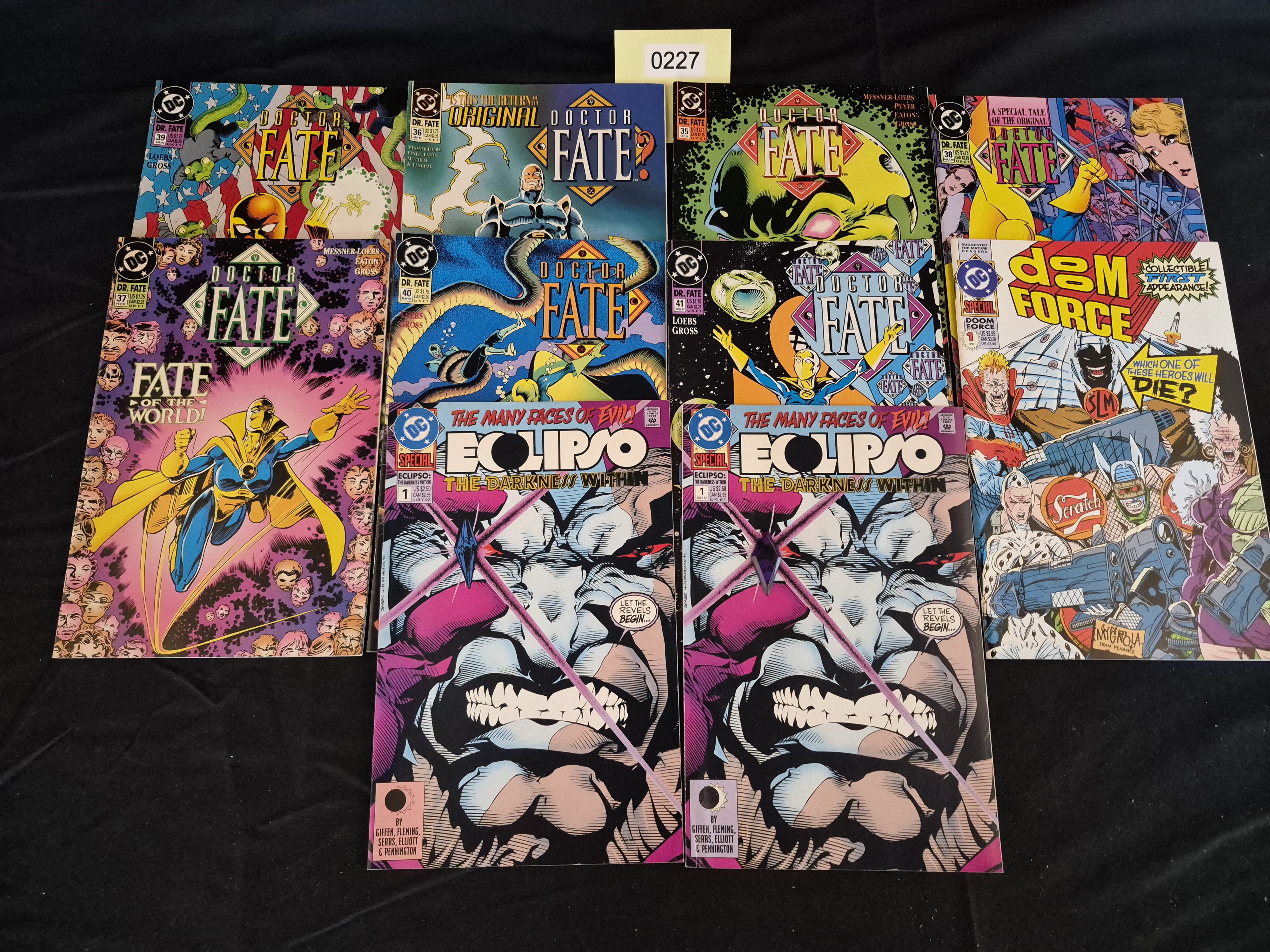 BID PER WHAT YOU SEE IN THE PHOTO, NOT THE AI GENERATED TITLES AND DESCRIPTIONS! This is a collection of ten (10) Modern Age DC Comics publications dating primarily from 1991 and 1992, centered around the character Doctor Fate and the Eclipso crossover event. The lot includes seven unique issues of the series Doctor Fate (#35, #36, #37, #39, #40, and #41, plus one special tale issue), one copy of the DC Special D8M Force, and two duplicate copies of Eclipso: The Darkness Within #1 (July 1992). The books are standard paper comic books, exhibiting vibrant colors typical of the period’s superhero artwork. Price markings visible on the covers range from US $1.75 to $2.95. The collection is associated with inventory sticker “0227”.
