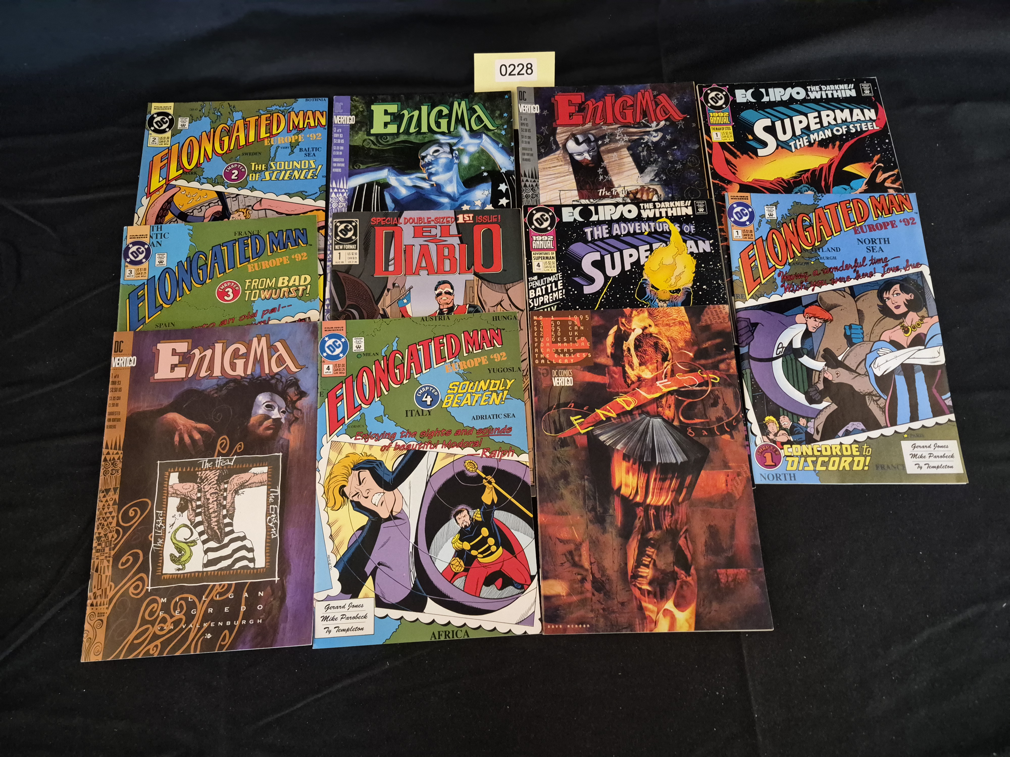 BID PER WHAT YOU SEE IN THE PHOTO, NOT THE AI GENERATED TITLES AND DESCRIPTIONS! A collection of twelve American comic books published primarily by DC Comics and its mature-audience imprint, Vertigo, dating from the early to mid-1990s (circa 1992–1995). The lot consists of standard comic book format issues constructed from printed paper and cardstock covers featuring colorful artwork characteristic of the period. The collection includes four issues from the Elongated Man: Europe ’92 miniseries (Chapters 1, 2, 3, and 4), three numbered issues of Peter Milligan’s Enigma (Issues 1, 2, and 3 of 8), two 1992 Annuals featuring Superman (Superman: The Man of Steel Annual No. 1 and The Adventures of Superman Annual No. 4), El Diablo Special Double-Sized 1st Issue (1992), and The Endless Gallery No. 1 (1995), published under the DC Comics Vertigo imprint.