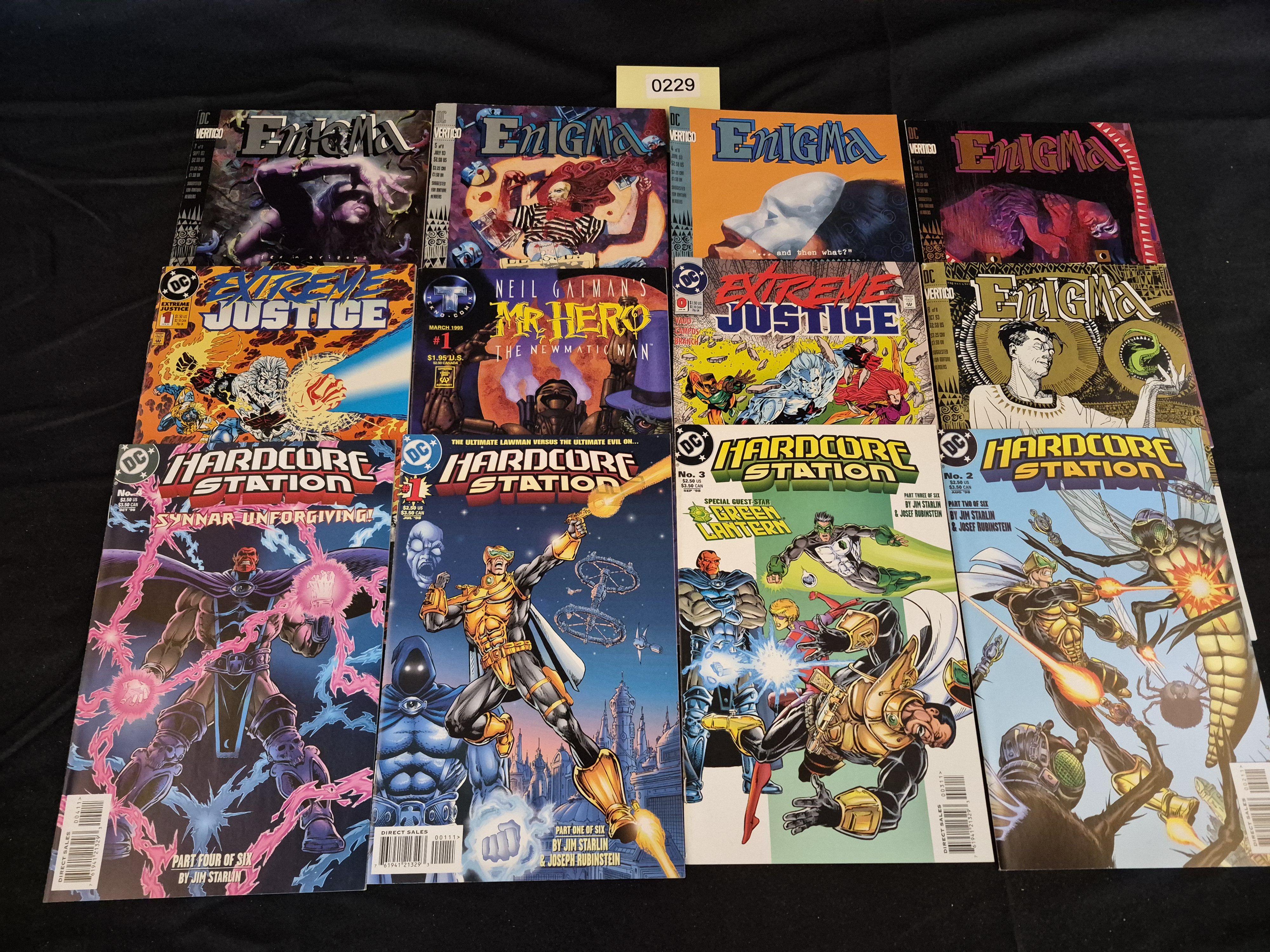 BID PER WHAT YOU SEE IN THE PHOTO, NOT THE AI GENERATED TITLES AND DESCRIPTIONS! A collection of twelve Modern Age comic books, primarily published by DC Comics and its Vertigo imprint during the mid-to-late 1990s. The lot includes various titles from the superhero and mature-readers genres. The construction consists of paper covers and interiors, featuring full-color illustrations typical of the period. All items bear standard DIRECT SALES barcodes. Key titles present include four issues of the DC mini-series Hardcore Station (1998), specifically issues 1, 2, 3, and 4, written by Jim Starlin and Josef Rubinstein. Web intelligence confirms that the Hardcore Station series is typically marketed as a complete 6-issue set. Also present are five issues of Enigma (DC Vertigo imprint, early 1990s), two issues of Extreme Justice (DC Comics), and one issue of Neil Gaiman’s Mr. Hero: The Newmatic Man #1 (Tekno Comix, 1995).