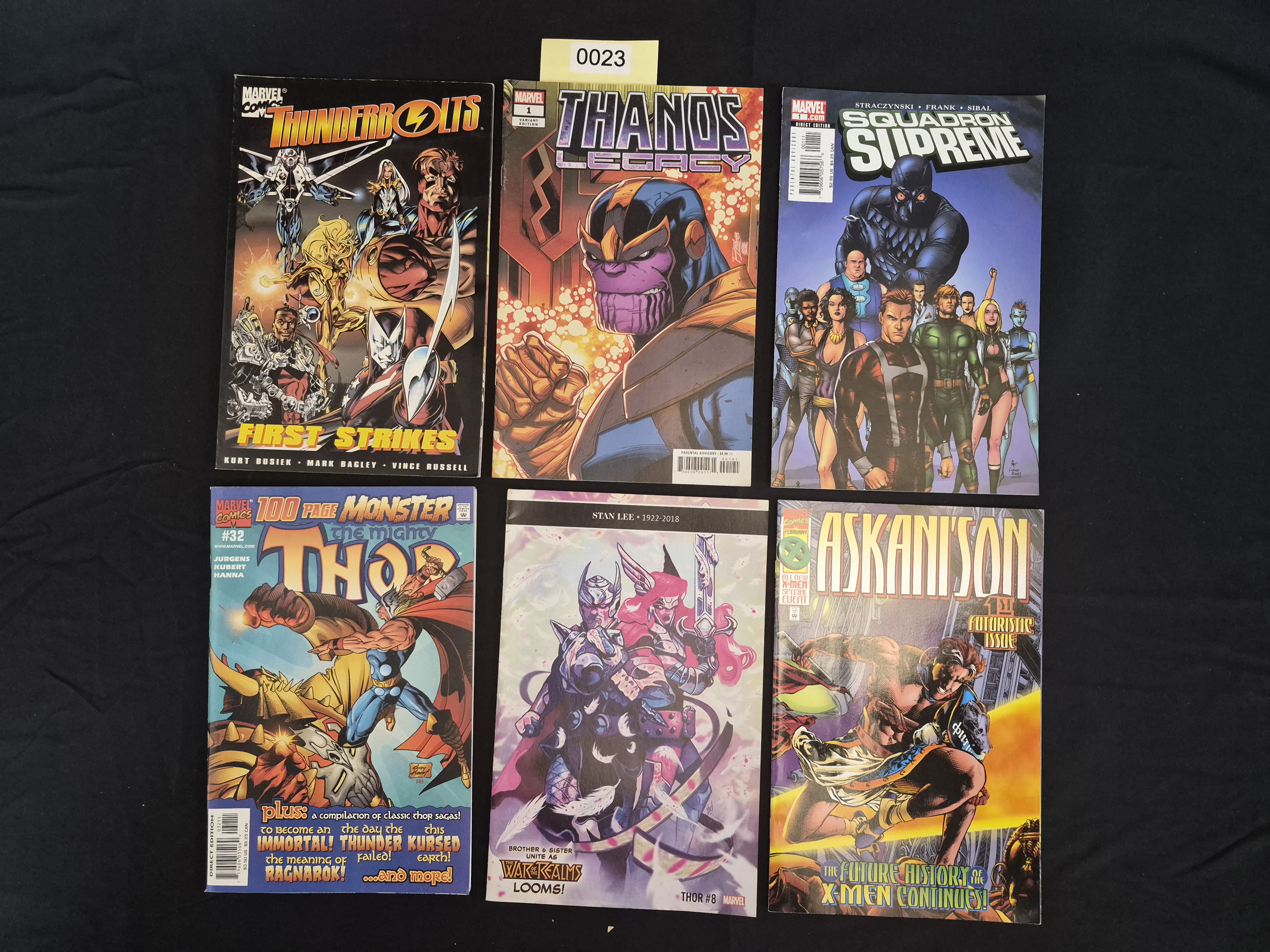 BID PER WHAT YOU SEE IN THE PHOTO, NOT THE AI GENERATED TITLES AND DESCRIPTIONS! A collection of six modern standard format comic books, primarily published by Marvel Comics, manufactured from standard glossy paper stock. The collection includes titles such as Thunderbolts First Strikes, Thanos’ Legacy #1 (Variant Edition), Squadron Supreme #1 (Direct Edition, consistent with the 2006 series identified in market research), The Mighty Thor #32 (100 Page Monster), a Thor issue featuring a Stan Lee tribute and referencing The War of the Realms (Thor #8), and Askari Son #1 (1st Futuristic Issue). The Squadron Supreme title is frequently traded in the current market, often associated with the 2006 limited series.