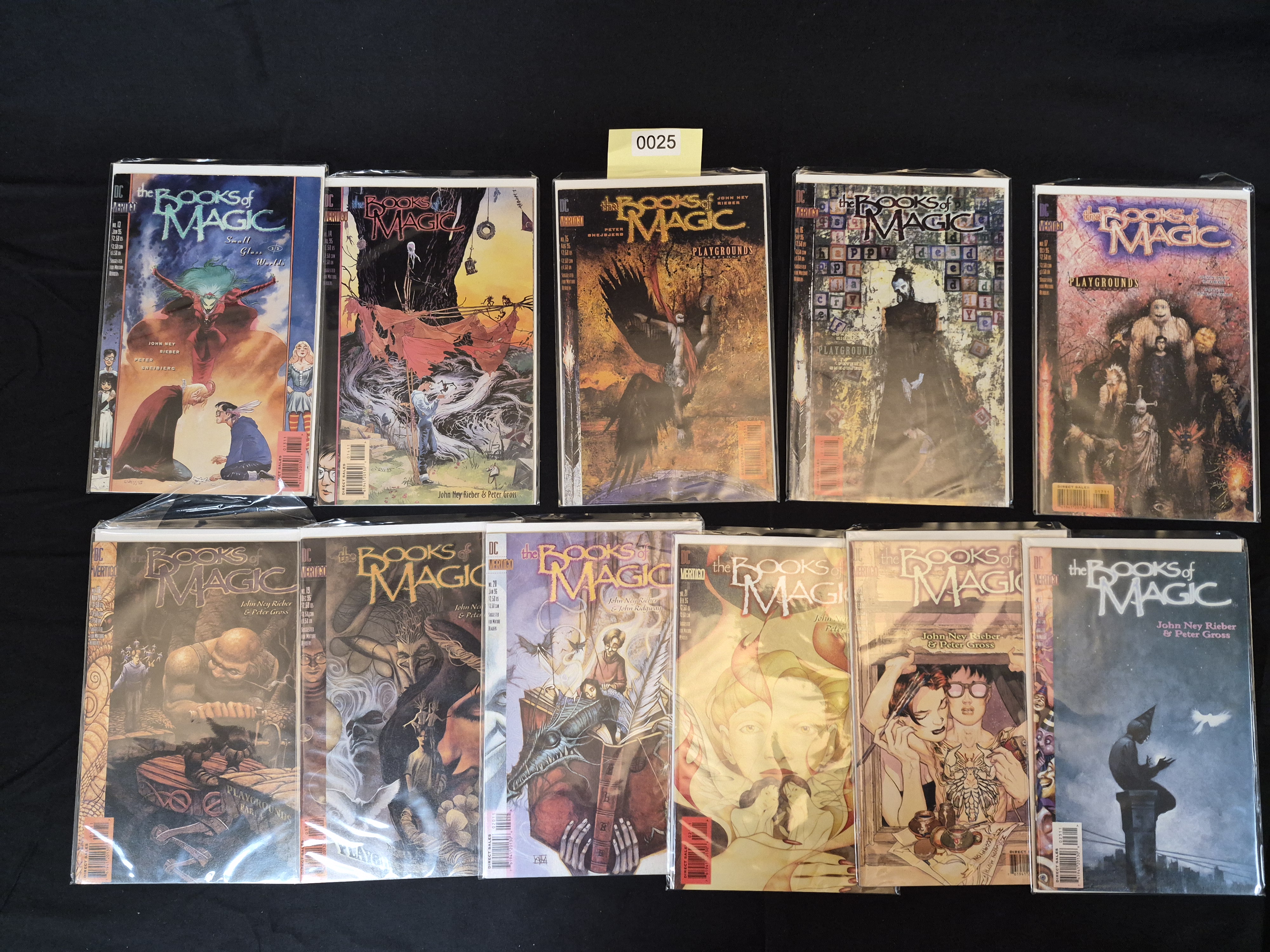 BID PER WHAT YOU SEE IN THE PHOTO, NOT THE AI GENERATED TITLES AND DESCRIPTIONS! A collection of 11 sequential comic books from the DC Comics/Vertigo imprint series, The Books of Magic. The lot includes issues #13 (June 1995) through #23 (April 1996), published between June 1995 and April 1996. These are standard saddle-stitched paper periodicals featuring fantasy-style color cover artwork. Key creative personnel listed across the run include writer John Ney Rieber and artists such as Peter Snejbjerg and Peter Gross. The series is recognized as part of The Sandman Universe Classics. Each comic book is individually protected within a clear plastic sleeve. A small yellow sticker marked “0025” is present near the center top of the first item’s protective sleeve.
