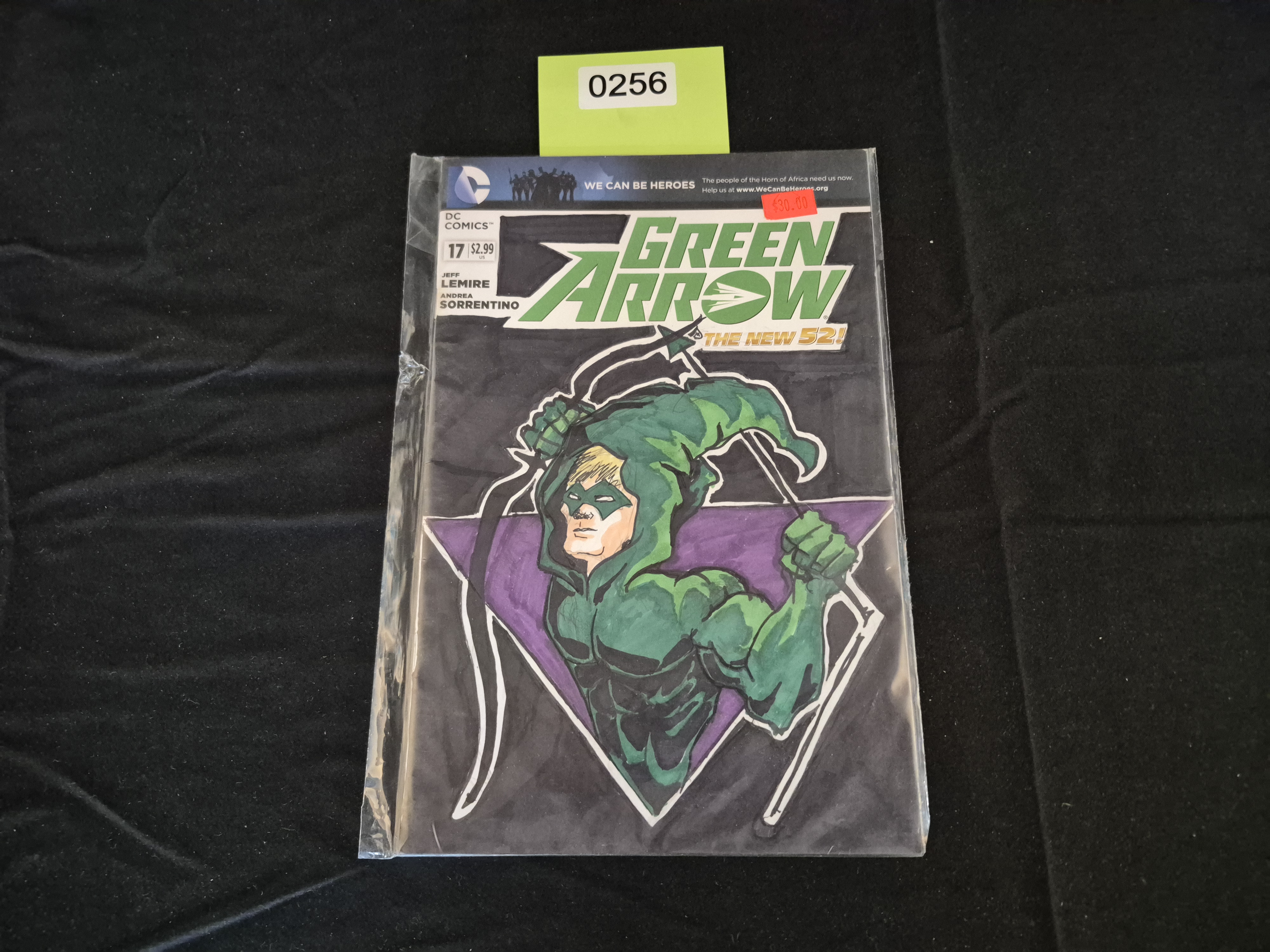 BID PER WHAT YOU SEE IN THE PHOTO, NOT THE AI GENERATED TITLES AND DESCRIPTIONS! A single modern comic book, DC Comics’ Green Arrow Issue 17 from The New 52 publishing period. This is a Blank Sketch Variant cover edition, featuring a custom, hand-drawn illustration of the character Green Arrow. The artwork is executed in marker or ink, primarily using green and purple tones against a black background, depicting the Emerald Archer drawing his bow. Printed text visible on the cover confirms the issue number 17, the original price $2.99 US, and creator credits for Jeff Lemire and Andrea Sorrentino. The comic is protected within a clear plastic sleeve.
