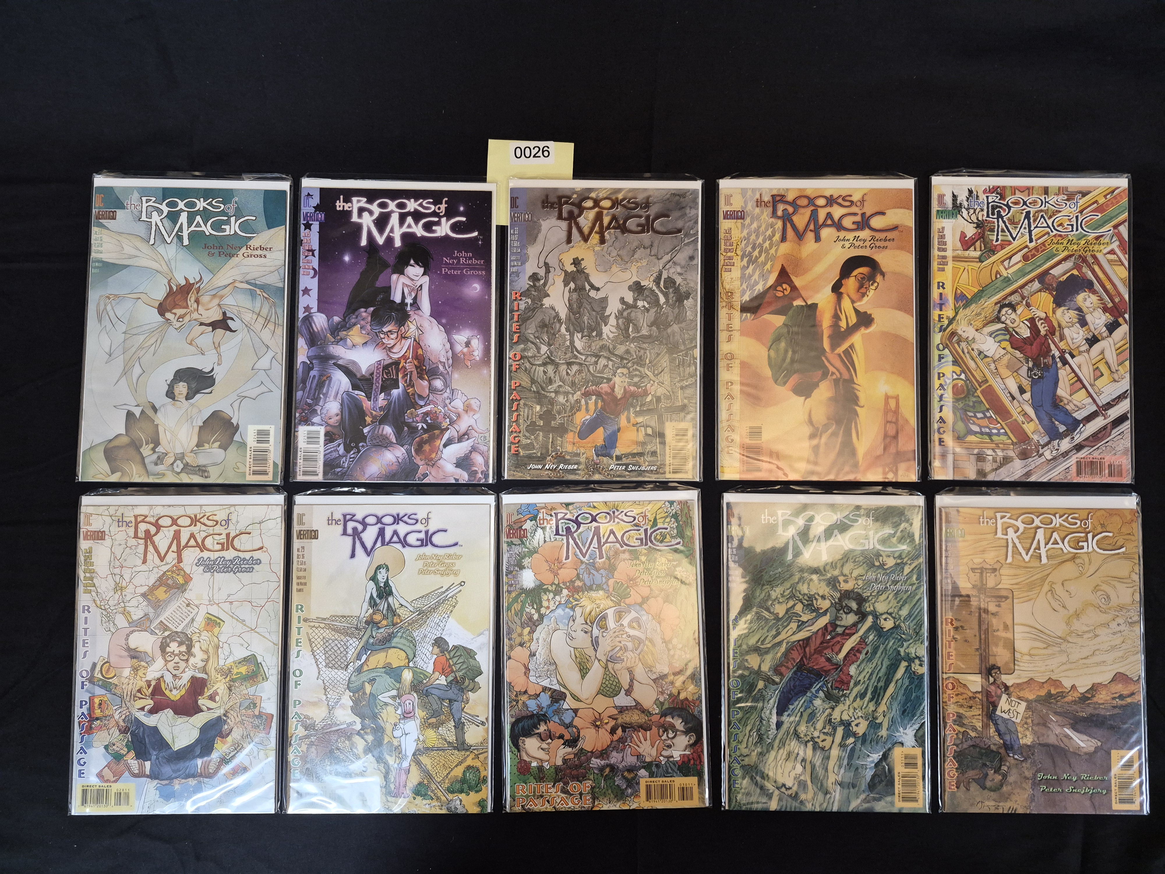 BID PER WHAT YOU SEE IN THE PHOTO, NOT THE AI GENERATED TITLES AND DESCRIPTIONS! A collection of 10 Modern Age comic books from the DC Comics/Vertigo imprint series, The Books of Magic. These issues prominently feature the “Rites of Passage” storyline, which is visible on several covers. The comics are standard Modern Age format, featuring full-color covers and interior pages. Visible creator credits include writing by John Ney Rieber and artwork by Peter Gross and Peter Snejbjerg. Each issue displays the DC/Vertigo branding, a $2.50 US cover price, and a “DIRECT SALES” barcode. The collection is organized in two rows of five items. An inventory tag labeled “0026” is associated with the lot.