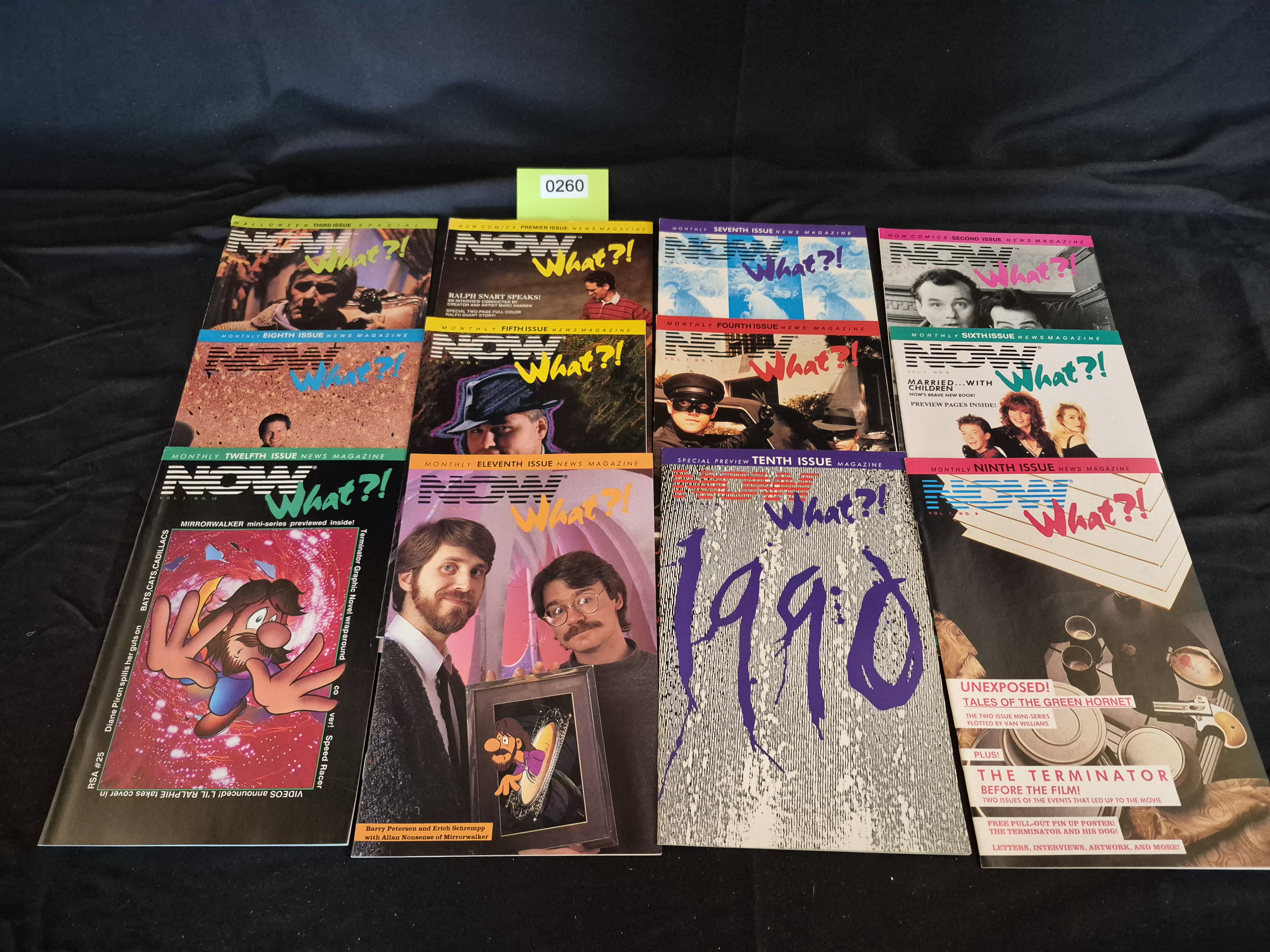BID PER WHAT YOU SEE IN THE PHOTO, NOT THE AI GENERATED TITLES AND DESCRIPTIONS! A collection of 12 vintage pop culture news magazines published under the title NOW What?! These periodicals feature glossy paper covers with vibrant, multi-color graphics typical of the late 1980s through the early 1990s, focusing on comic book news, interviews, and previews. The collection includes a near-complete run of Volume 1, ranging from the “Premier Issue” through the “Twelfth Issue.” Specific issues visible include the “Premier Issue” (Vol. 1 No. 1), the “Twelfth Issue” (Vol. 1 No. 12), and several issues in between. Special editions are also present, including one featuring a large purple “1990” graphic (Special Preview Tenth Issue) and another marked “RSA #25” (featuring Mirrorwalker). Featured content noted on the covers includes “The Terminator Before the Film,” “Tales of the Green Hornet,” and interviews regarding characters like “Ralph Snart” and “Mirrorwalker.” The magazines are bound in paper wrappers.
