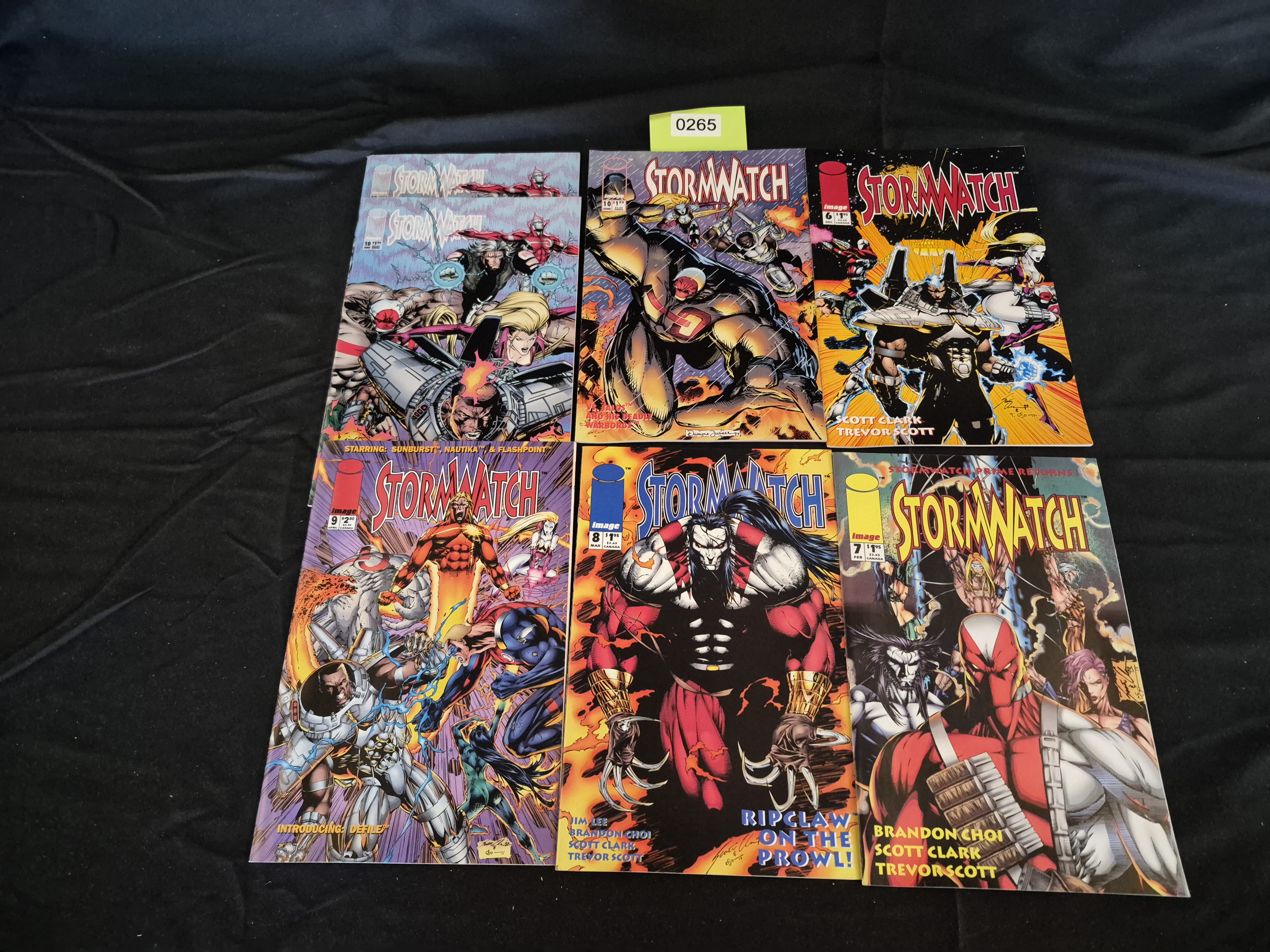 BID PER WHAT YOU SEE IN THE PHOTO, NOT THE AI GENERATED TITLES AND DESCRIPTIONS! A collection of six modern age comic books from the Image Comics/Wildstorm series Stormwatch, published in the mid-1990s. The series was created by Jim Lee and Brandon Choi. The lot includes a run of issues, specifically #6, #7, #8, #9 (two copies/variants), and #10, dating primarily from late 1994 through mid-1995. The comics are saddle-stapled and feature highly stylized, full-color cover artwork characteristic of the Wildstorm imprint during this period, showcasing various characters and action sequences. Visible credits include writers and artists such as Brandon Choi, Jim Lee, Scott Clark, and Trevor Scott. An inventory sticker marked “0265” is affixed near the top edge of one of the comics.