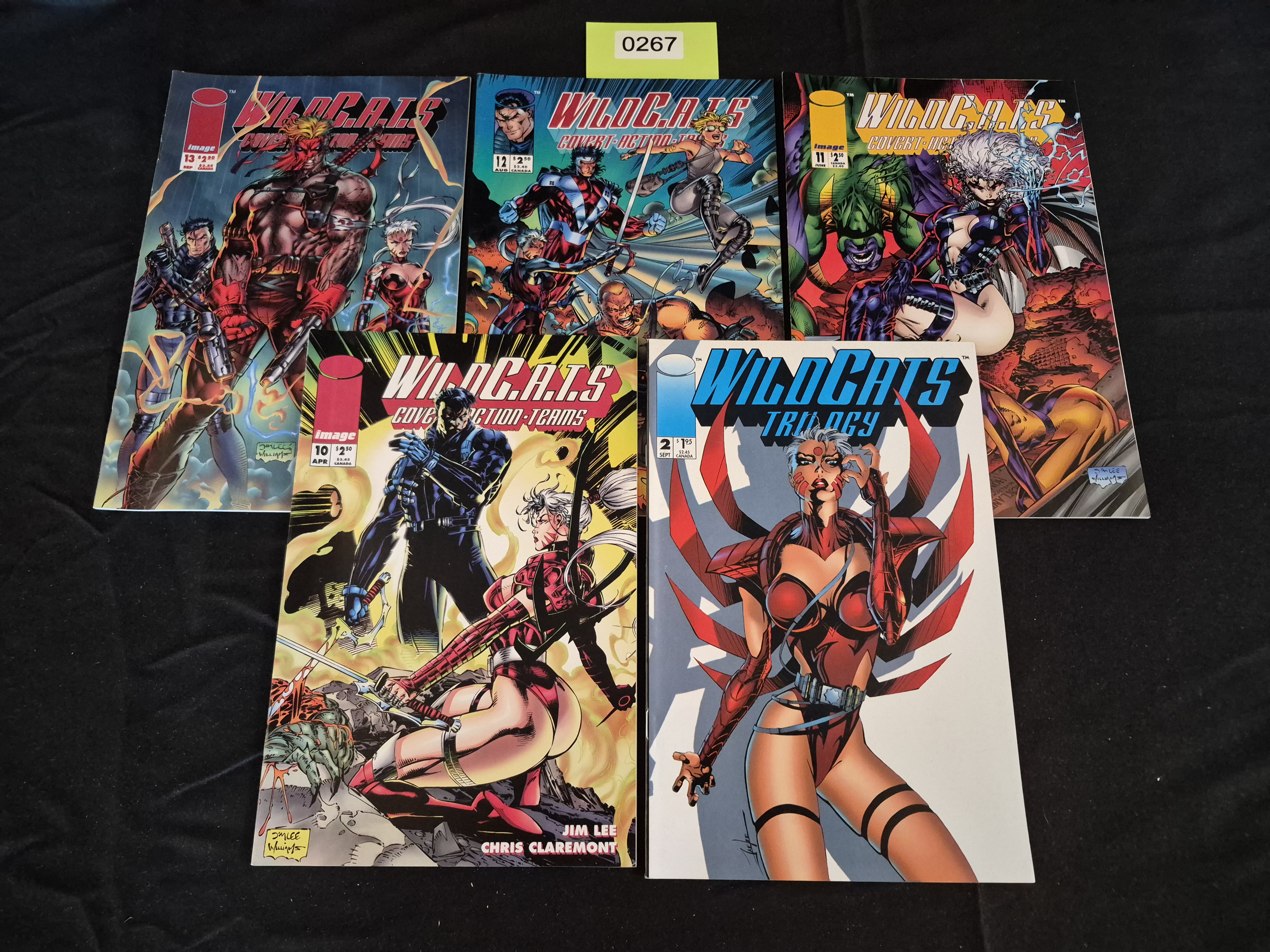 BID PER WHAT YOU SEE IN THE PHOTO, NOT THE AI GENERATED TITLES AND DESCRIPTIONS! A collection of five American comic book periodicals published by Image Comics/Wildstorm, dating to the 1990s. The lot features titles from the *WildC.A.T.S.* universe, including four issues from the main series *WildC.A.T.S. Covert Action Teams* (Issues #10, #11, #12, and #13) and one issue of the spin-off series *WildC.A.T.S. Trilogy* (Issue #2). The items are standard paper/cardstock periodicals, published under the Image Comics imprint. Market research indicates that *WildC.A.T.S. Covert Action Teams* Issue #10 is notable for the first appearance of the character Huntsman. The covers feature bold, colorful superhero artwork characteristic of the era, with visible creator credits including Jim Lee and Chris Claremont.