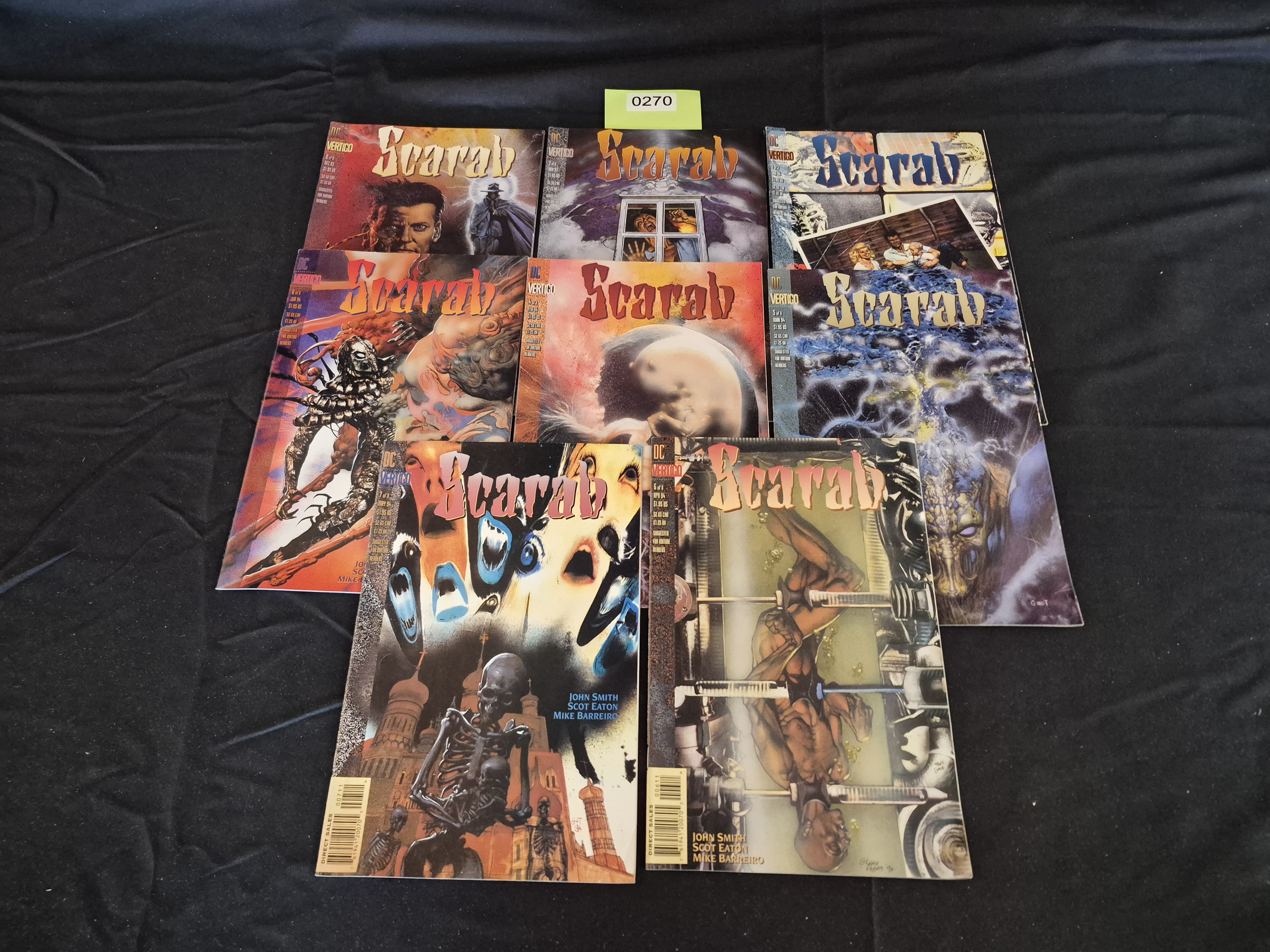 BID PER WHAT YOU SEE IN THE PHOTO, NOT THE AI GENERATED TITLES AND DESCRIPTIONS! A collection of nine comic book periodicals from the DC Comics Vertigo imprint, comprising the complete 8-issue limited series Scarab (1993-1994) plus one duplicate issue (Issue #6). The series features writing by John Smith and art by Scot Eaton and Mike Barreiro. The magazines utilize cardstock covers and standard comic paper interiors, characteristic of the Vertigo line of the era. The covers feature stylized horror and dark fantasy themes, including depictions of skeletons, demonic figures, and macabre portraits. Visible dates range from November 1993 through June 1994. An inventory sticker marked 0270 is visible in the upper center of the grouping.