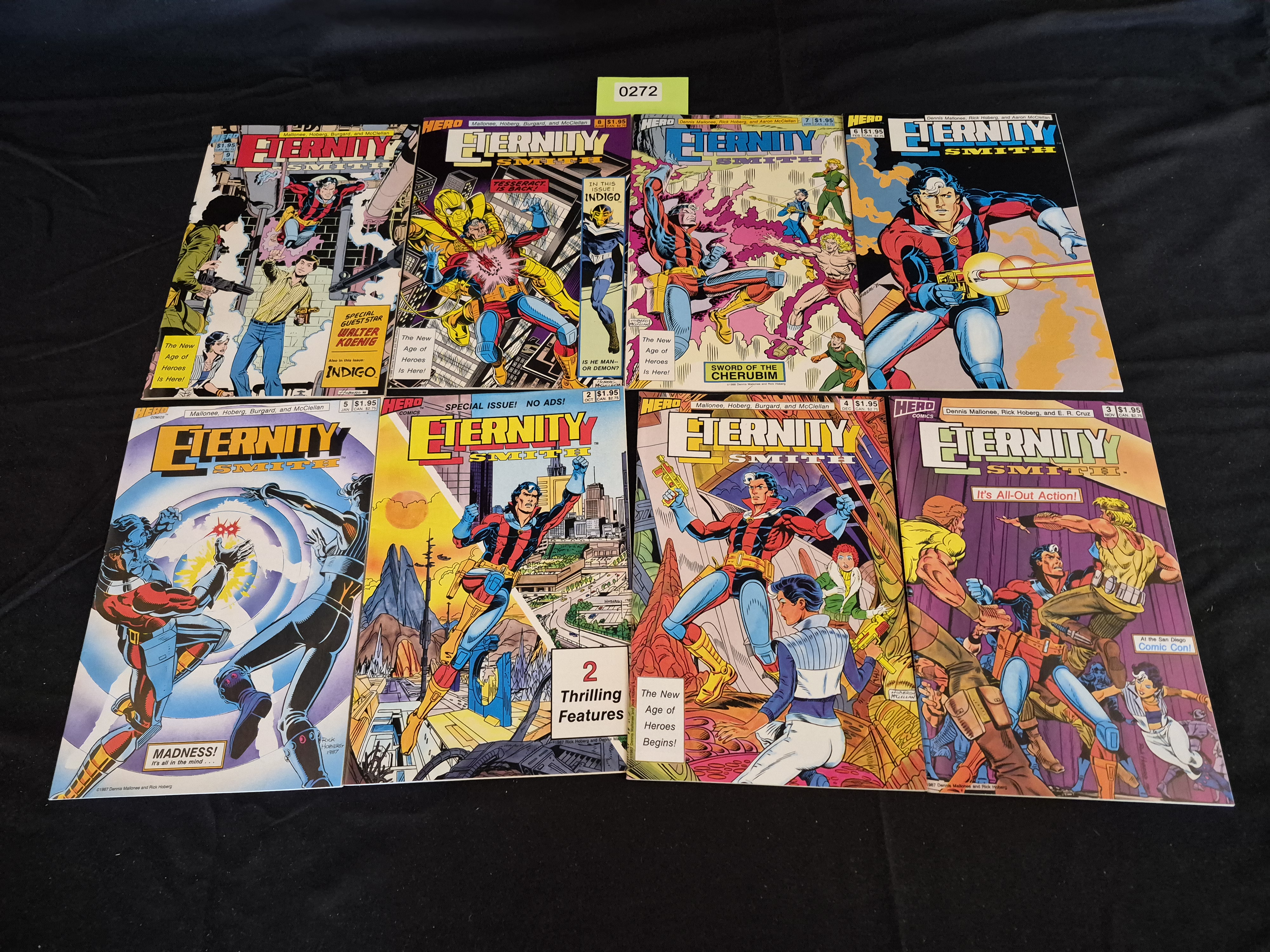 BID PER WHAT YOU SEE IN THE PHOTO, NOT THE AI GENERATED TITLES AND DESCRIPTIONS! A collection of 10 individual comic books from the Eternity Smith series published by Hero Comics, dating primarily from 1987. The lot contains the complete run of the series, issues 1 through 9, plus one duplicate copy of Issue 5, totaling 10 physical items. These are independent comics featuring full-color artwork typical of the late 1980s and early 1990s. The comics are constructed of paper and cardstock. The covers display action scenes featuring the titular character, Eternity Smith. Creator credits visible on the covers include Dennis Mallonee and Rick Hoberg. The comics bear the publisher logo HERO Comics and a standard pricing of $1.95 per issue. An inventory sticker labeled 0272 is visible near the top center of the display.