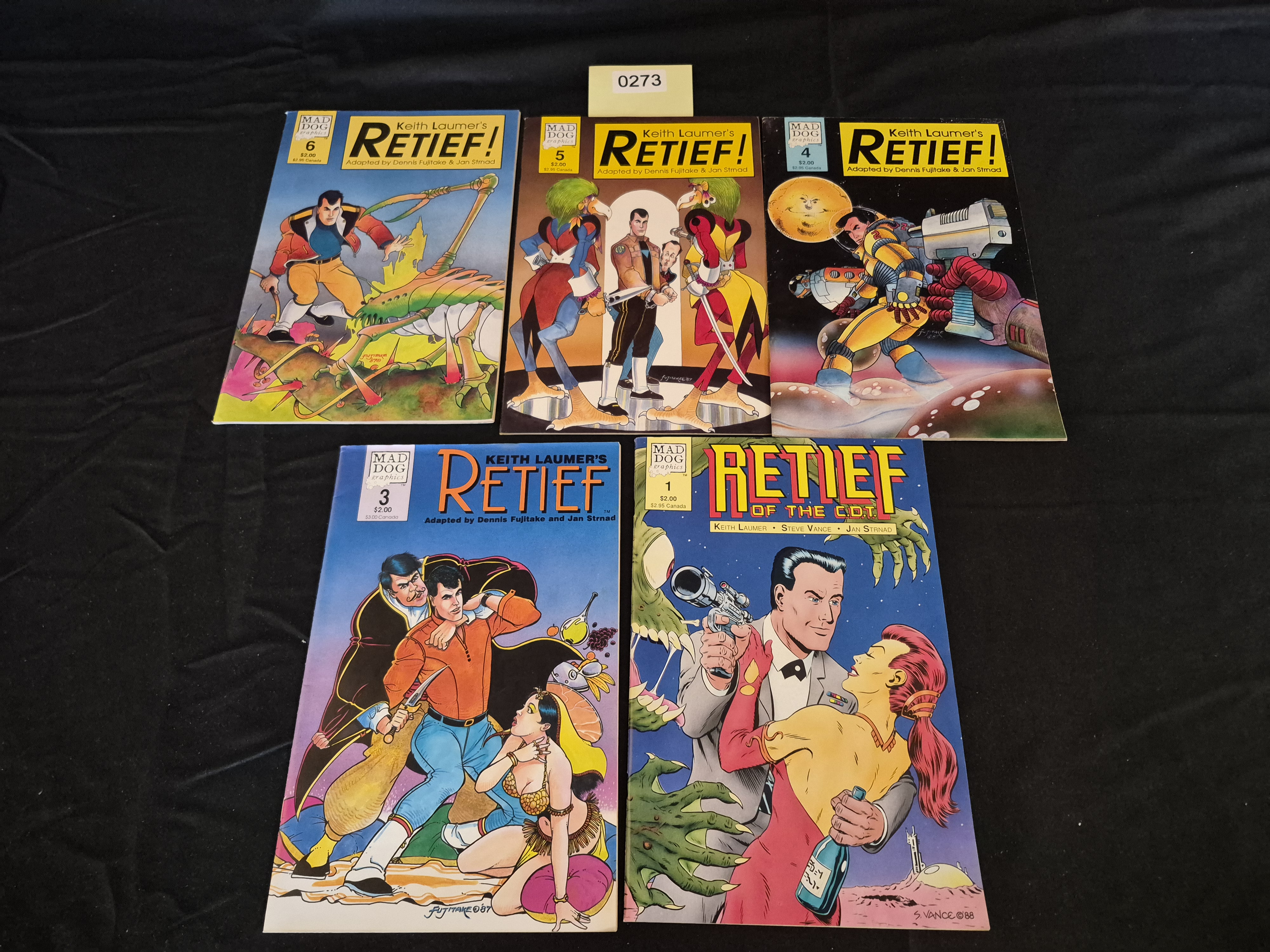 BID PER WHAT YOU SEE IN THE PHOTO, NOT THE AI GENERATED TITLES AND DESCRIPTIONS! A collection of five (5) American science fiction comic books from the series “Keith Laumer’s Retief!” or “Retief of the C.D.T.”, published by Mad Dog Graphics. The lot includes issues #1, #3, #4, #5, and #6. These comics are adaptations of Keith Laumer’s work, featuring contributions from creators including Dennis Fujitake, Jan Strnad, and Steve Vance. The covers display vibrant, pulp-style illustrations depicting the protagonist, Jame Retief, in action against alien or exotic backgrounds. Visible artist signatures suggest a publication period around 1987-1988. Each issue displays a cover price of $2.00 ($2.95 Canada).