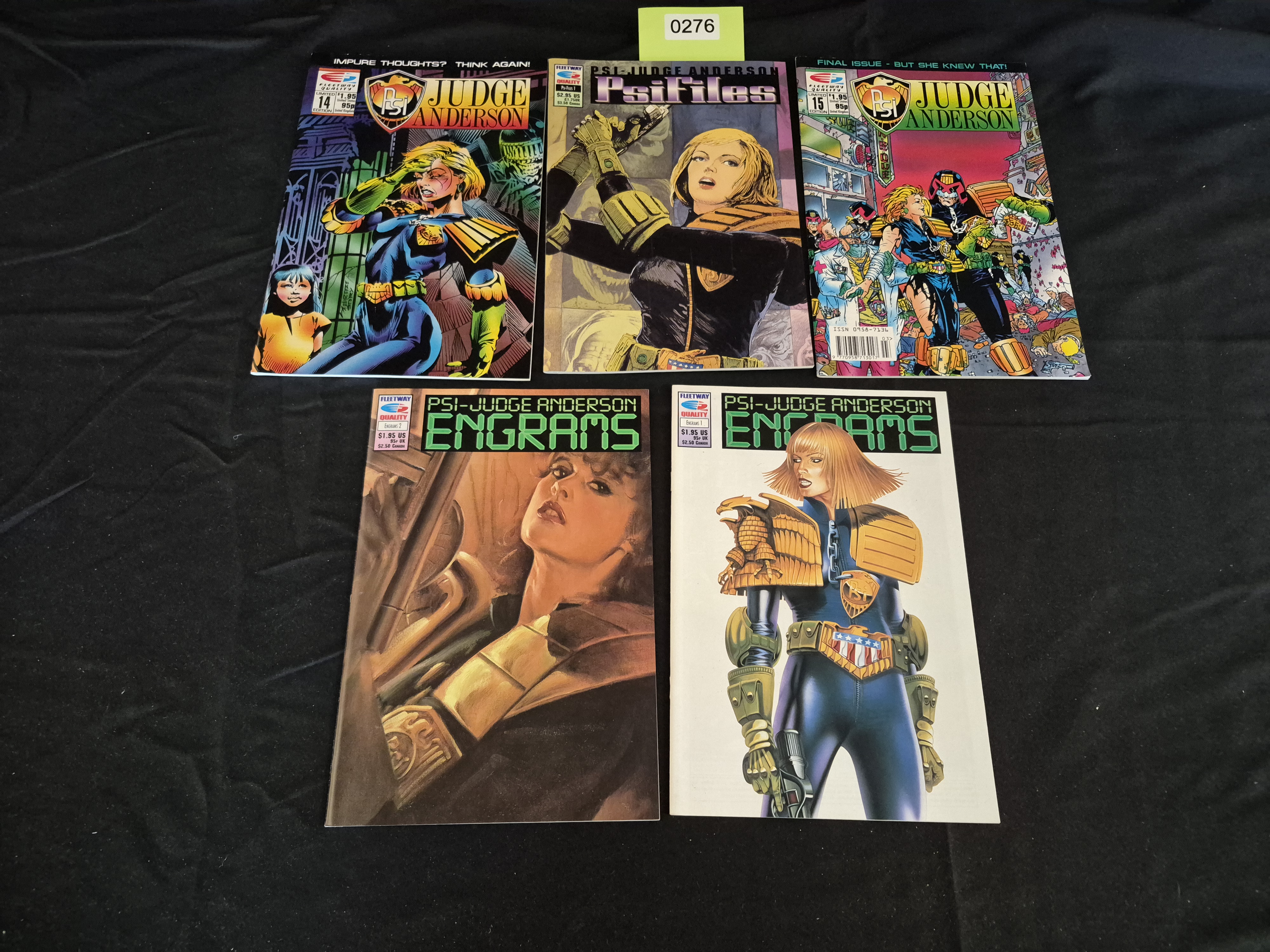 BID PER WHAT YOU SEE IN THE PHOTO, NOT THE AI GENERATED TITLES AND DESCRIPTIONS! A collection of 5 modern comic book periodicals published by Fleetway Quality centered around the character PSI-Judge Anderson. The lot includes the complete two-issue mini-series PSI-Judge Anderson: Engrams (#1 and #2), both featuring painted cover art. Also included are PSI-Judge Anderson issues #14 and #15 (labeled "Final Issue"), and Psi-Files #1. The periodicals are constructed of paper, featuring full-color covers and interior pages. Visible cover pricing details include $1.95 US, 95p UK, and $2.50 Canada.