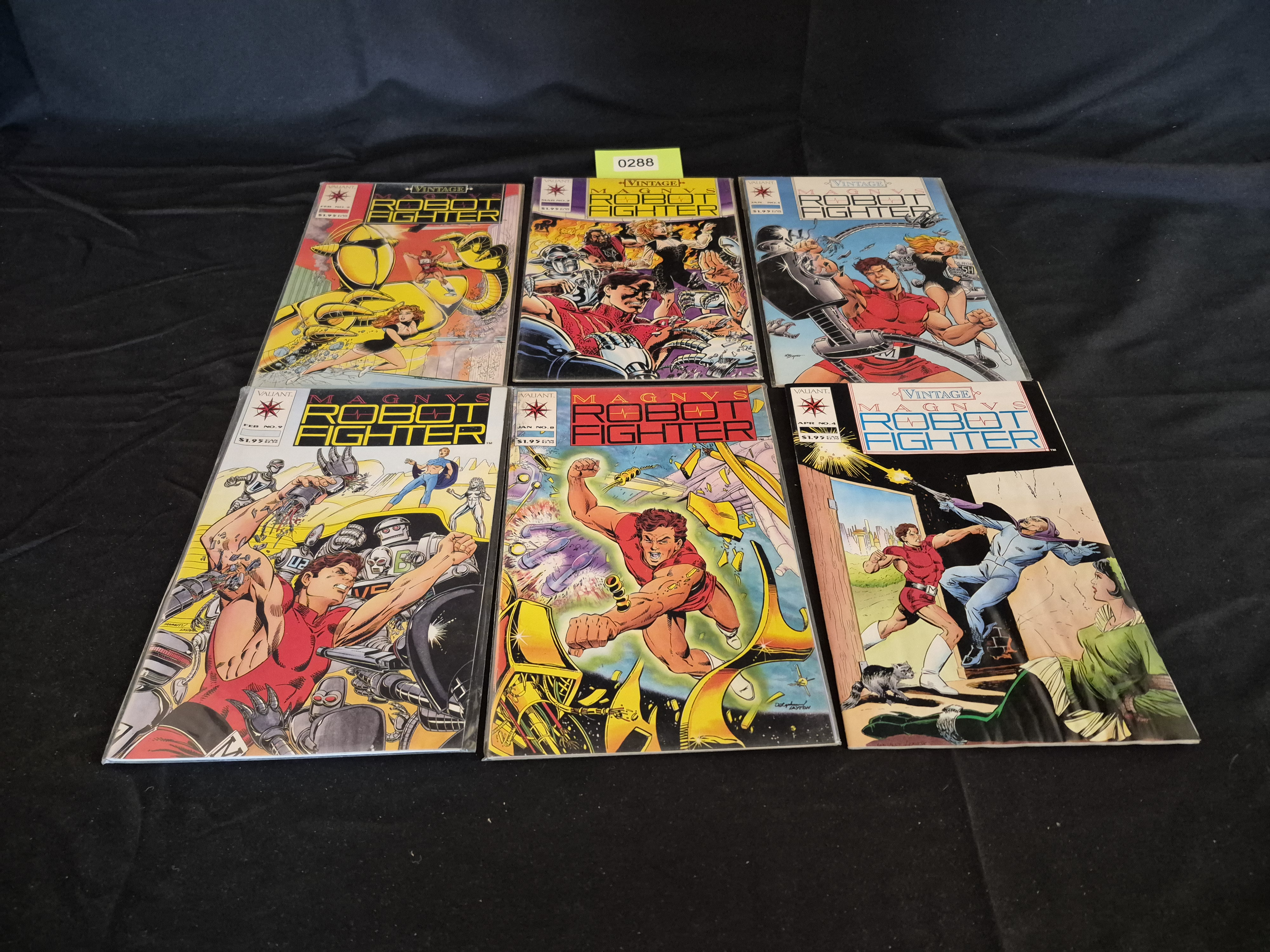 BID PER WHAT YOU SEE IN THE PHOTO, NOT THE AI GENERATED TITLES AND DESCRIPTIONS! The collection consists of six non-sequential issues of the Valiant Comics title Magnus Robot Fighter, published circa 1991-1992. The comics feature dynamic, colorful cover art typical of the early 1990s comic book aesthetic, depicting the titular hero in combat with robots. Each issue bears the Valiant star logo and a stated cover price of $1.95. Visible issue numbers include No. 2, No. 4, No. 8, and No. 9, confirming an assortment of issues from the series. The comics are individually protected in clear plastic sleeves or bags. One protective sleeve in the top row bears a yellow inventory sticker marked 0288.